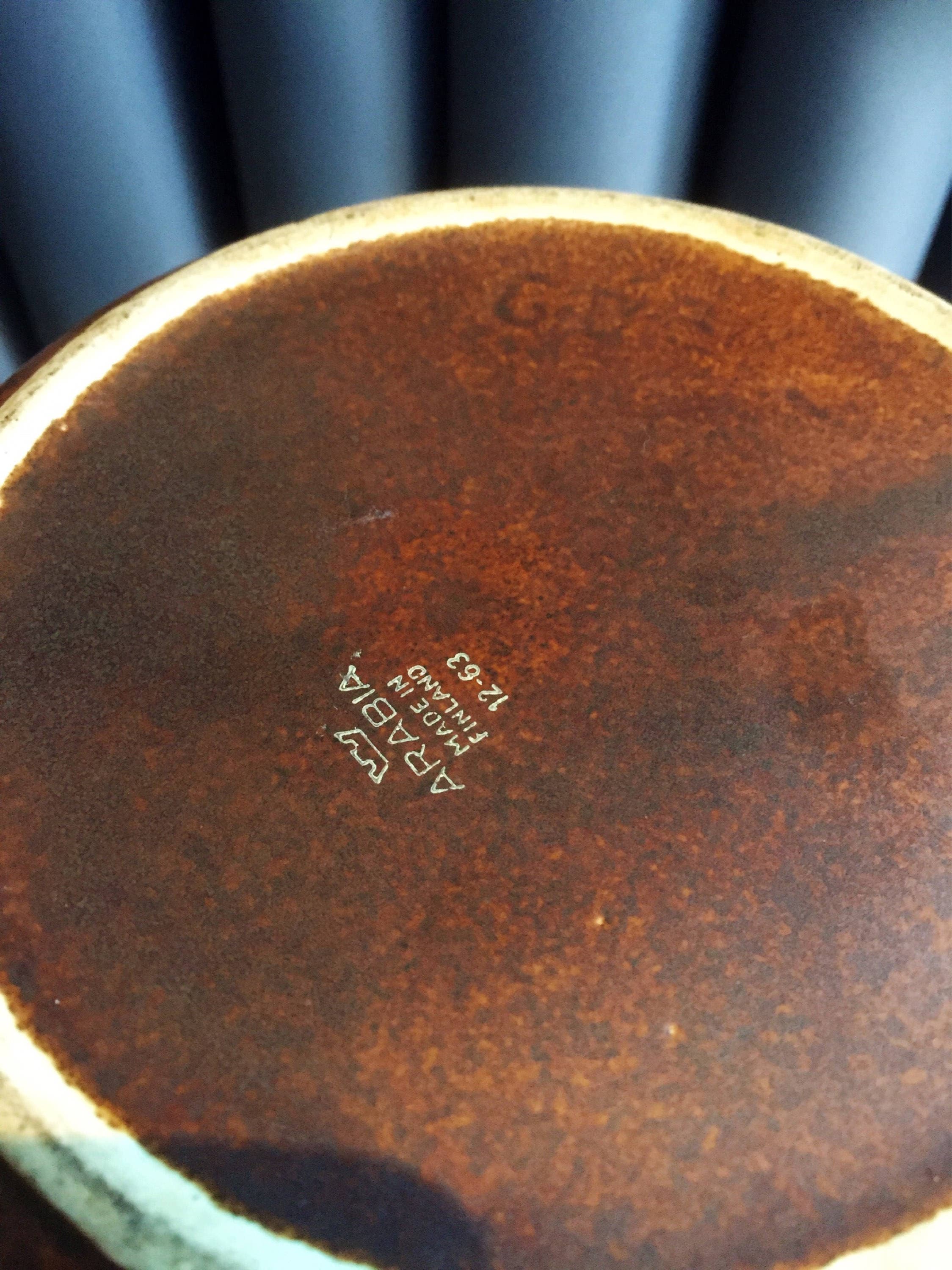 The embossed circle pattern is covered by a matte brown glaze. This is a great piece of Scandinavian pottery and will add to a cost atmosphere in your home.