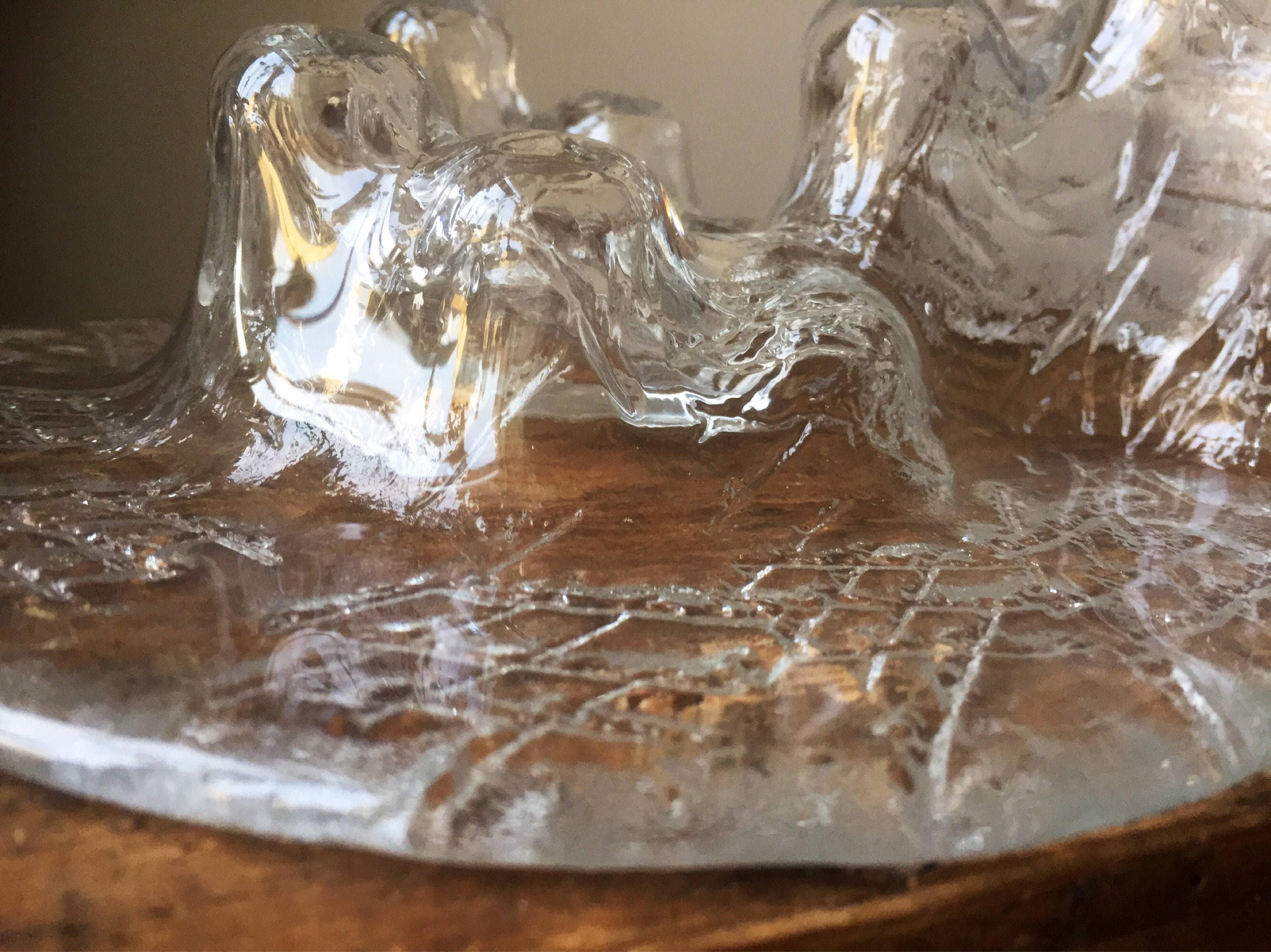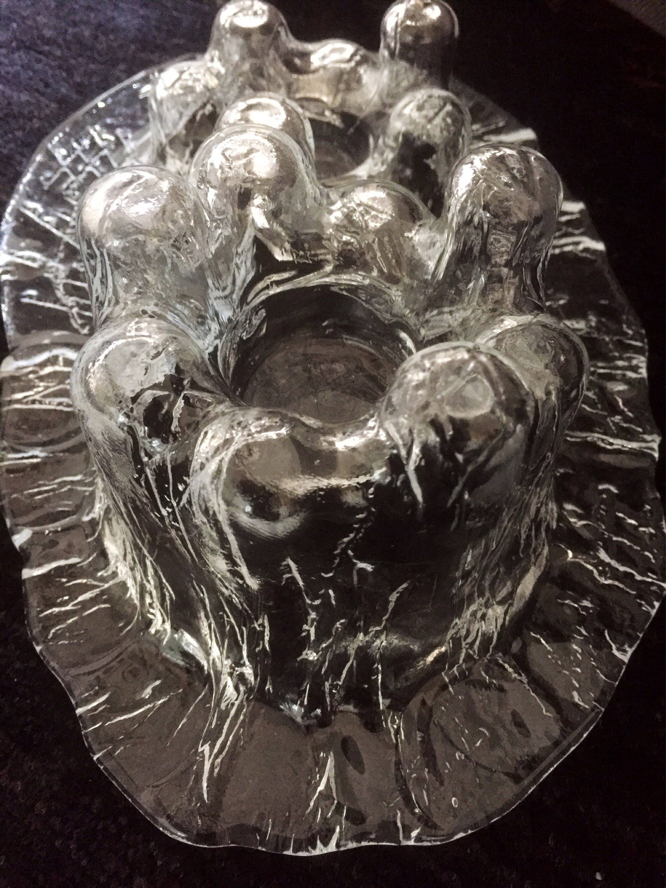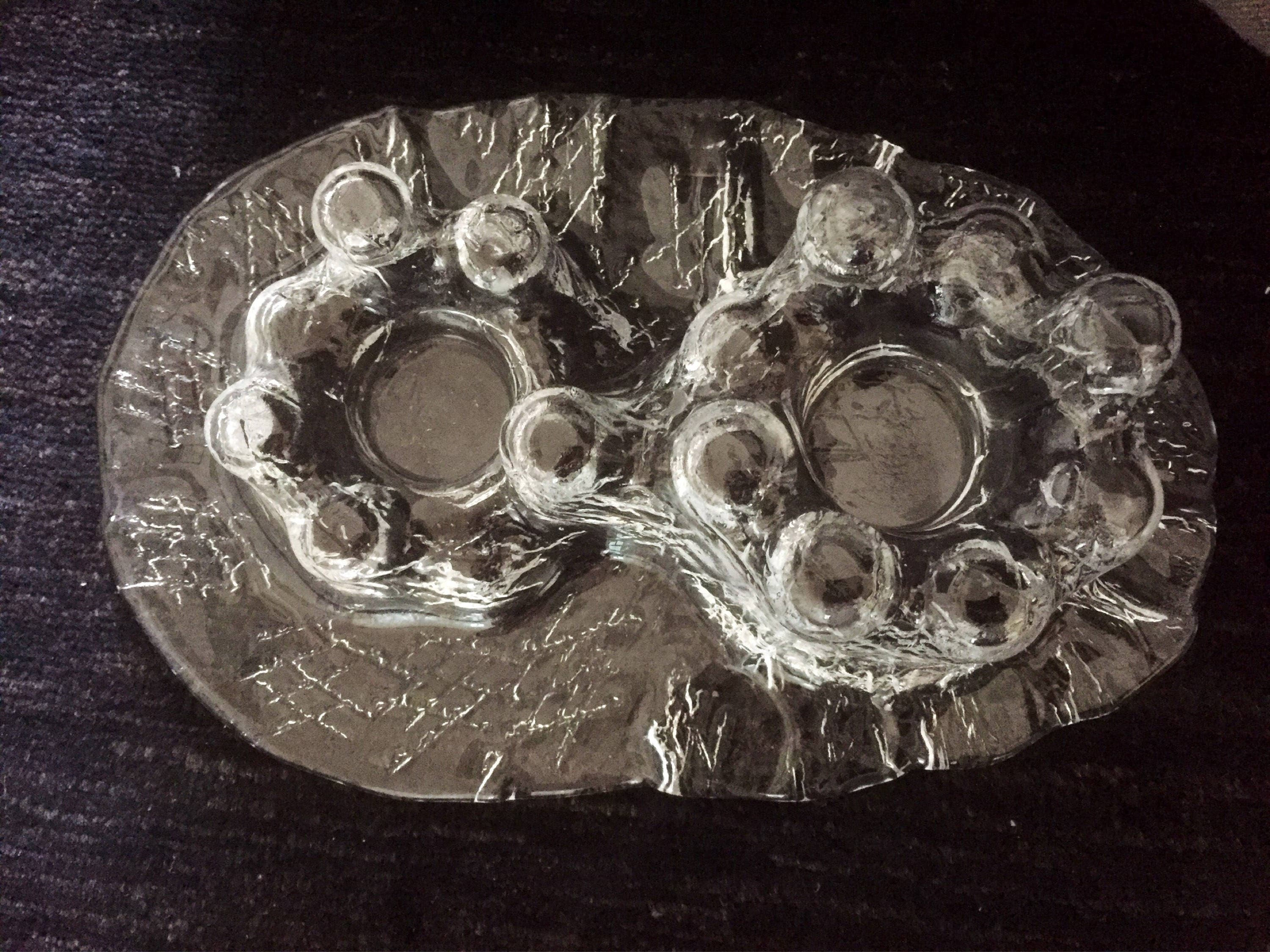 This is a Finnish crystal votive holder from the "Castello" series cast designed by Hannu Kalliola, intended to resemble a pool of natural ice. Holds two votive candles, and has original Muurla, Finland sticker attached.
