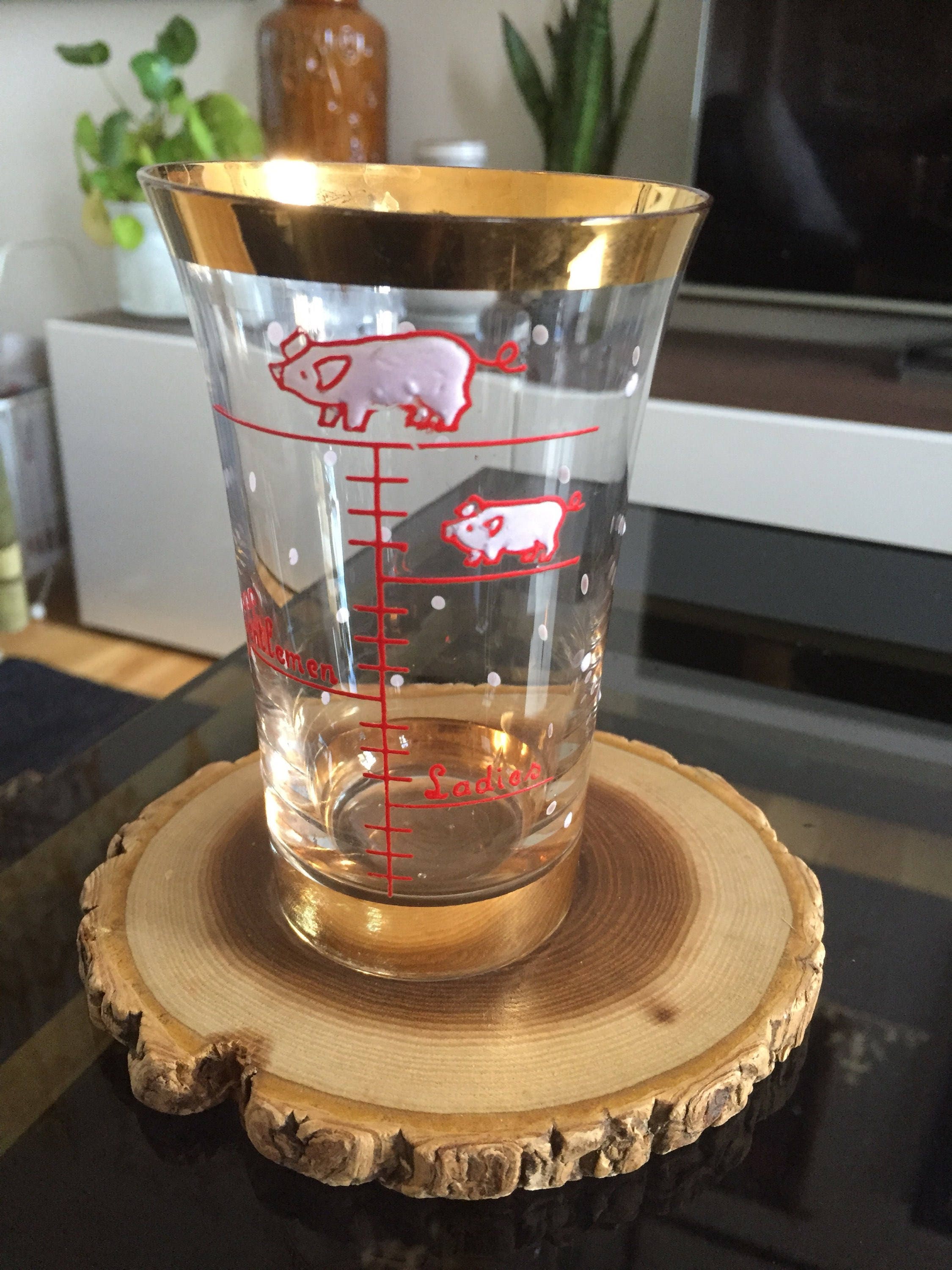 This is a pair of hand painted hand blown midcentury mixed drink glasses. They feature the "measurements" for a men's mixed drink as well as a ladies' with decors pigs and snowflakes. There is a thick gold strip around the rim and base of the glass.