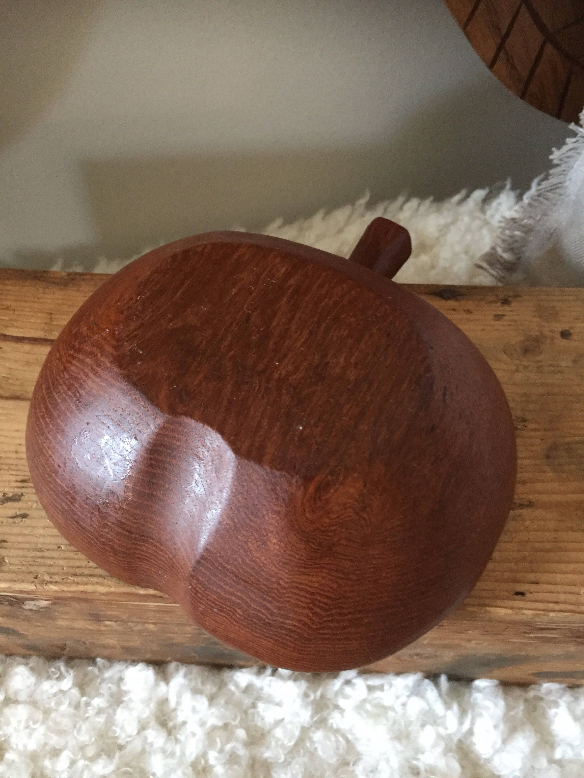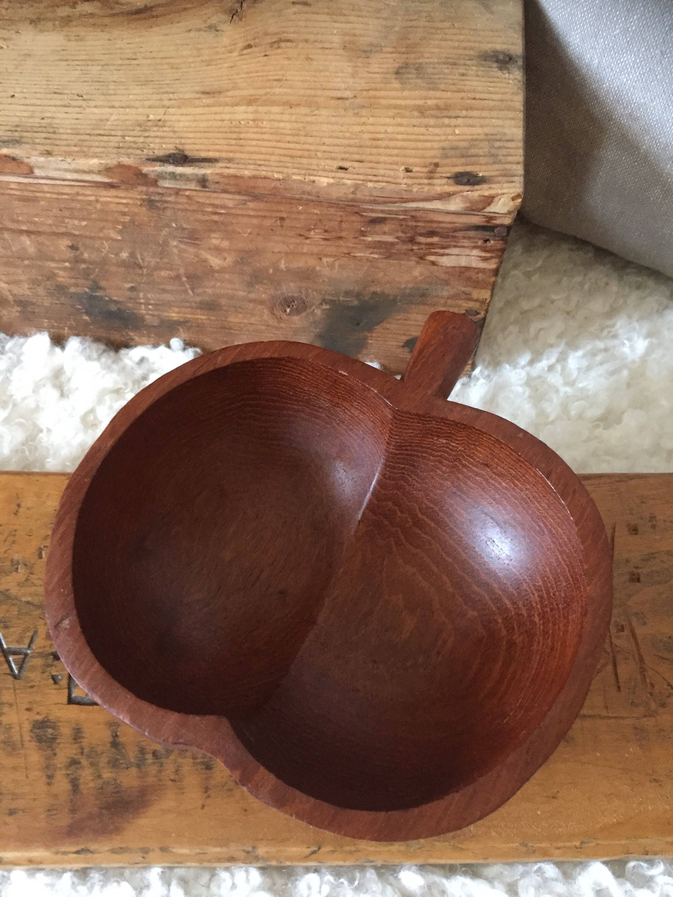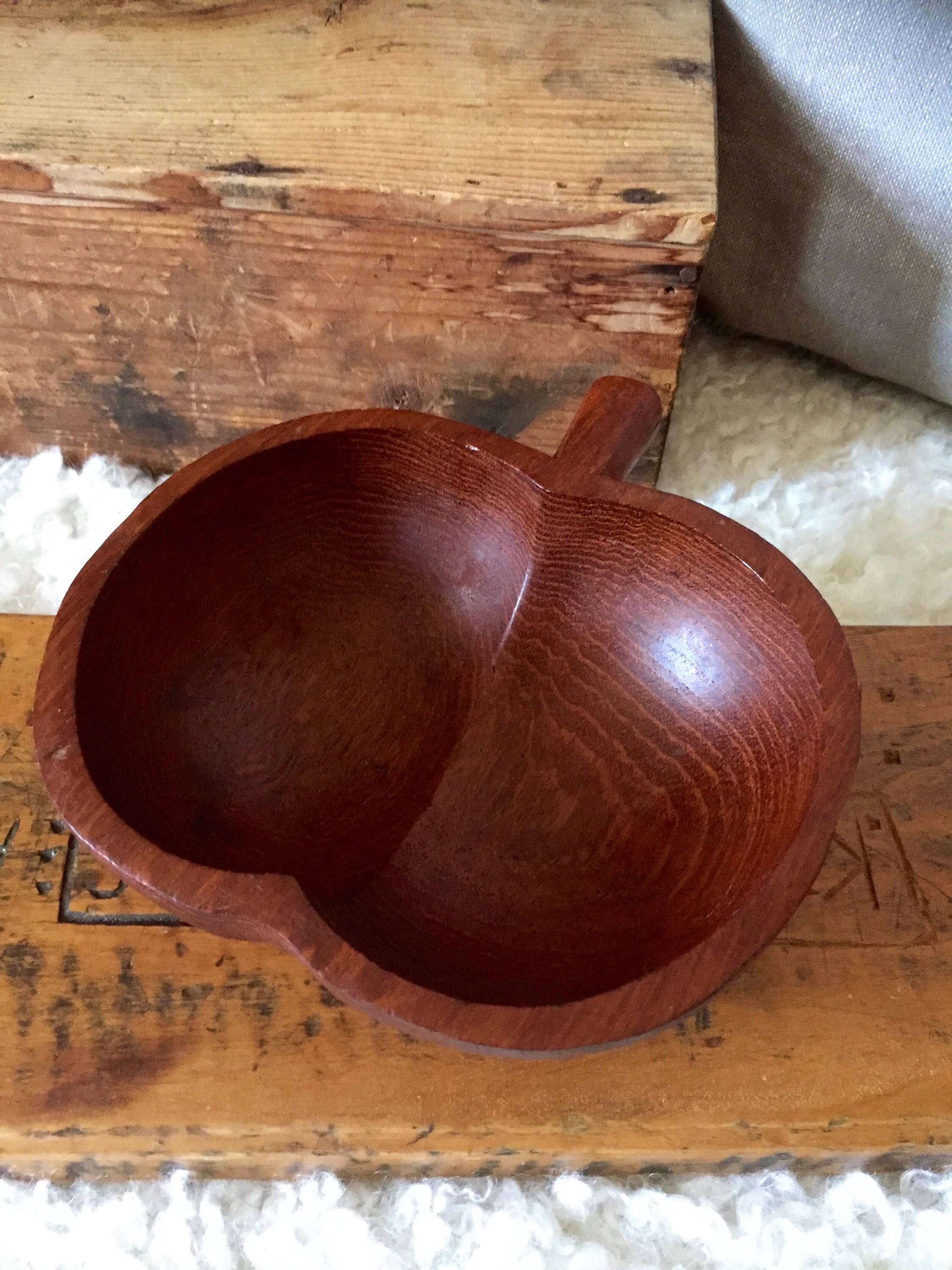 This is a vintage handmade wooden bowl Shaped as an apple.