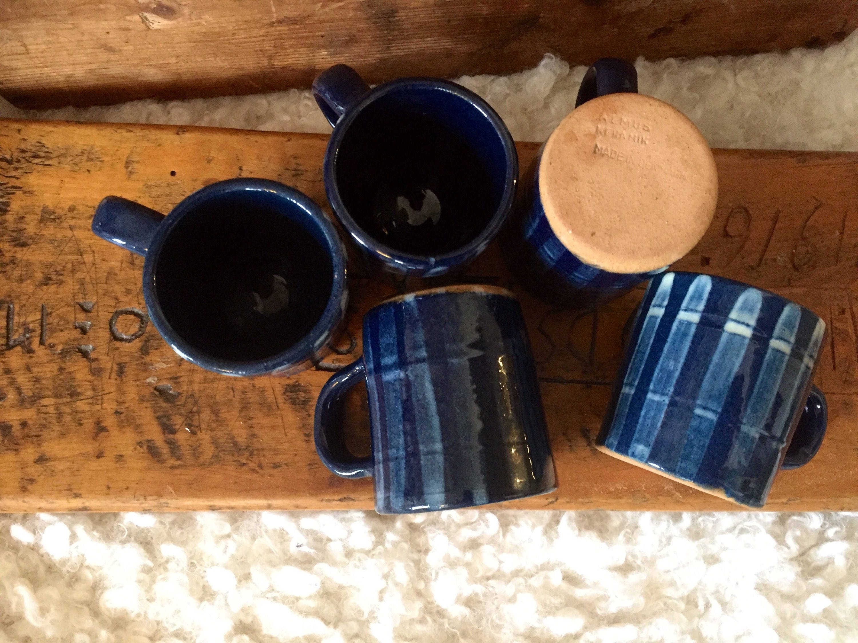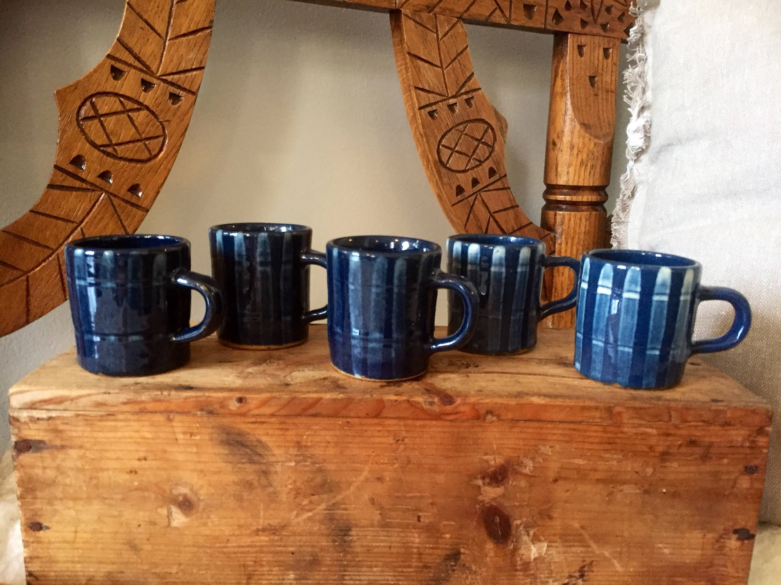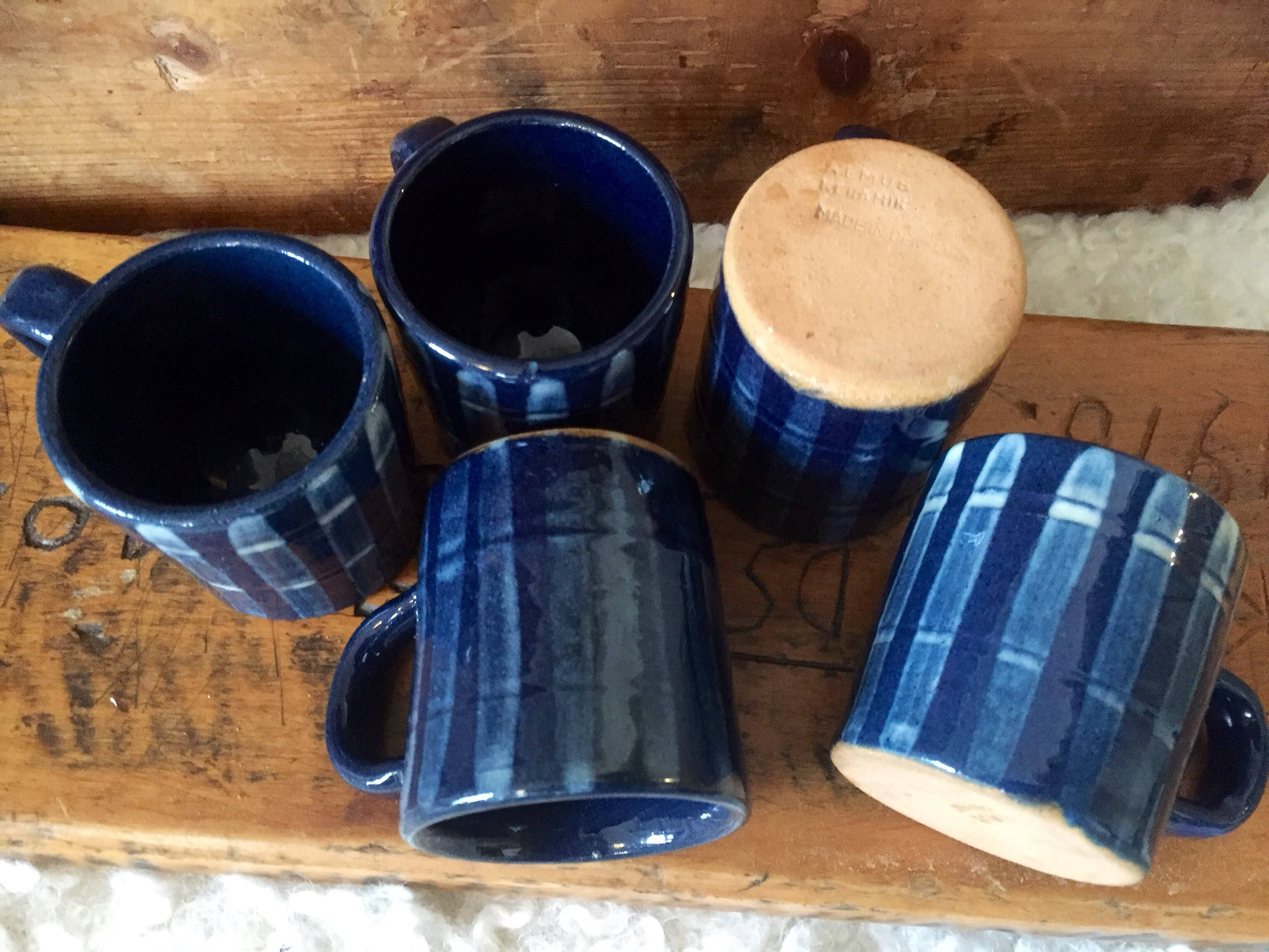 This is a set of older 5 Danish pottery cups from the Almus company of Denmark. They are from the 1930s