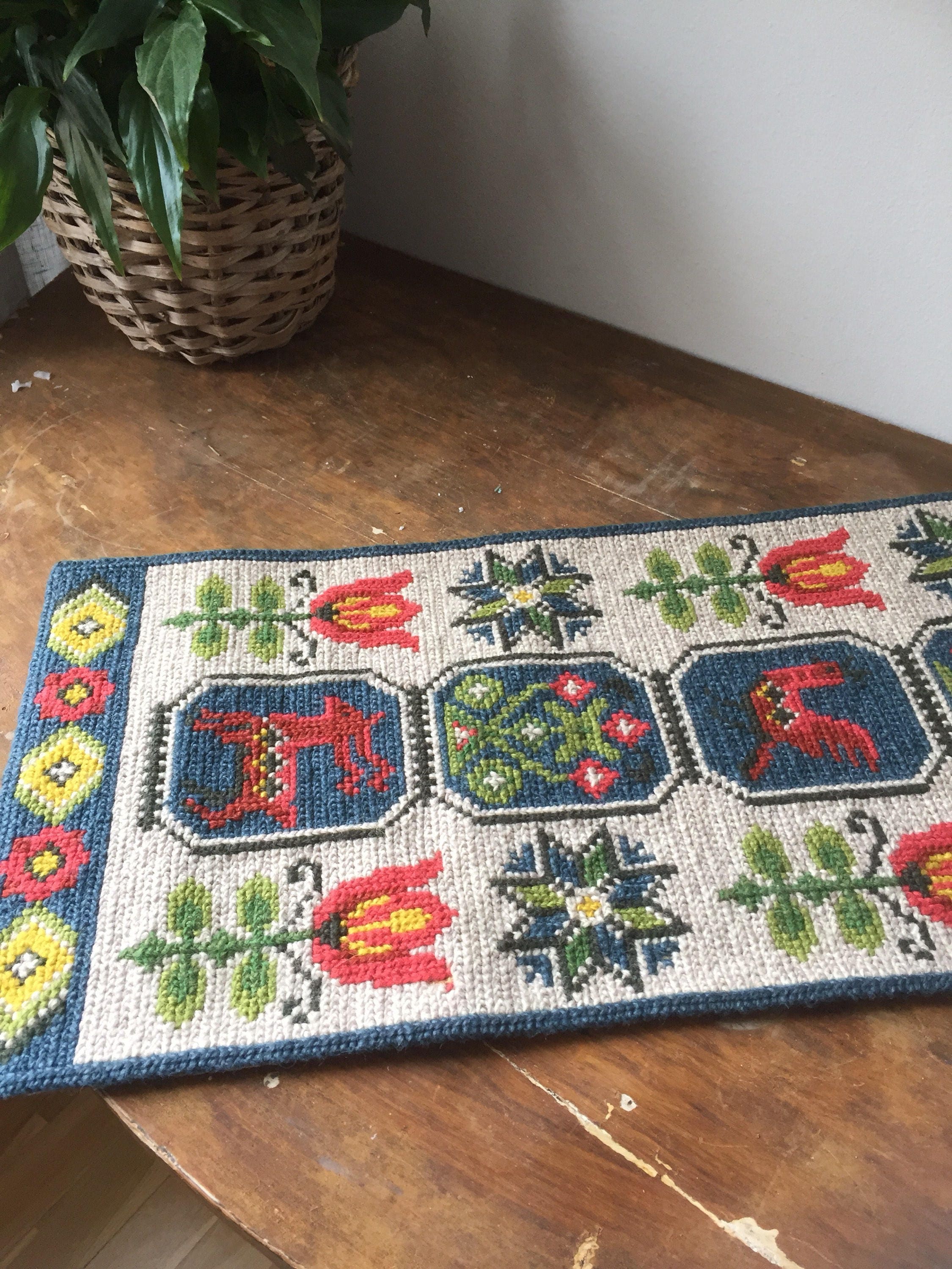 This is a beautiful Scandinavian folk art twist stitch wall hanging with a traditional Swedish design.