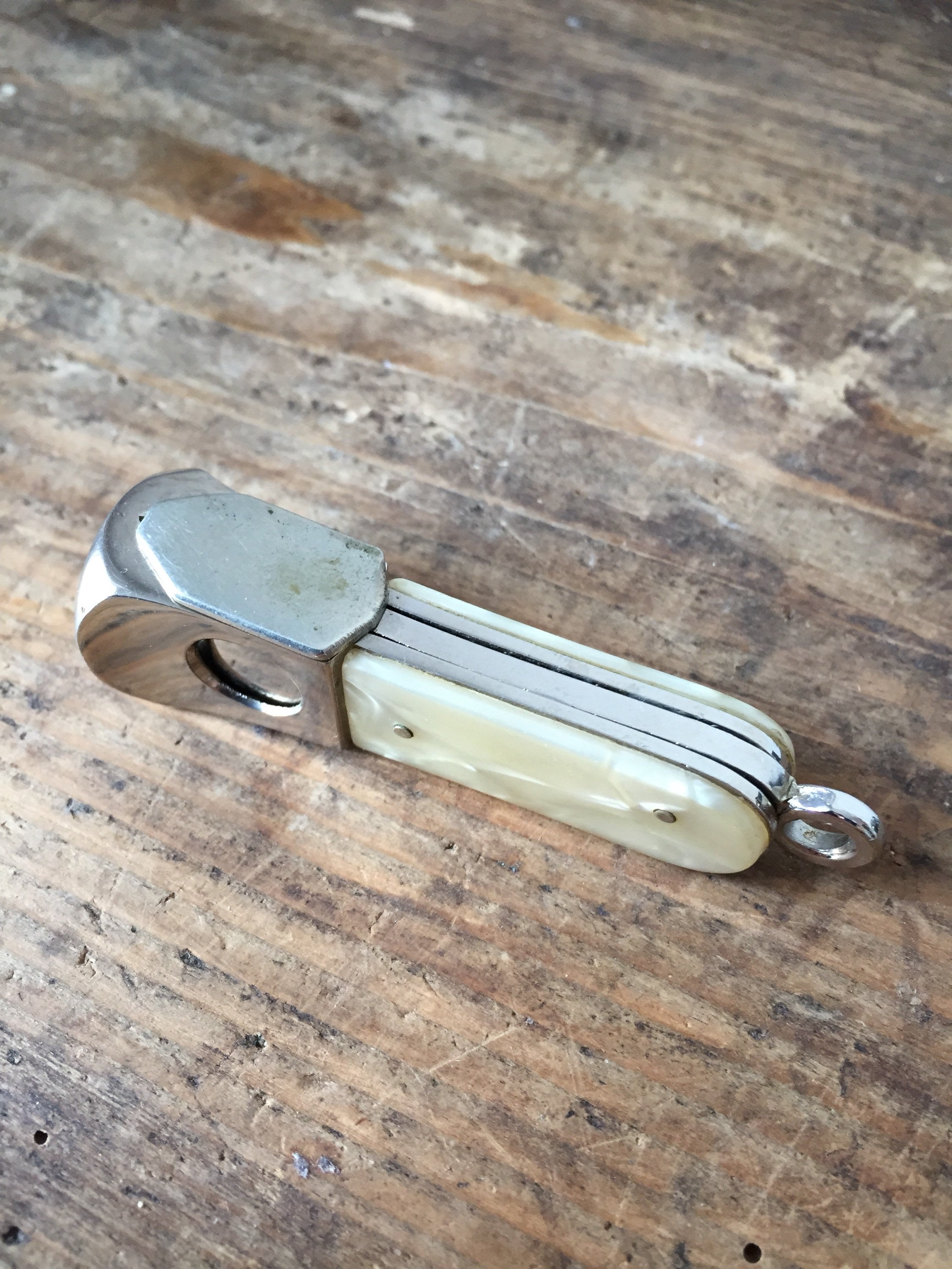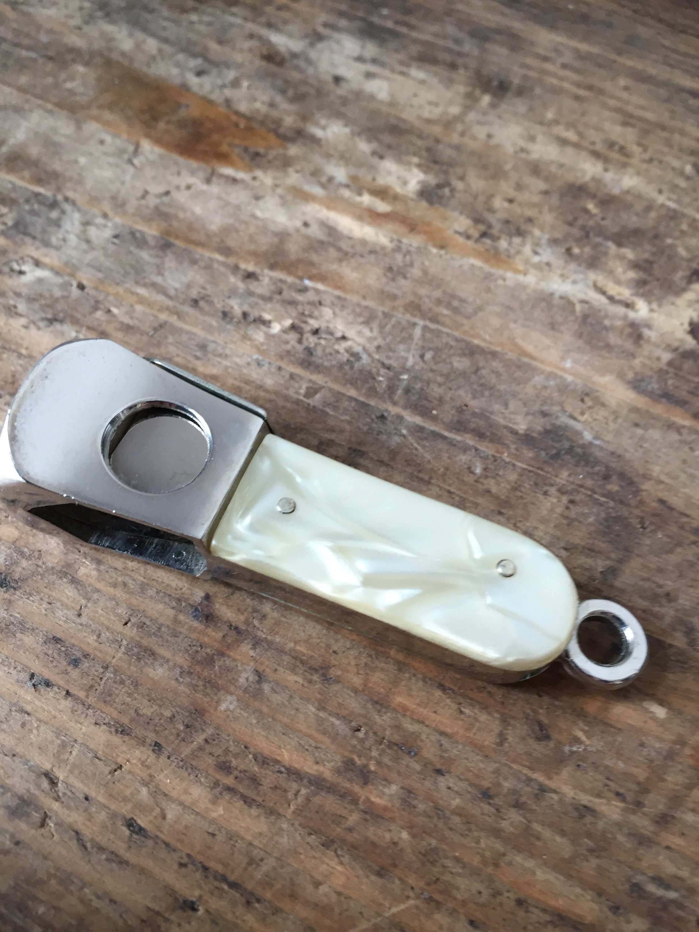 This is a beautiful vintage mother of pearl Donatus Solingen pocket cigar cutter, made in Germany. It has a small ring allowing you to attach it to a keychain or hang it from a hook. Its mother in pearl handle is stunning with no cracks, stains or damage. The rest of the cutter is stainless steel and has the makers stamp on the side of the lever.