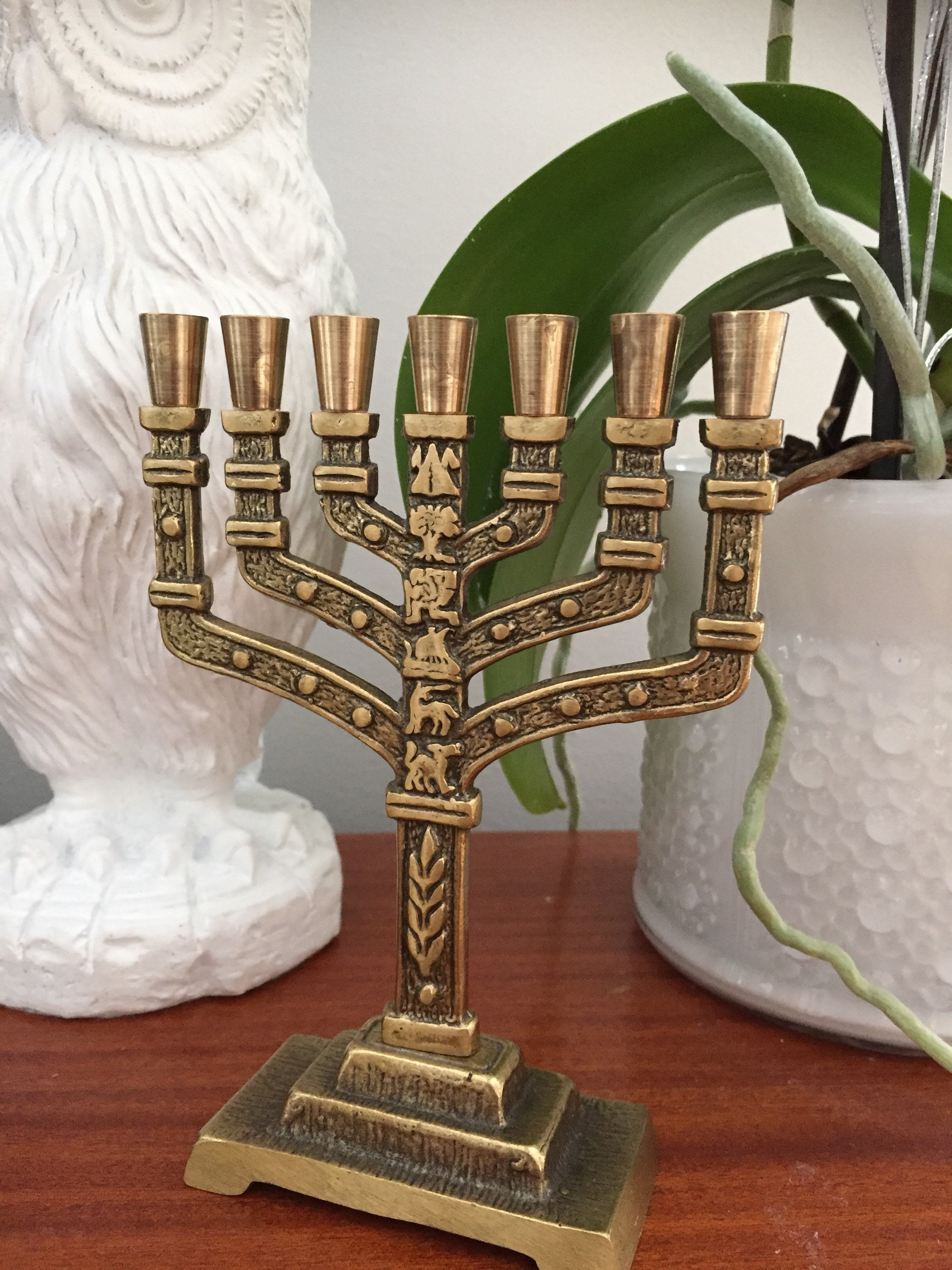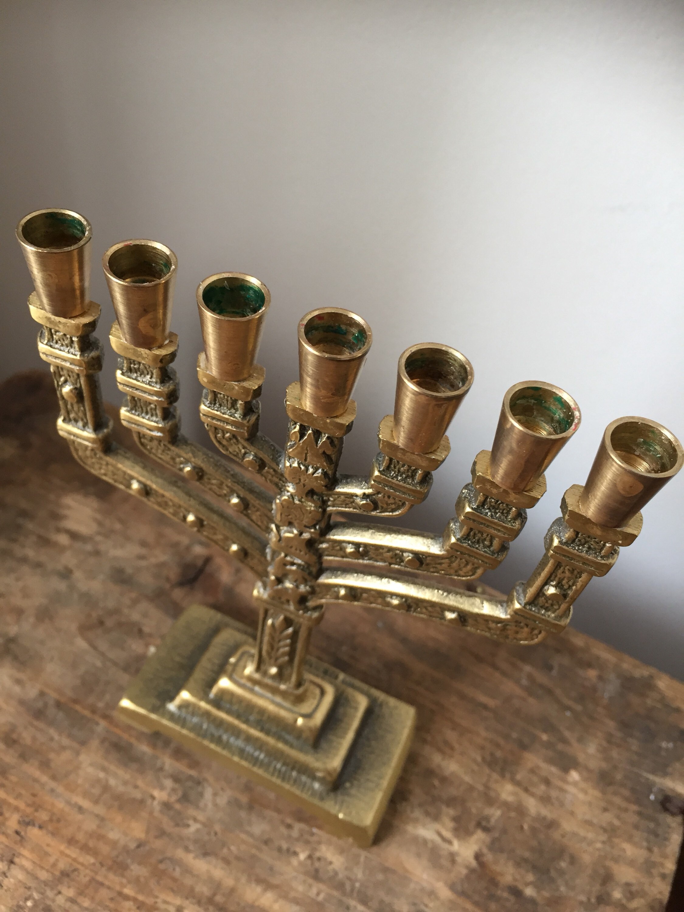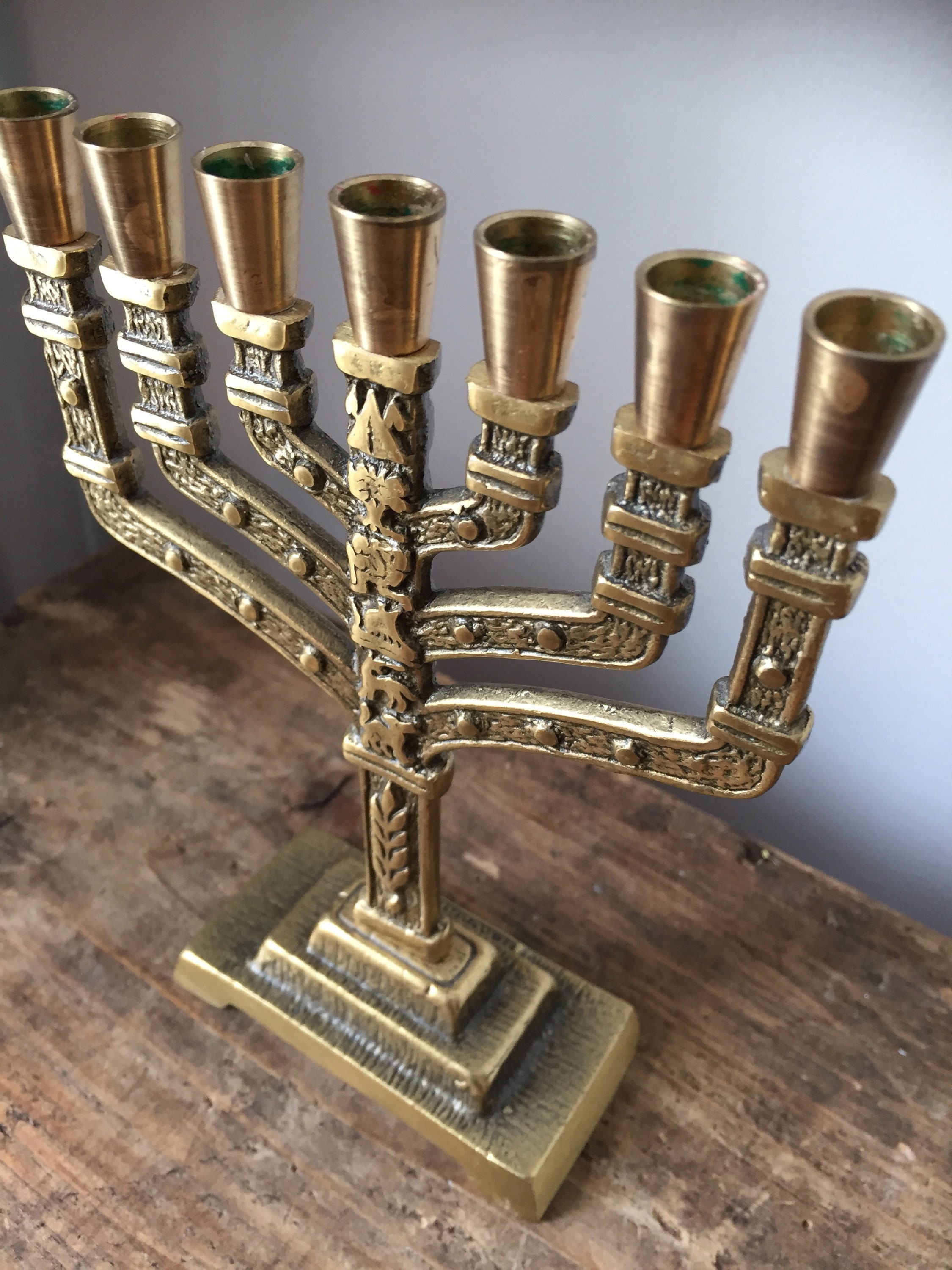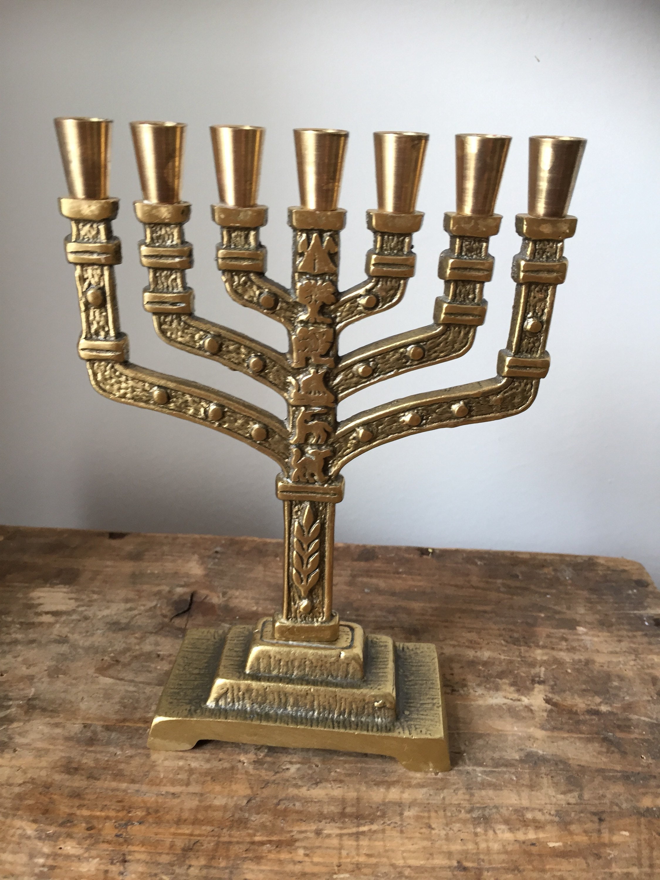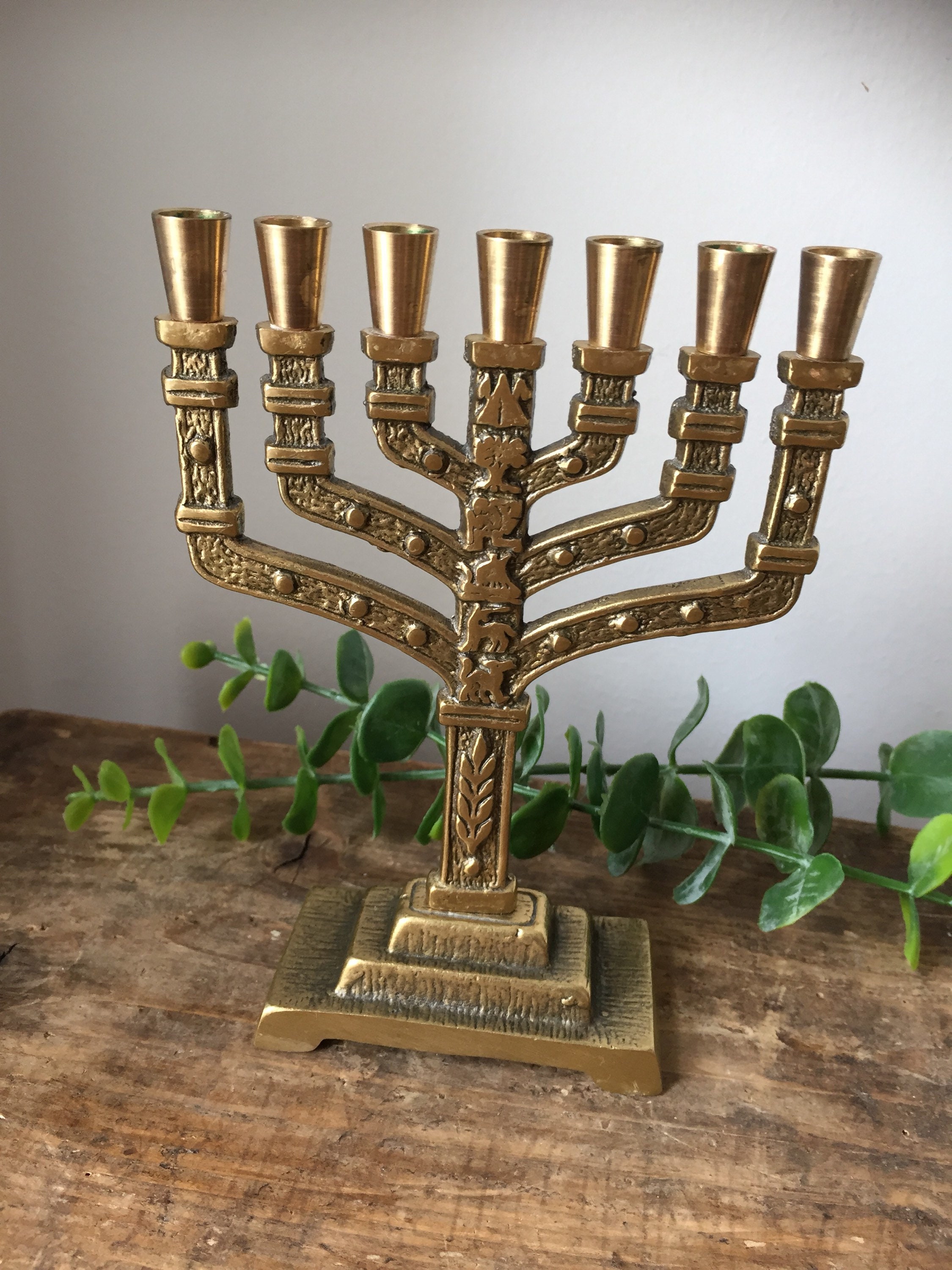 This is a vintage solid brass menorah from Israel with beautiful intricate detail on both sides. In excellent vintage condition with a lovely patina. It is a smaller size and therefore will be more versatile when placing it in your home.