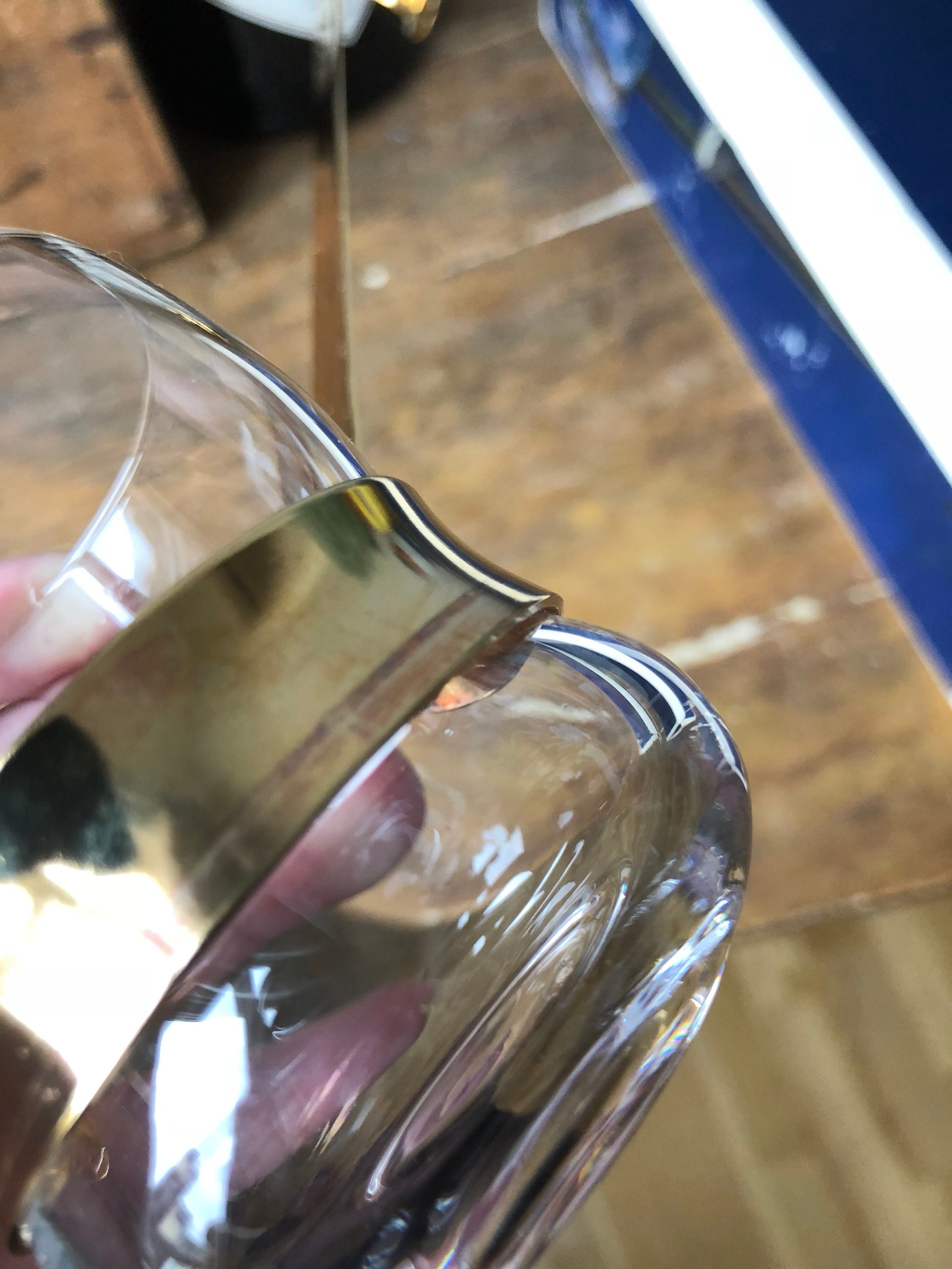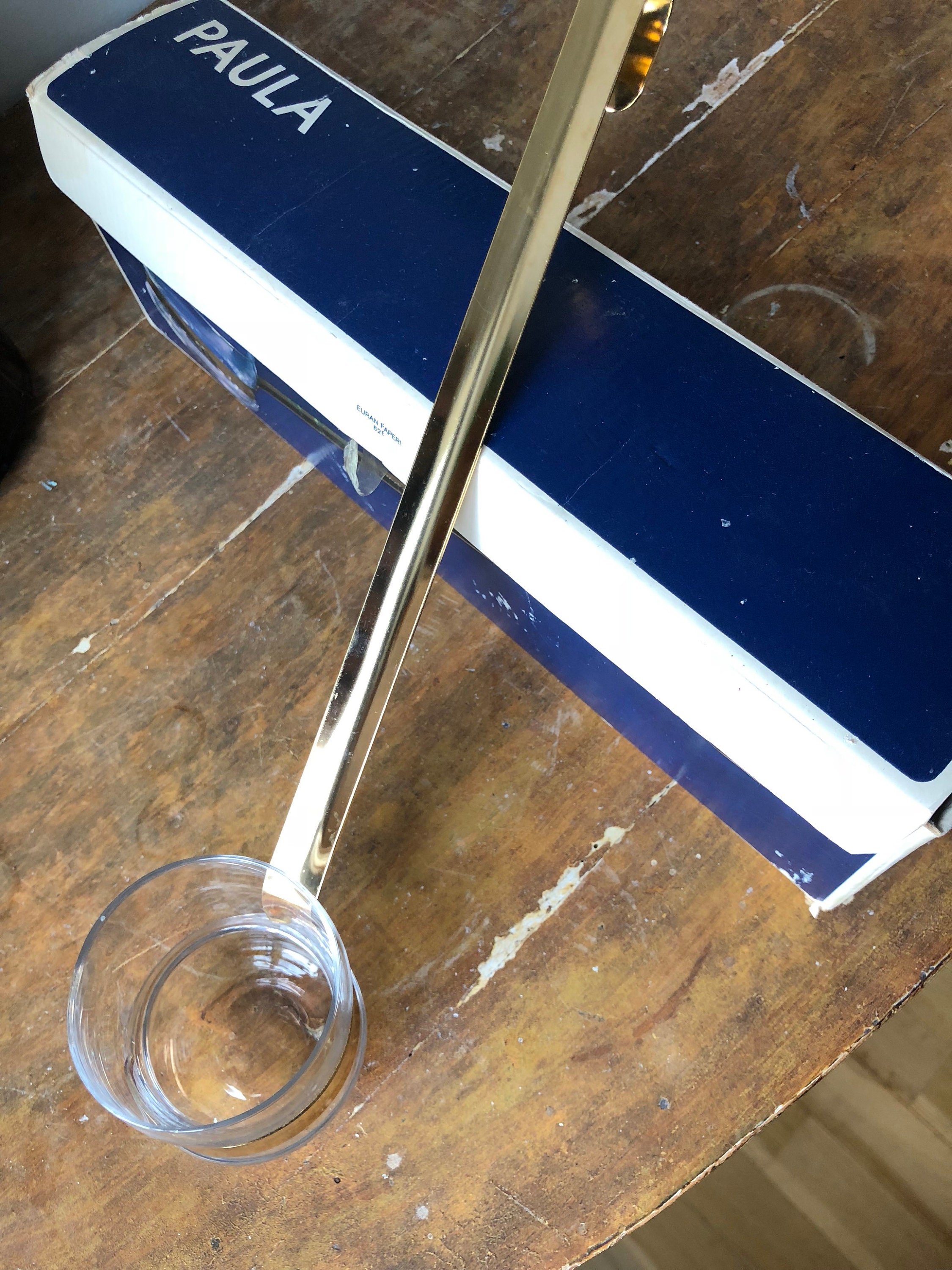 This is a vintage Iittala glass and gold ladle from the Paula series perfect for glögg, mulled wine or punch designed by Jorma Vennola Finland.