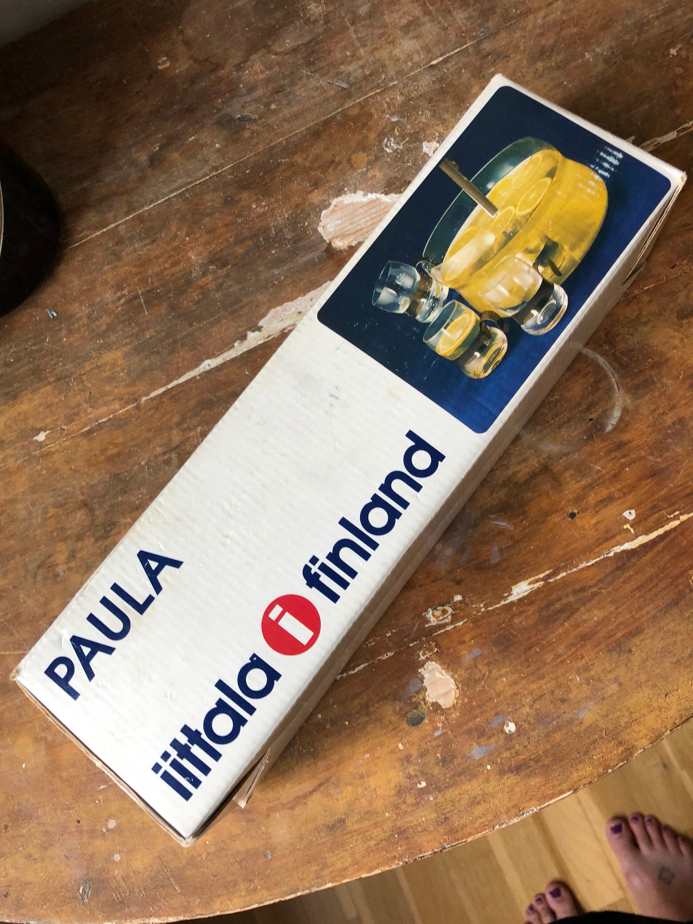 It is in great vintage condition with no signs of chips or cracks. Comes with original box. Signs of wear include water spots on handle, see photos. Could possibly be polished away. It would make a wonderful addition to any Paula Iittala collection.