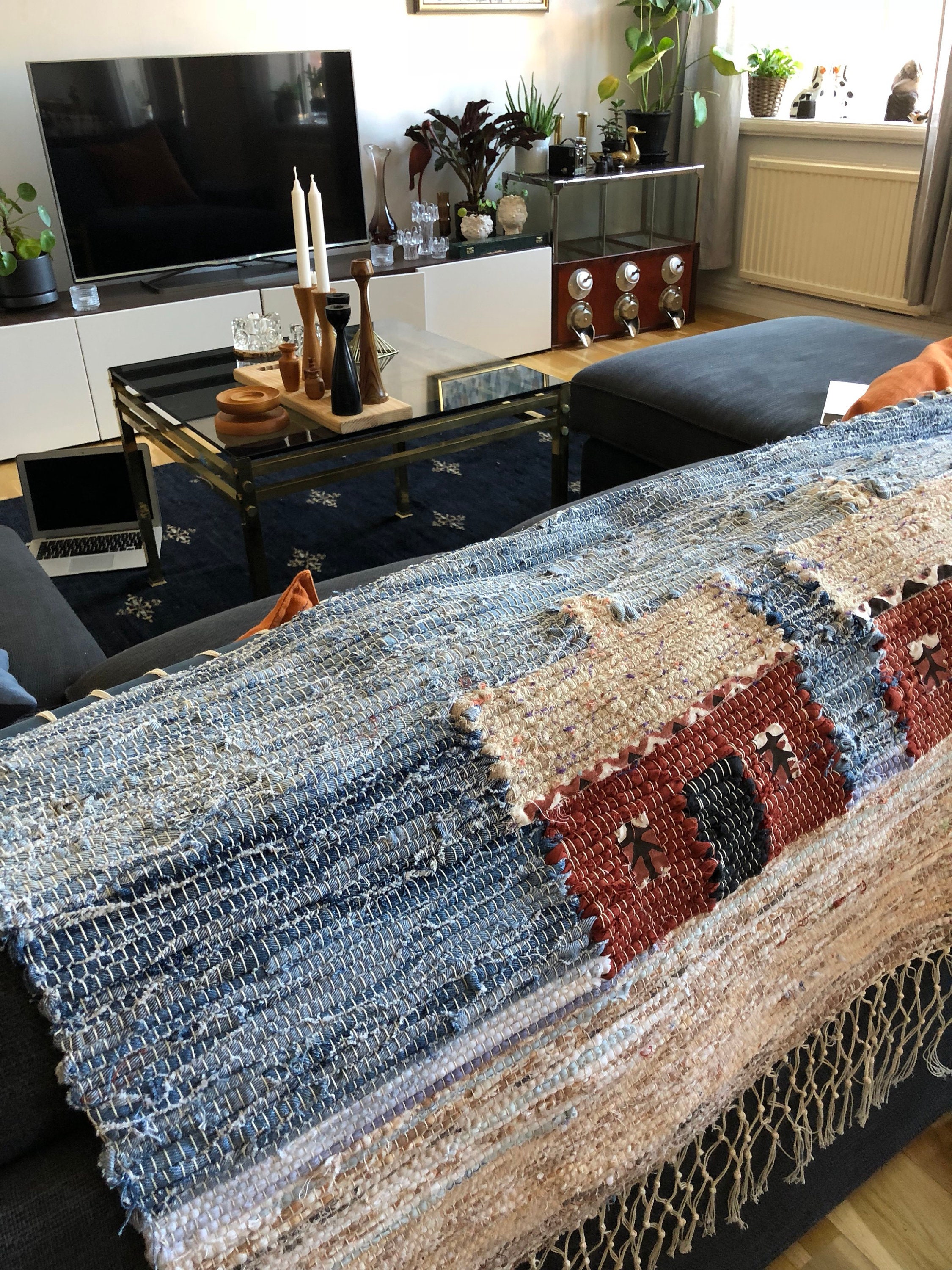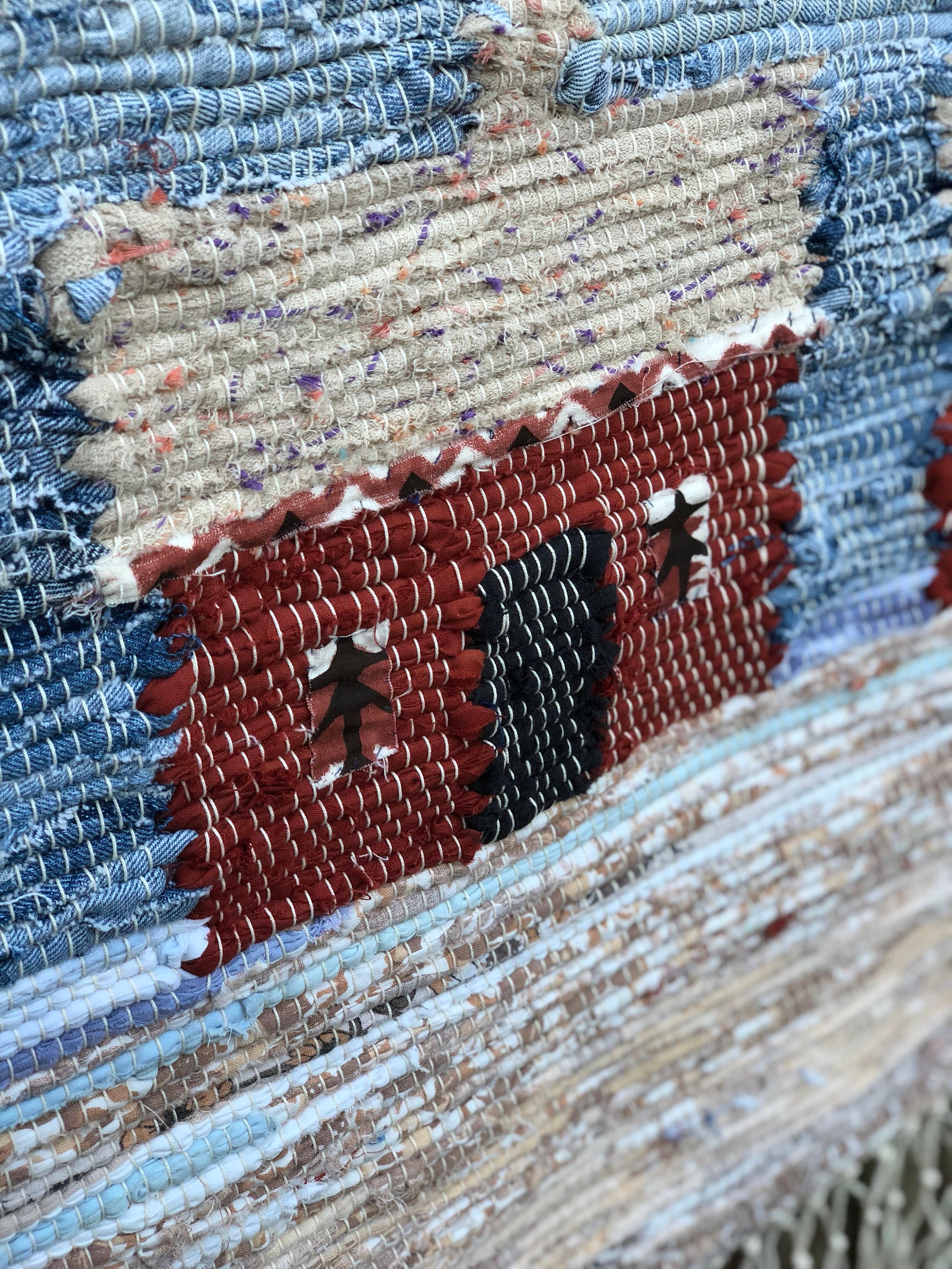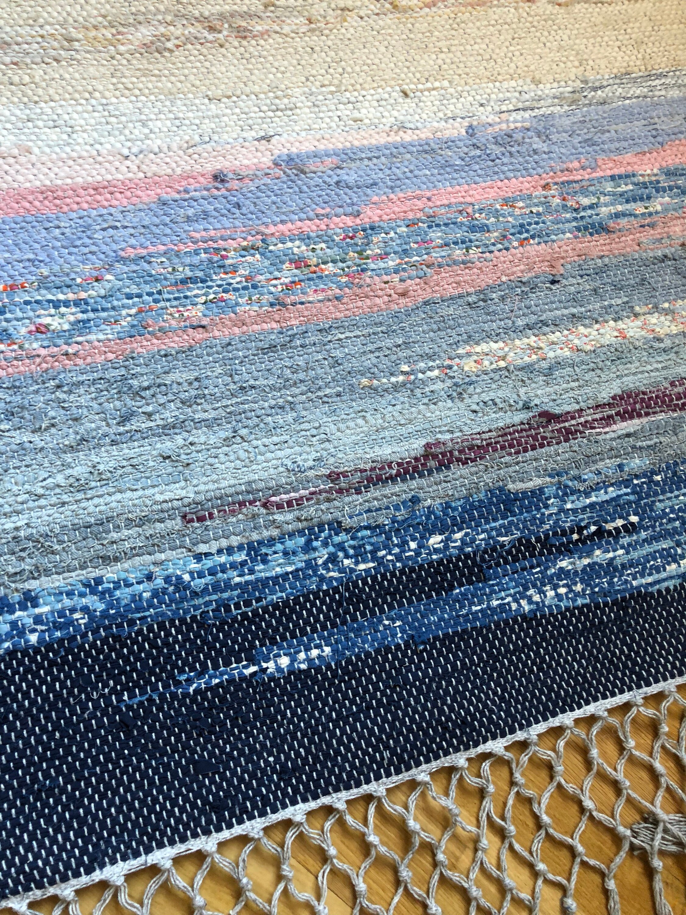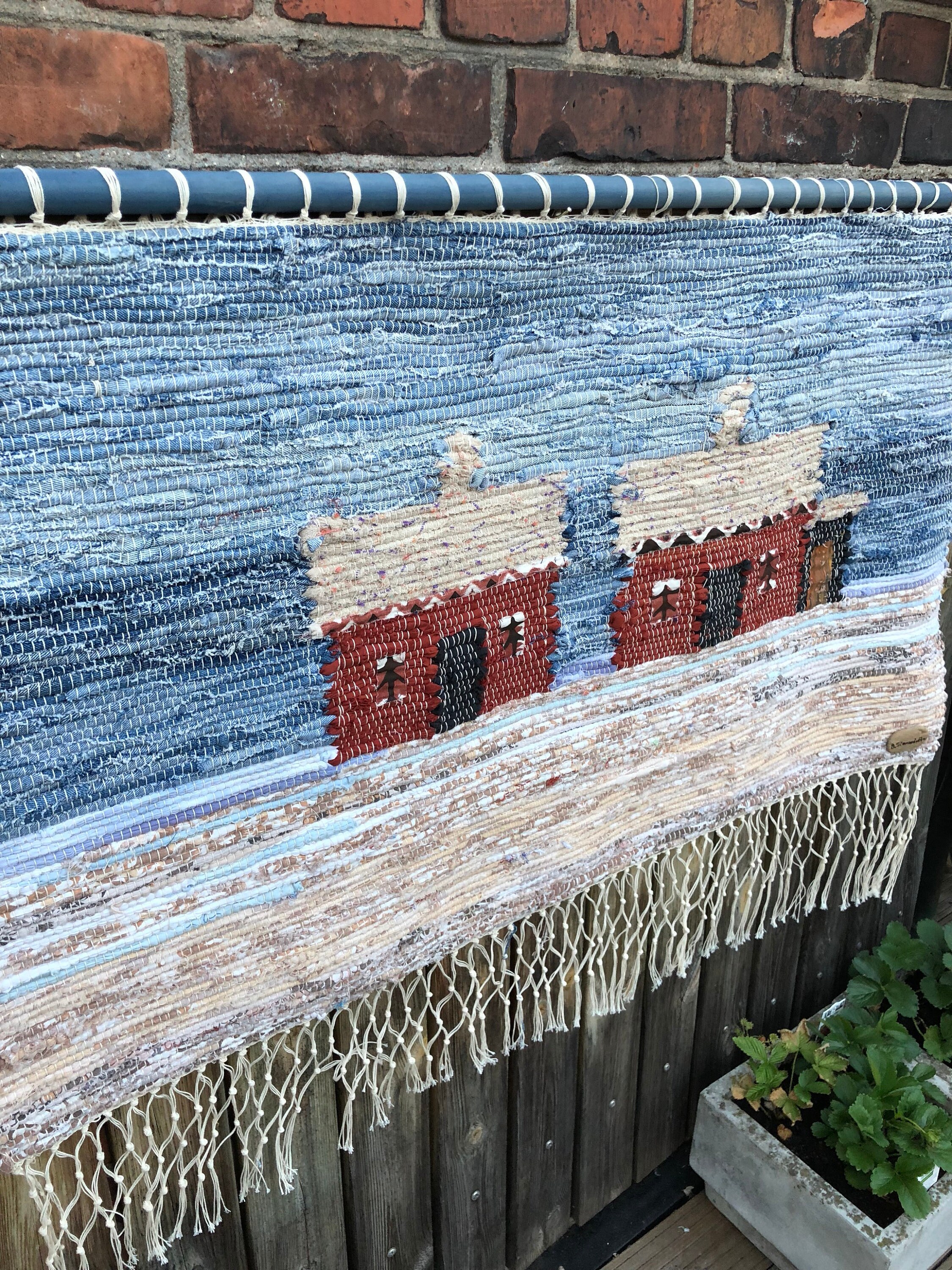 This is a large rag rug handwoven textile art Scandinavian wall hanging.