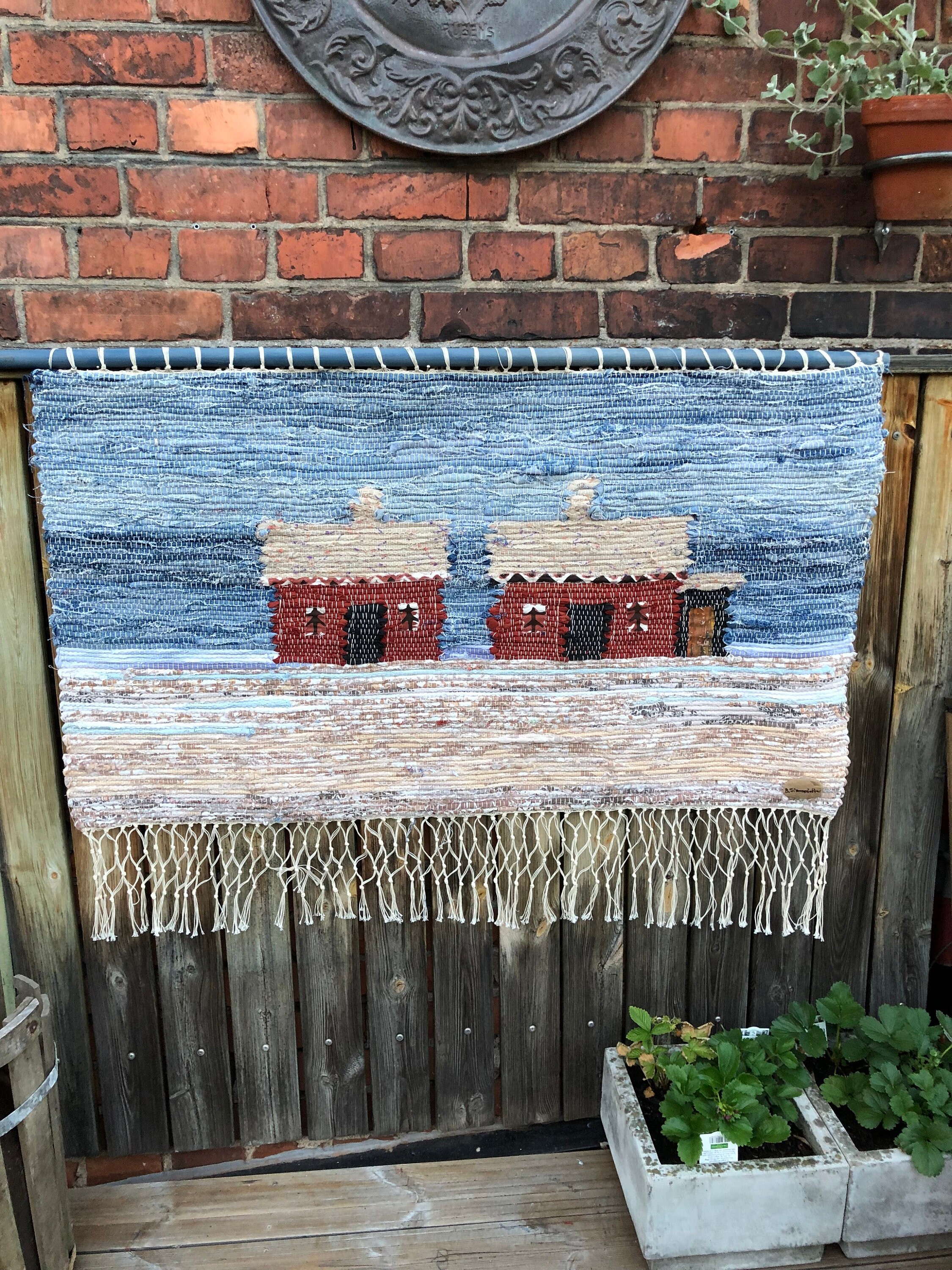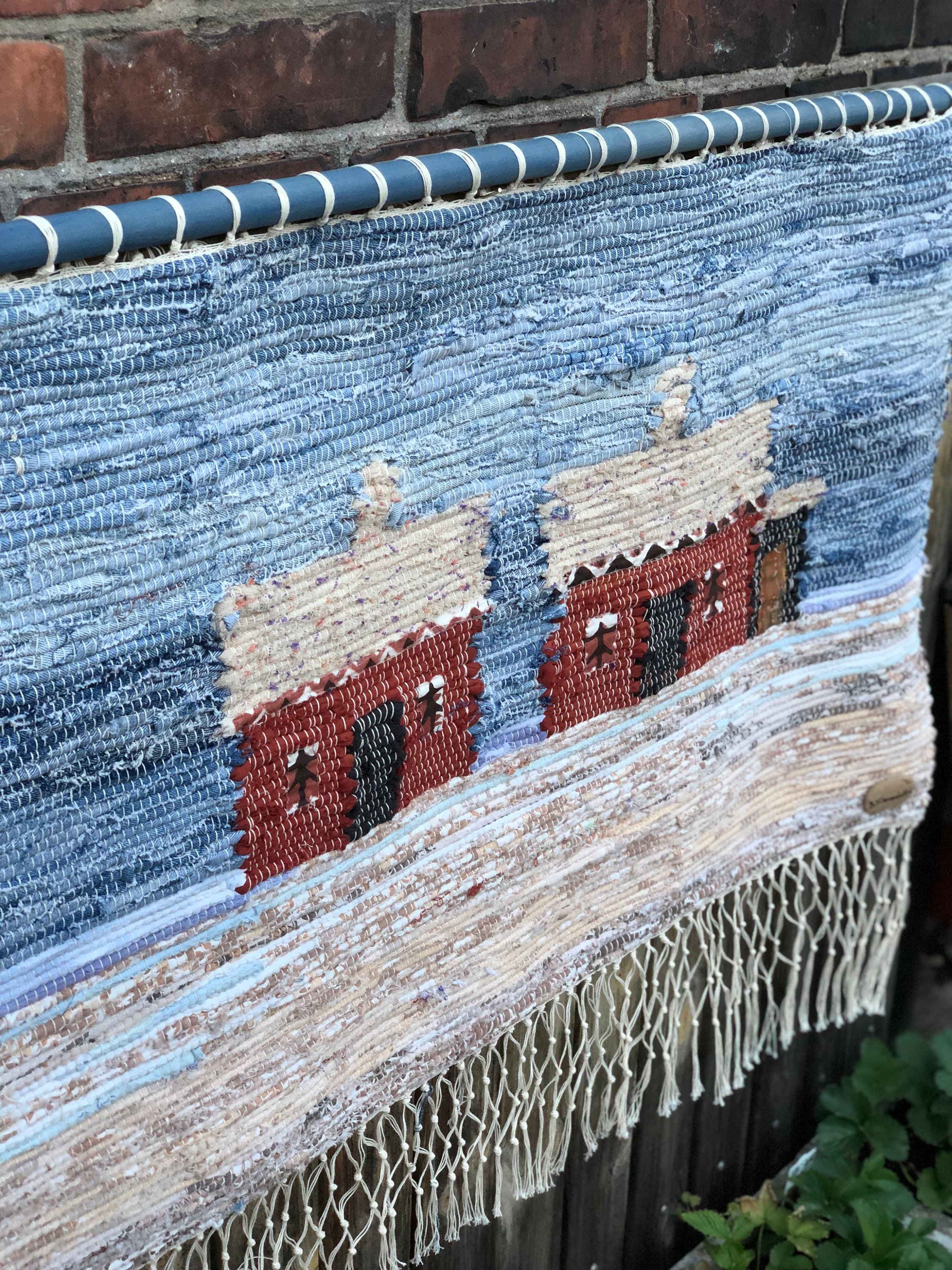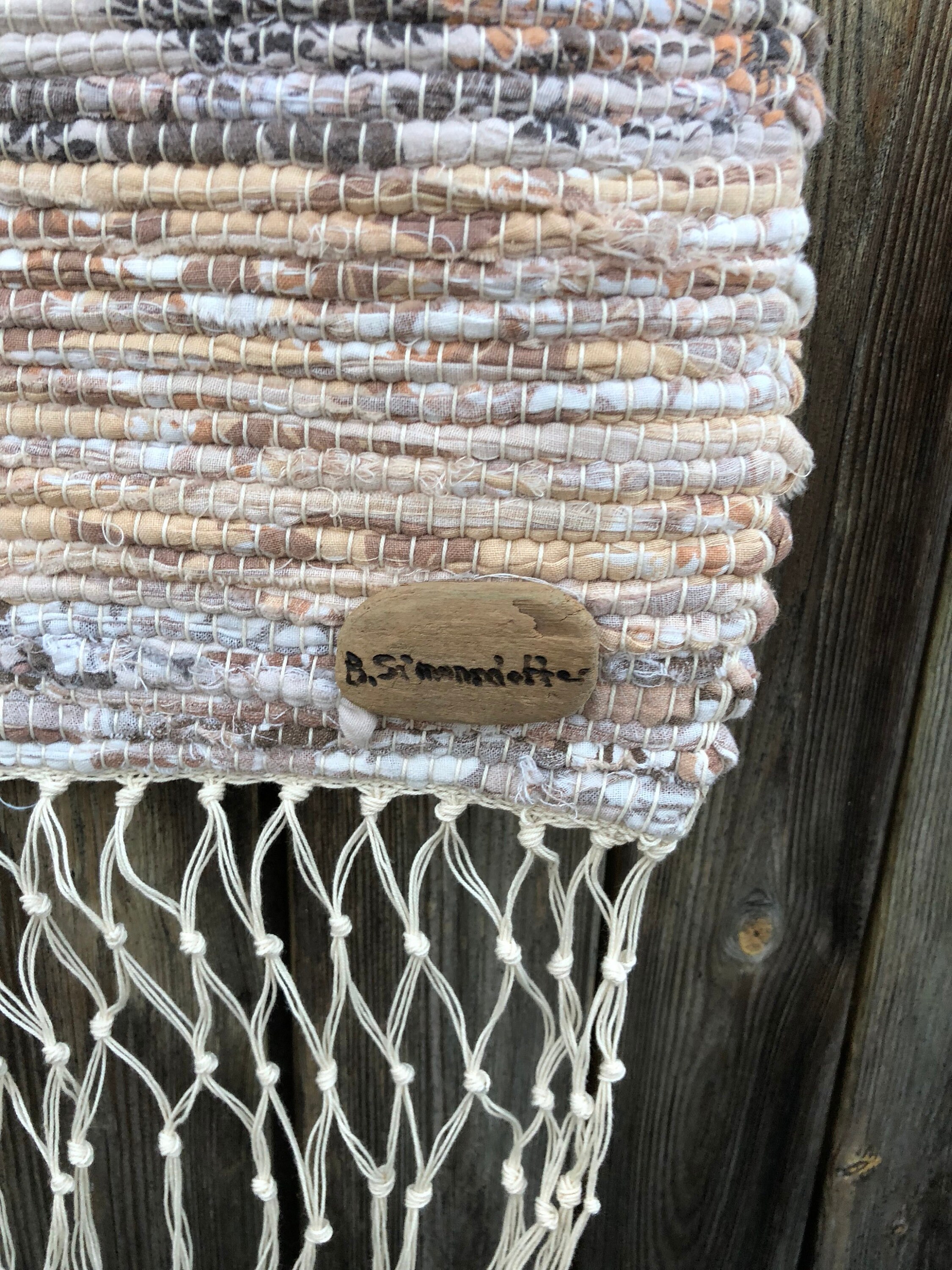 The end of the wall hanging is tied off with the traditional Scandinavian fringe and the weavers signature on a bit of local driftwood attached to the bottom.