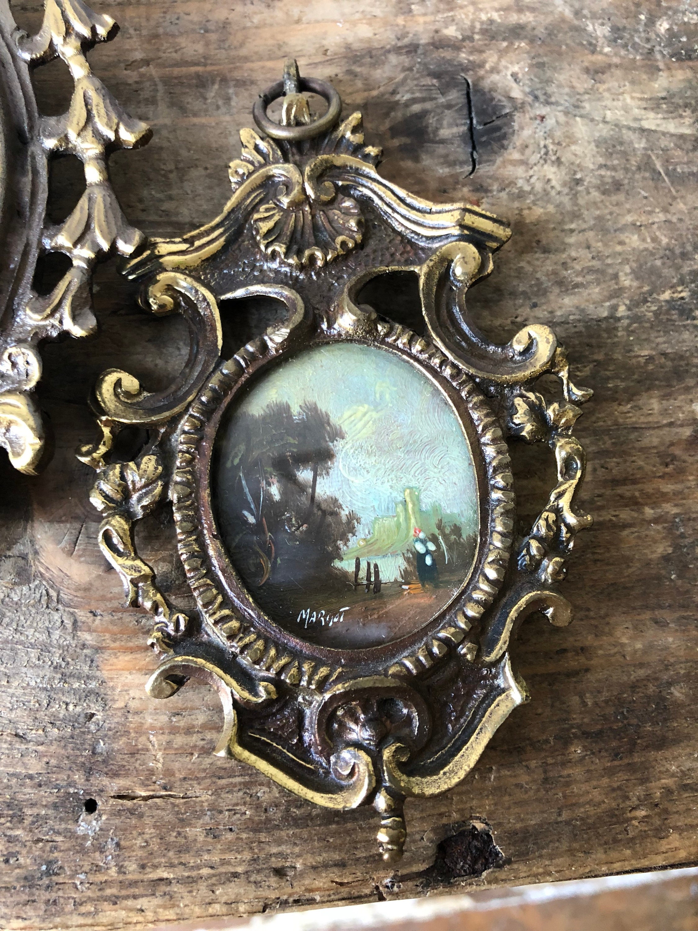 These are the perfect gift for anyone that likes vintage miniature artwork. These are 3 vintage bronze metal frames with original hand painted pictures. They have lovely detail and are signed.