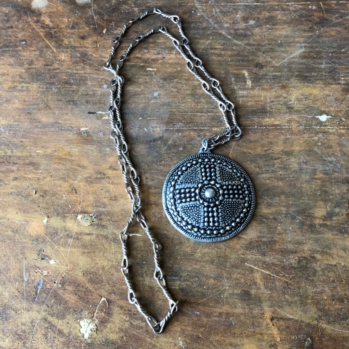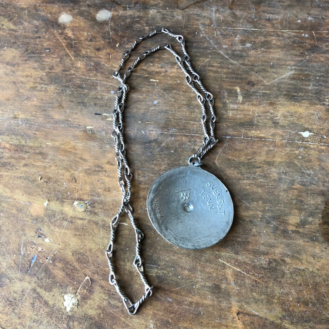 This is a stamped Swedish vintage pewter necklace signed NV Swedish pewter. It is a traditional Viking shield.