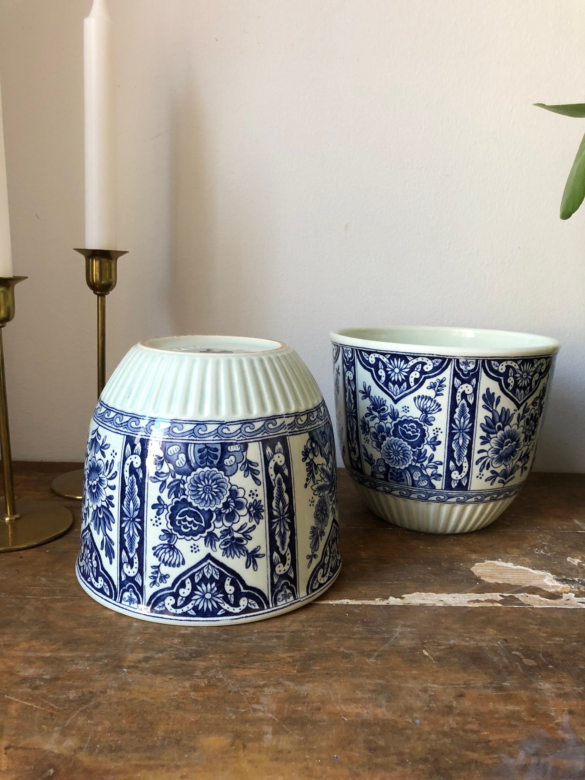 The planters are a lovely pale green background with a beautiful a dark blue intricate design. These Dutch planters will give a pop of color to your space. Perfect for a kitchen, shelf or window sill.