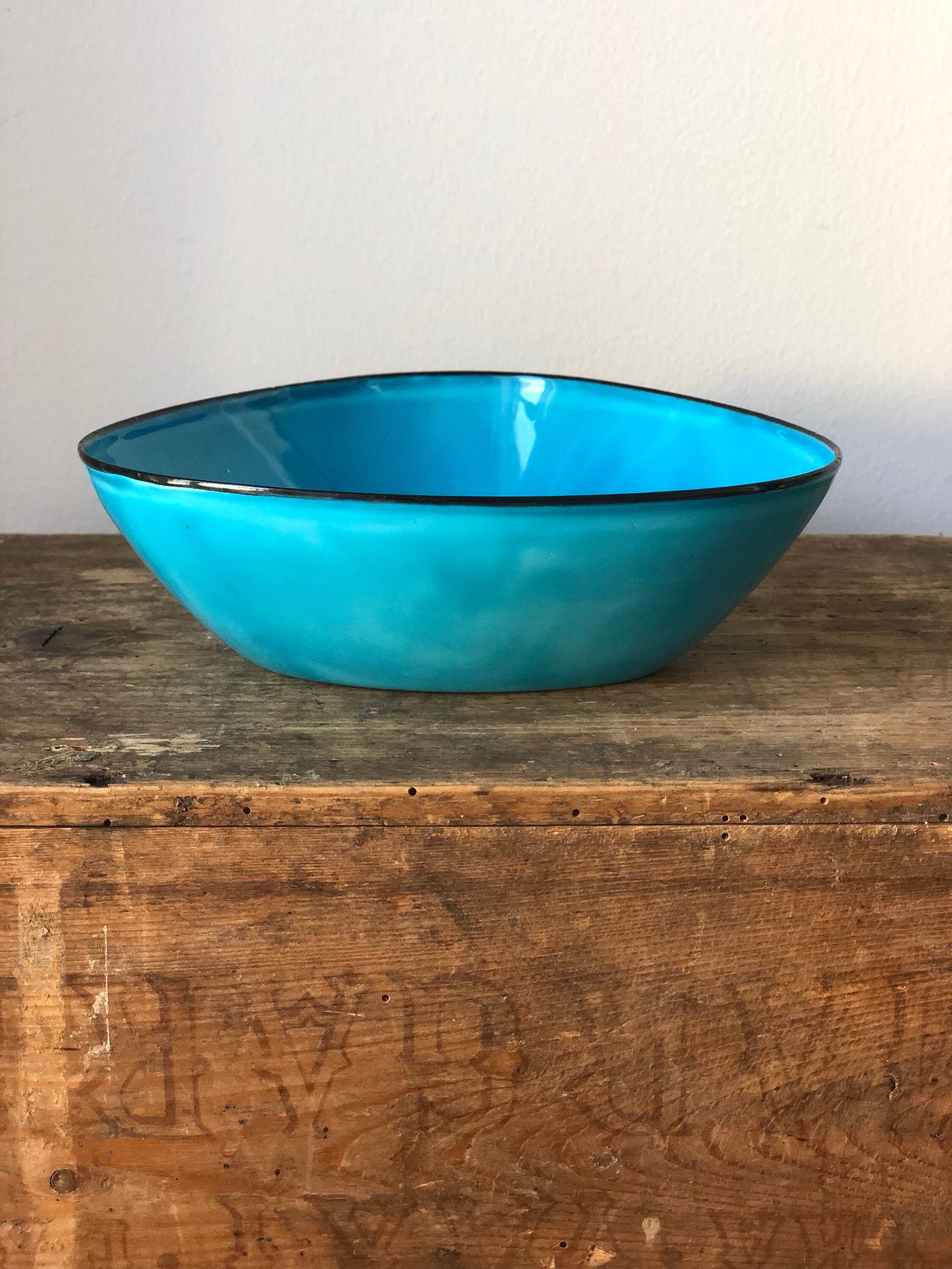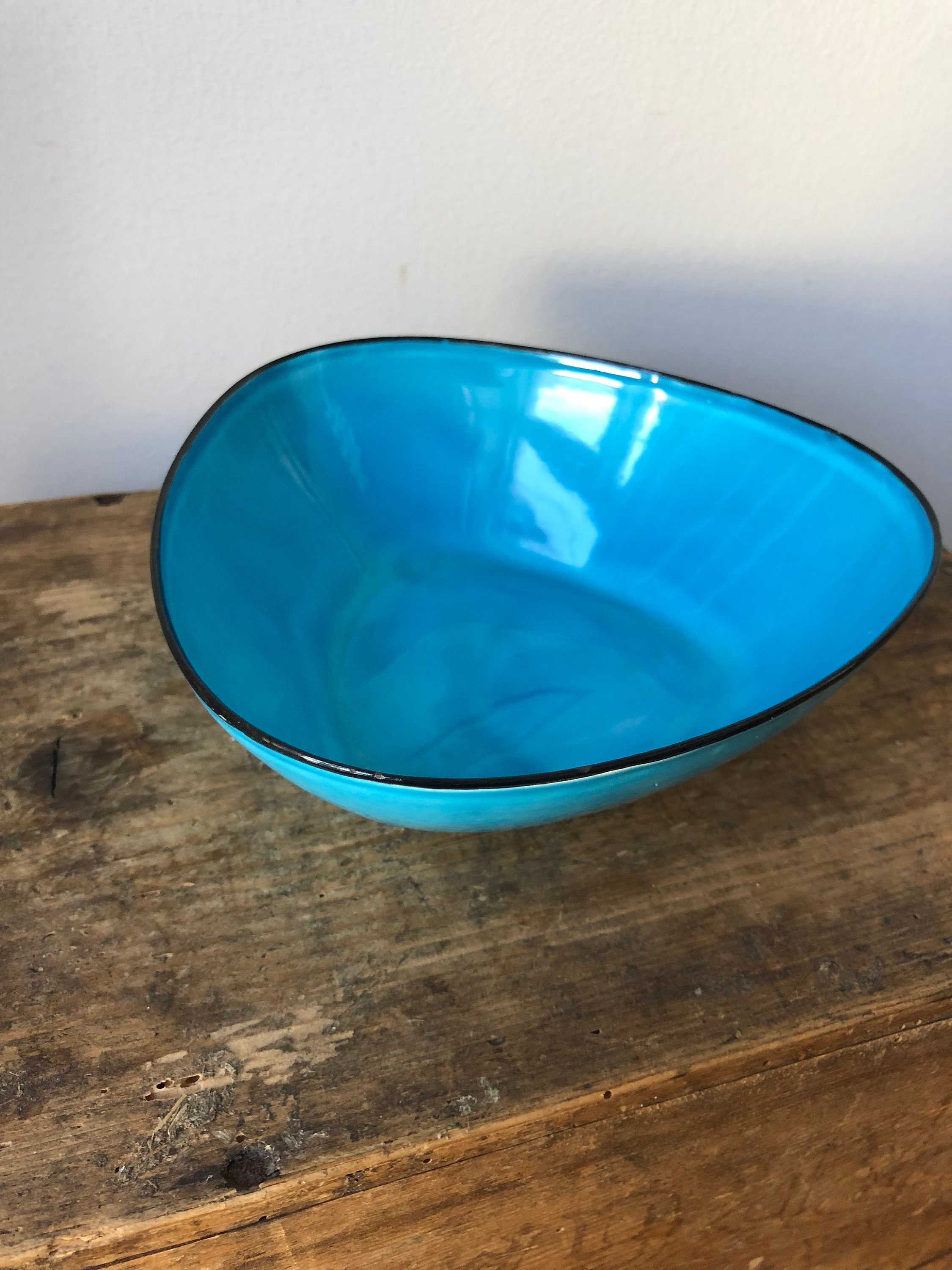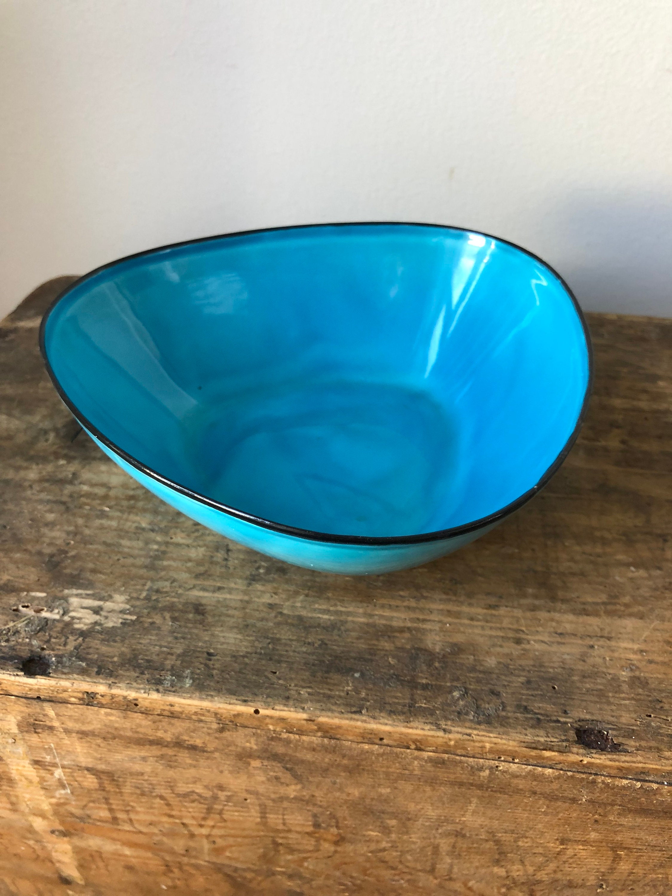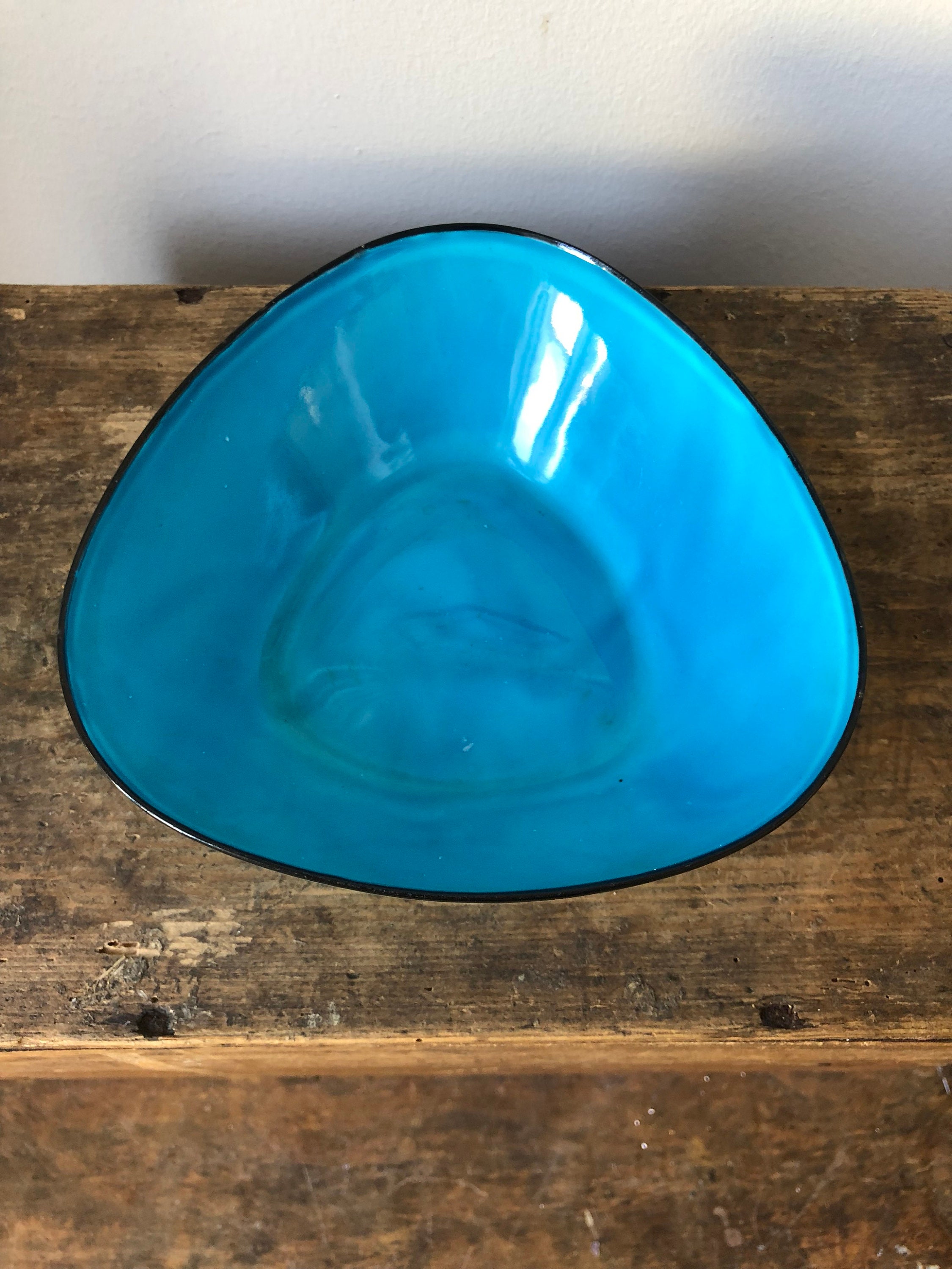 This is a triangular Kockums enamelware bowl designed by Arne Erkers in the 1950s.