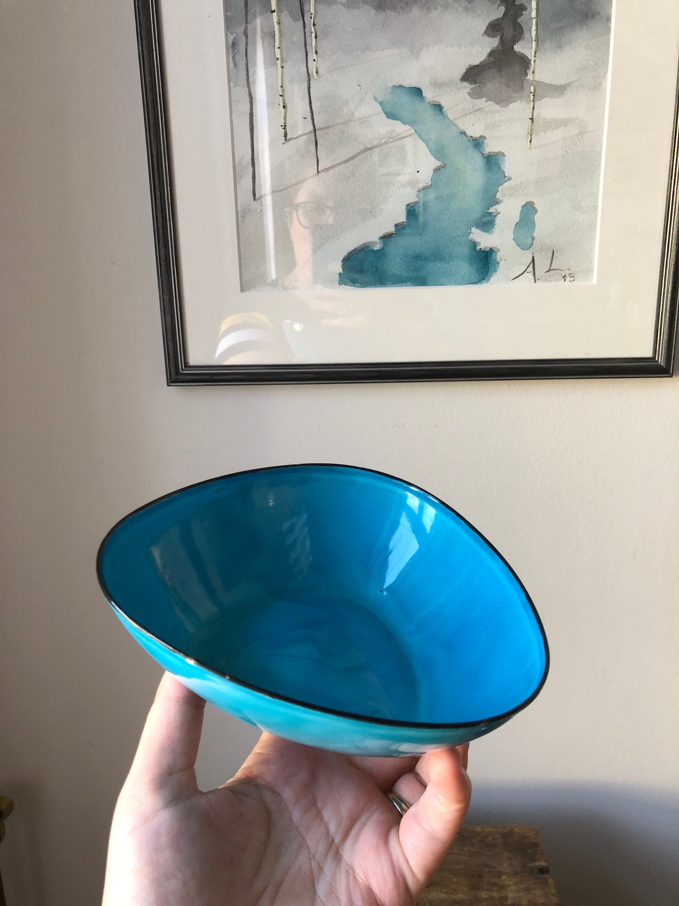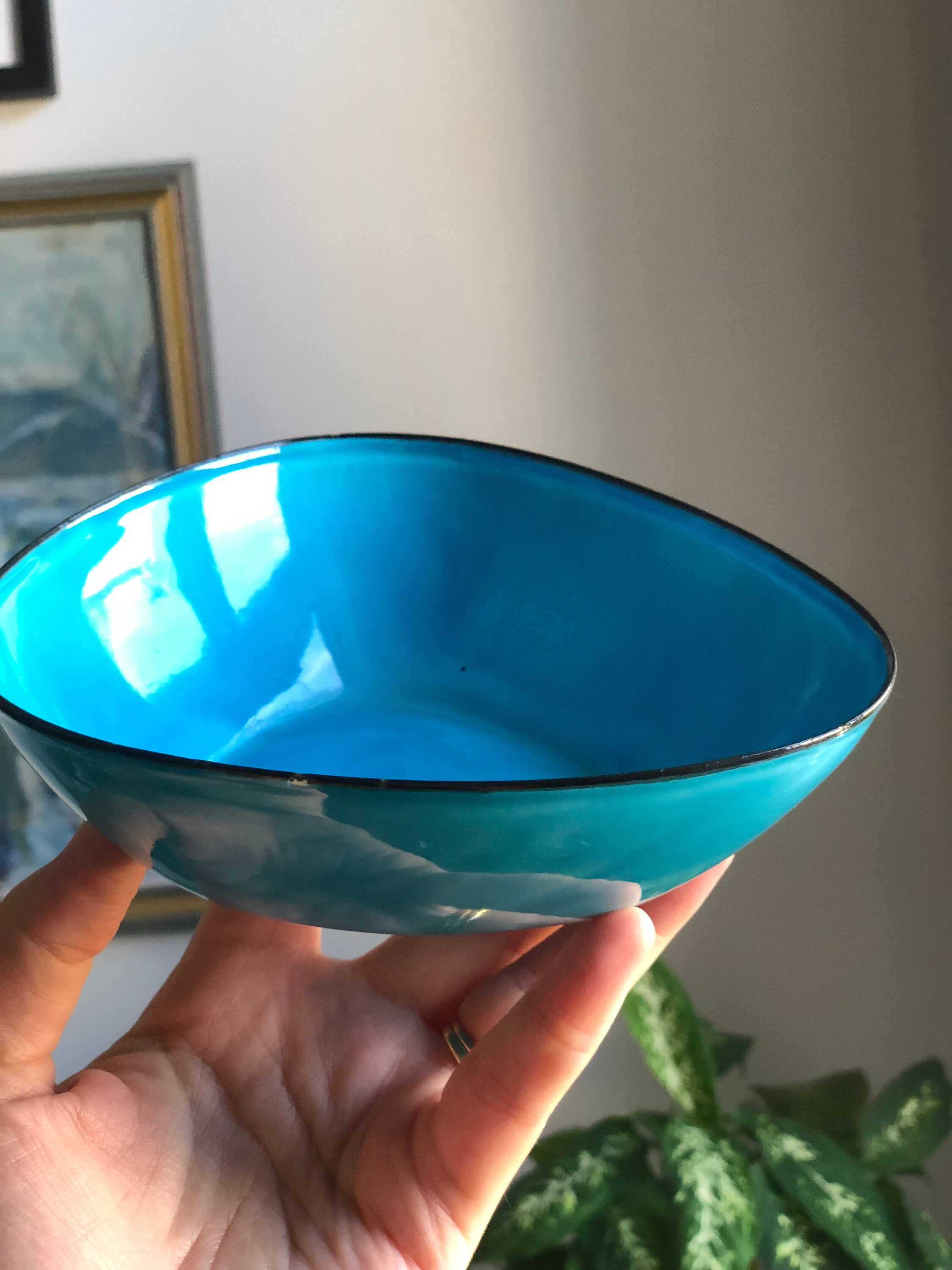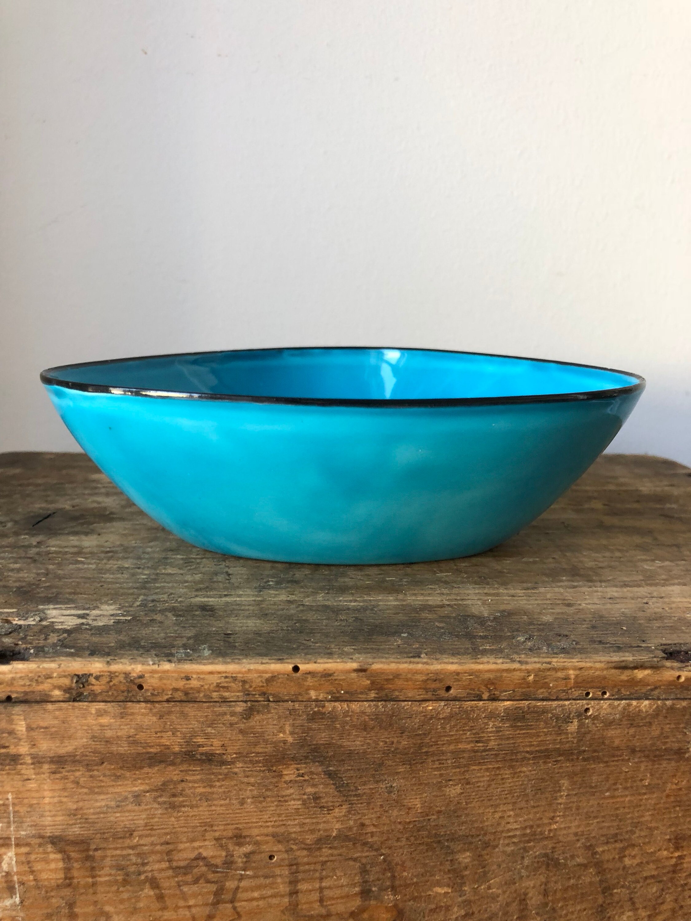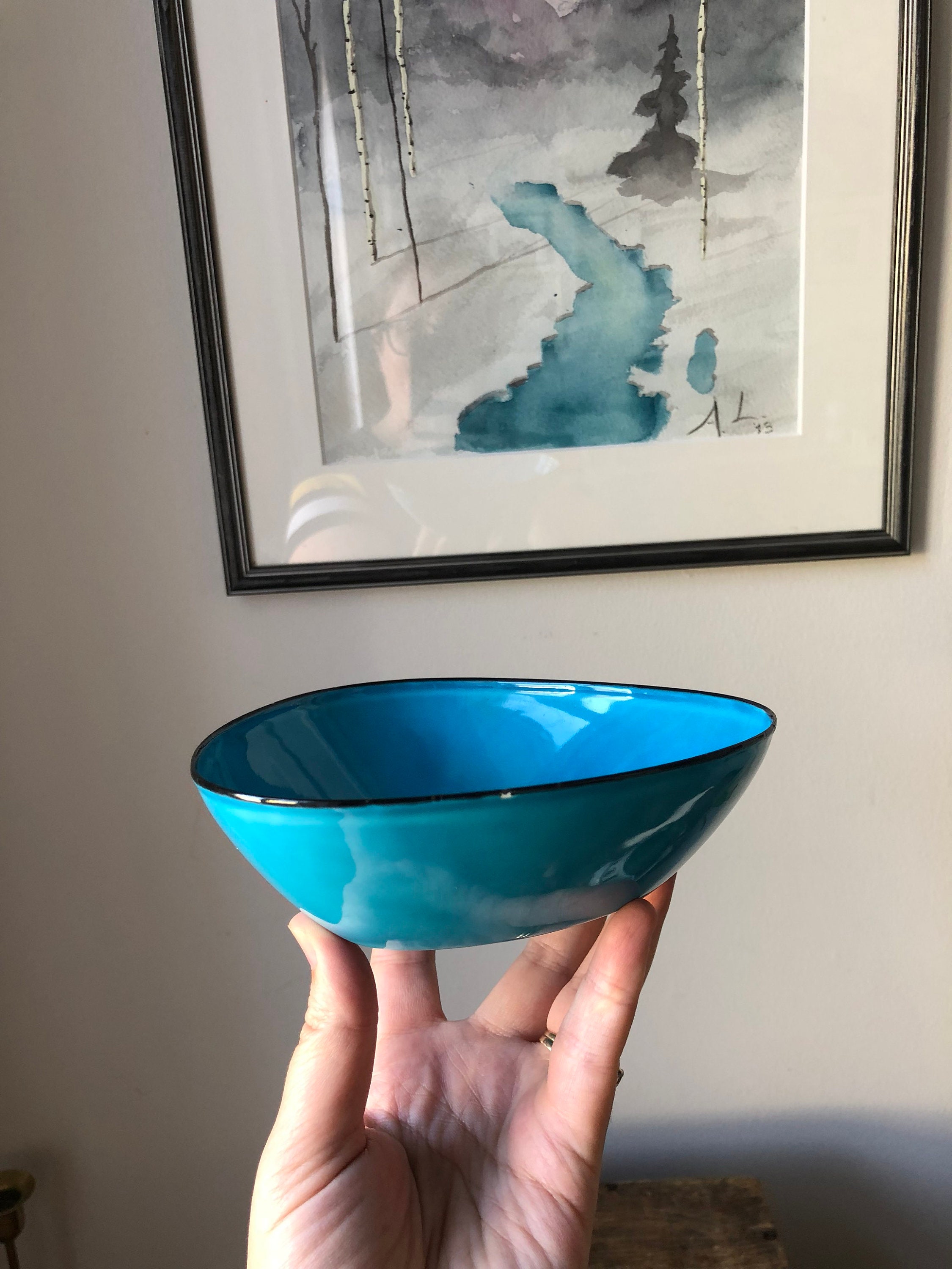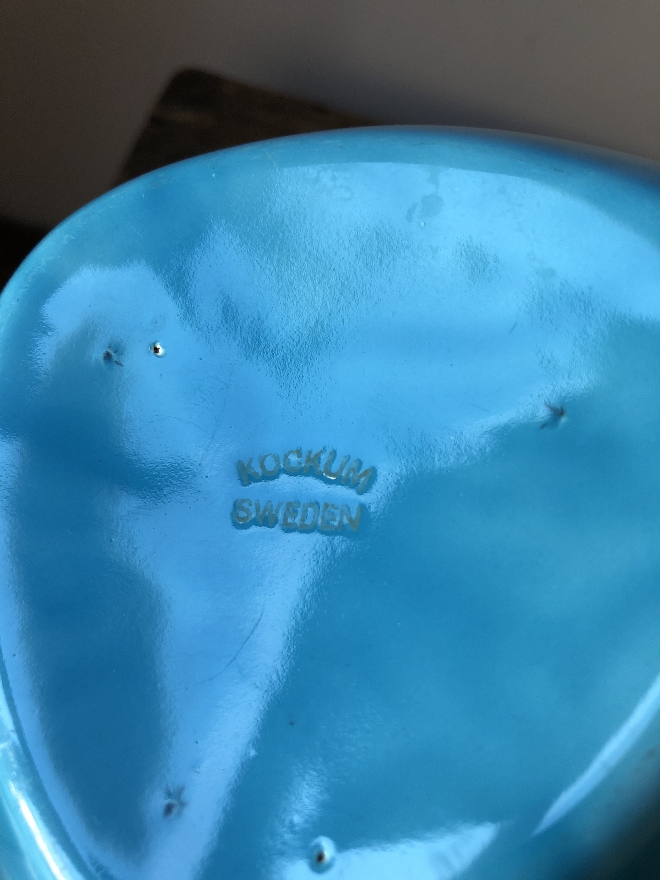 This is a triangular Kockums enamelware bowl designed by Arne Erkers in the 1950s.