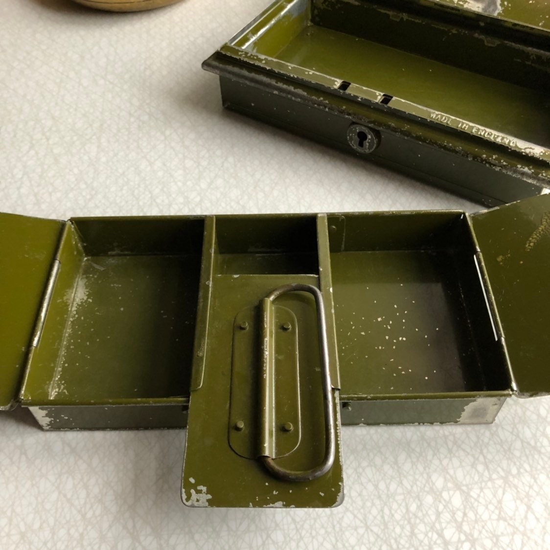 This is a vintage cash box / safe / lock box from the 1940's. It is made of green tin metal with a brass handle on top.