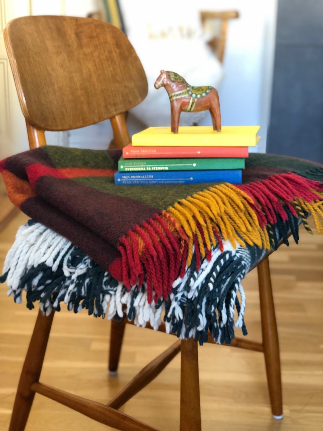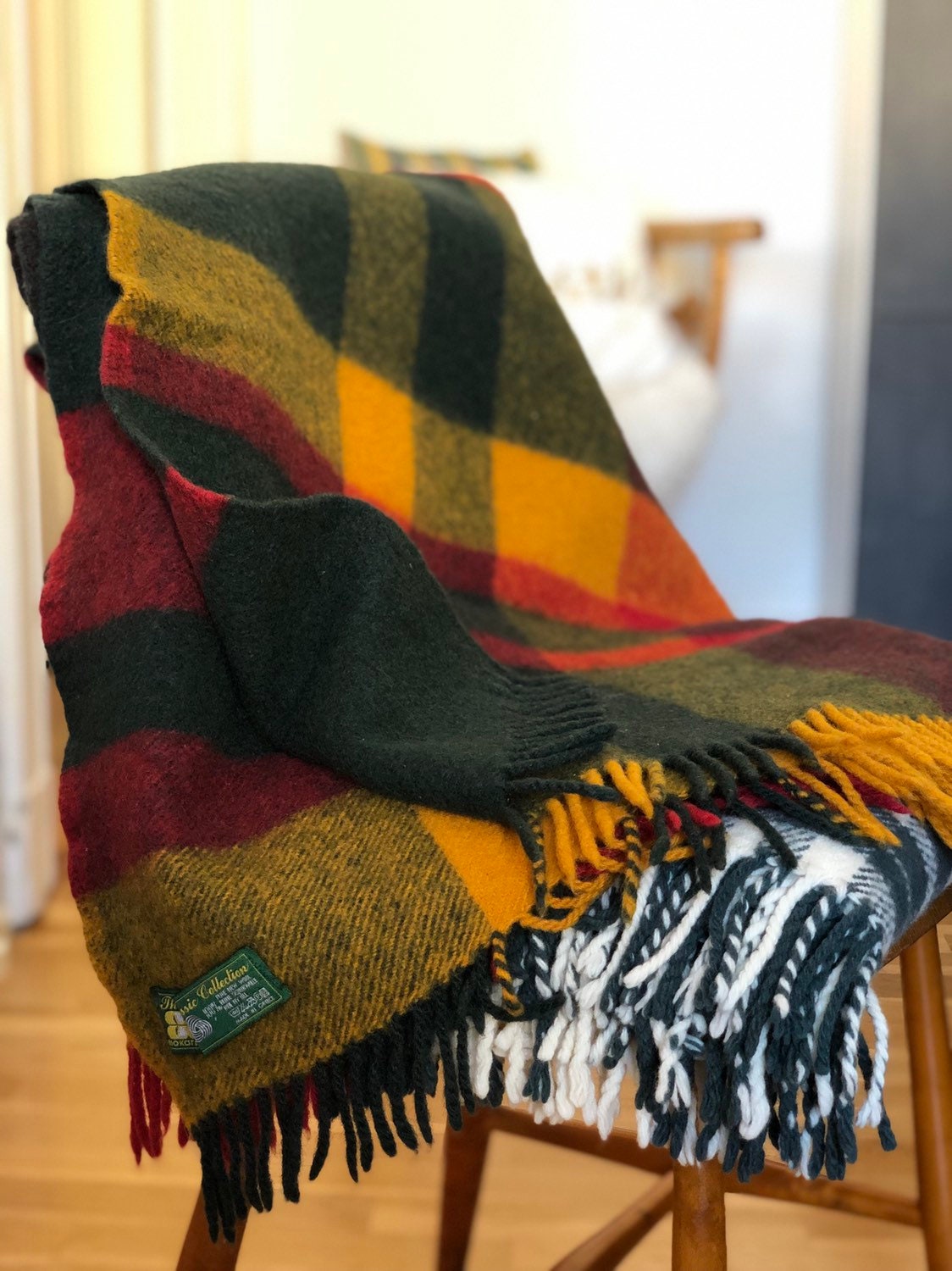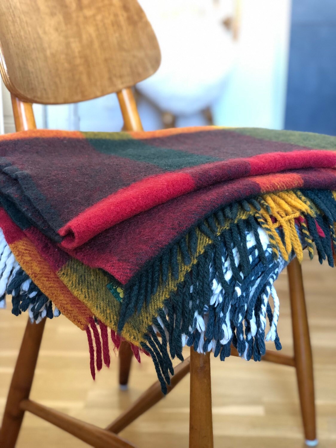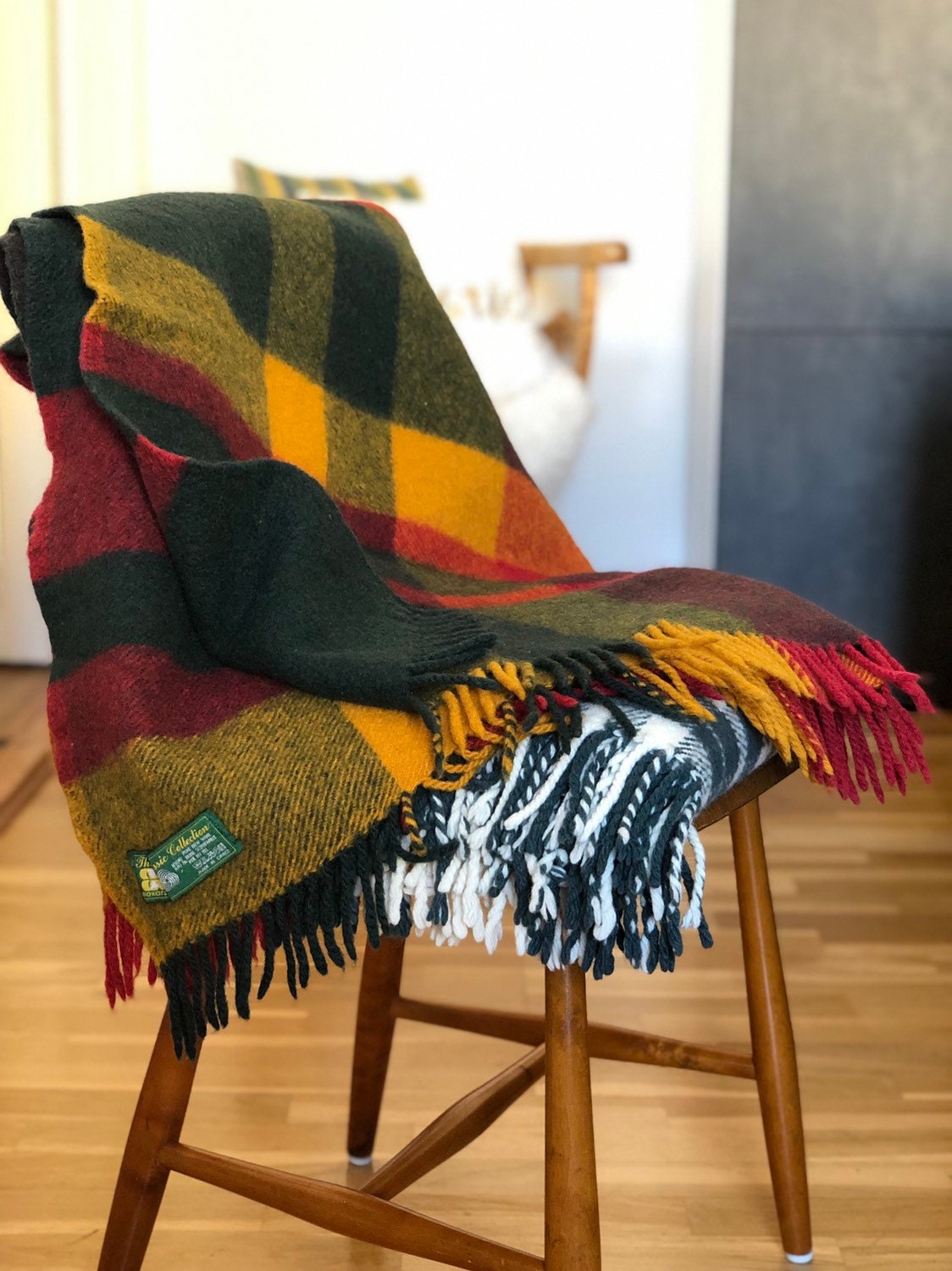 This is a classic wool throw from the 60's. The plaid is woven from 100% virgin wool and is warm and beautiful. Warm up any interior with these red yellow and green tone color scheme.