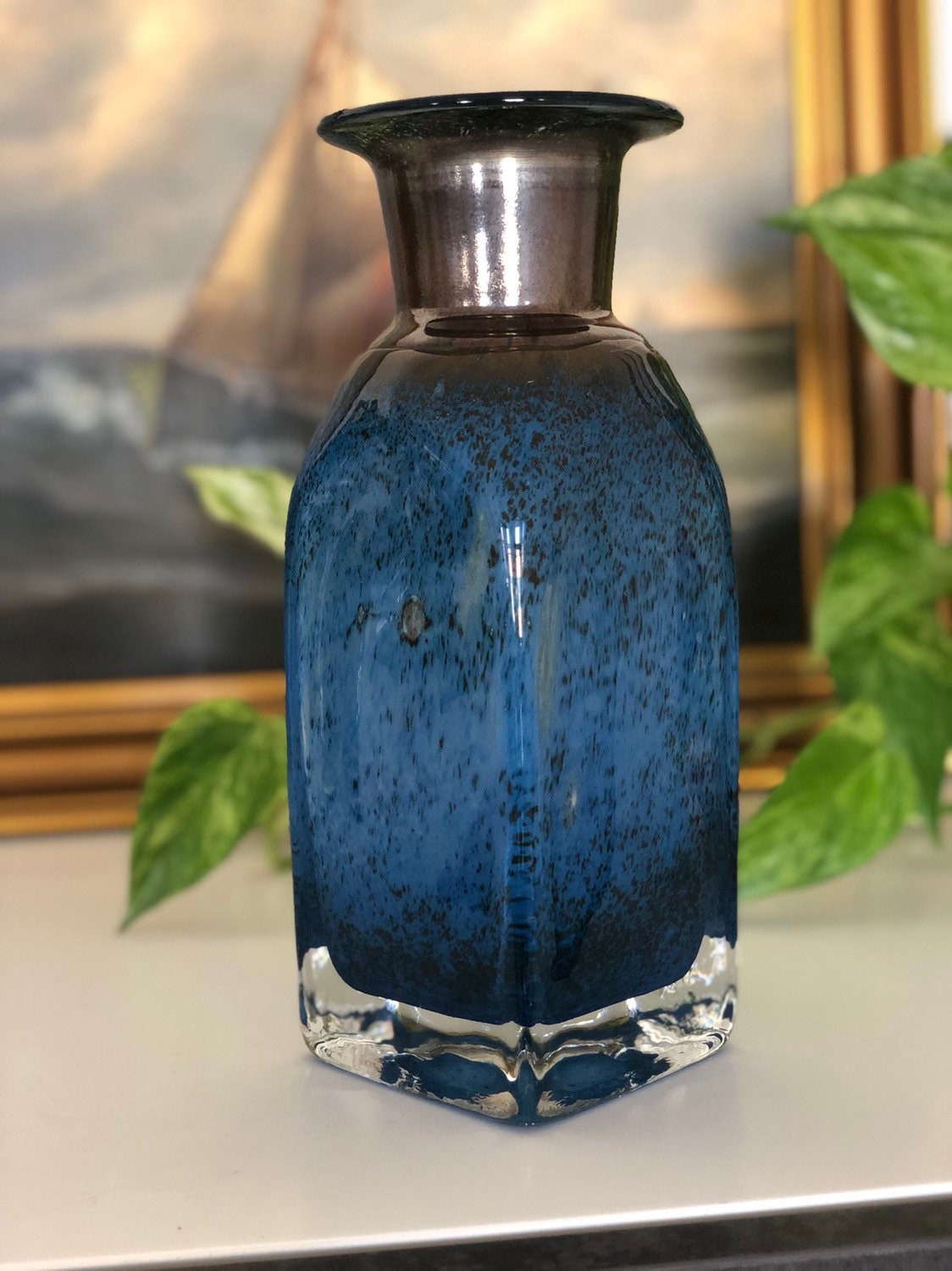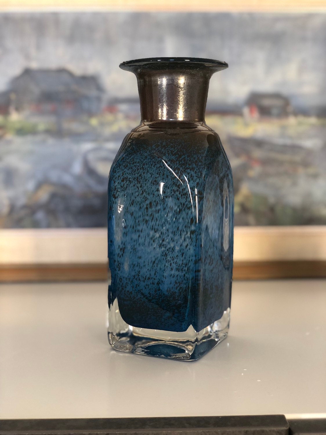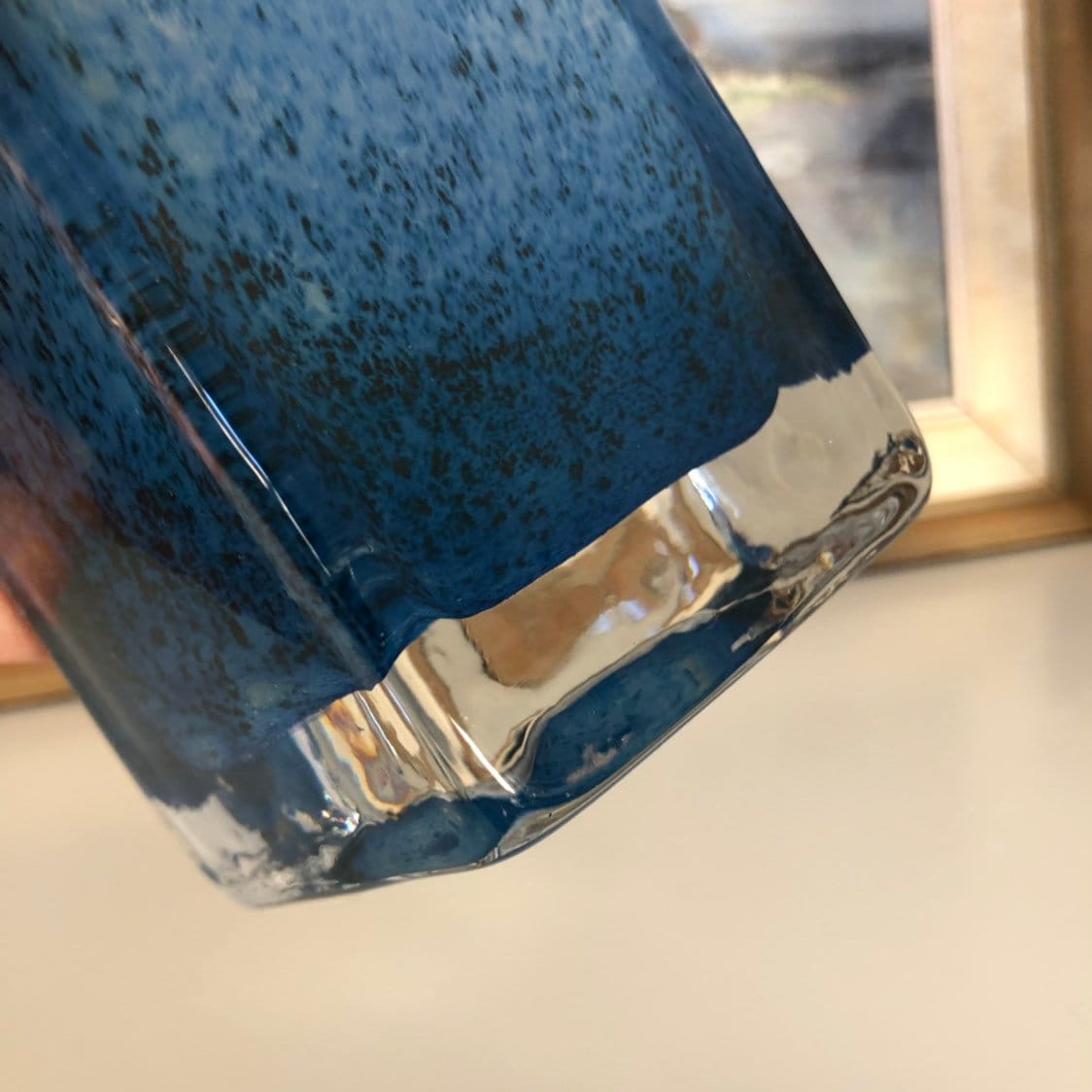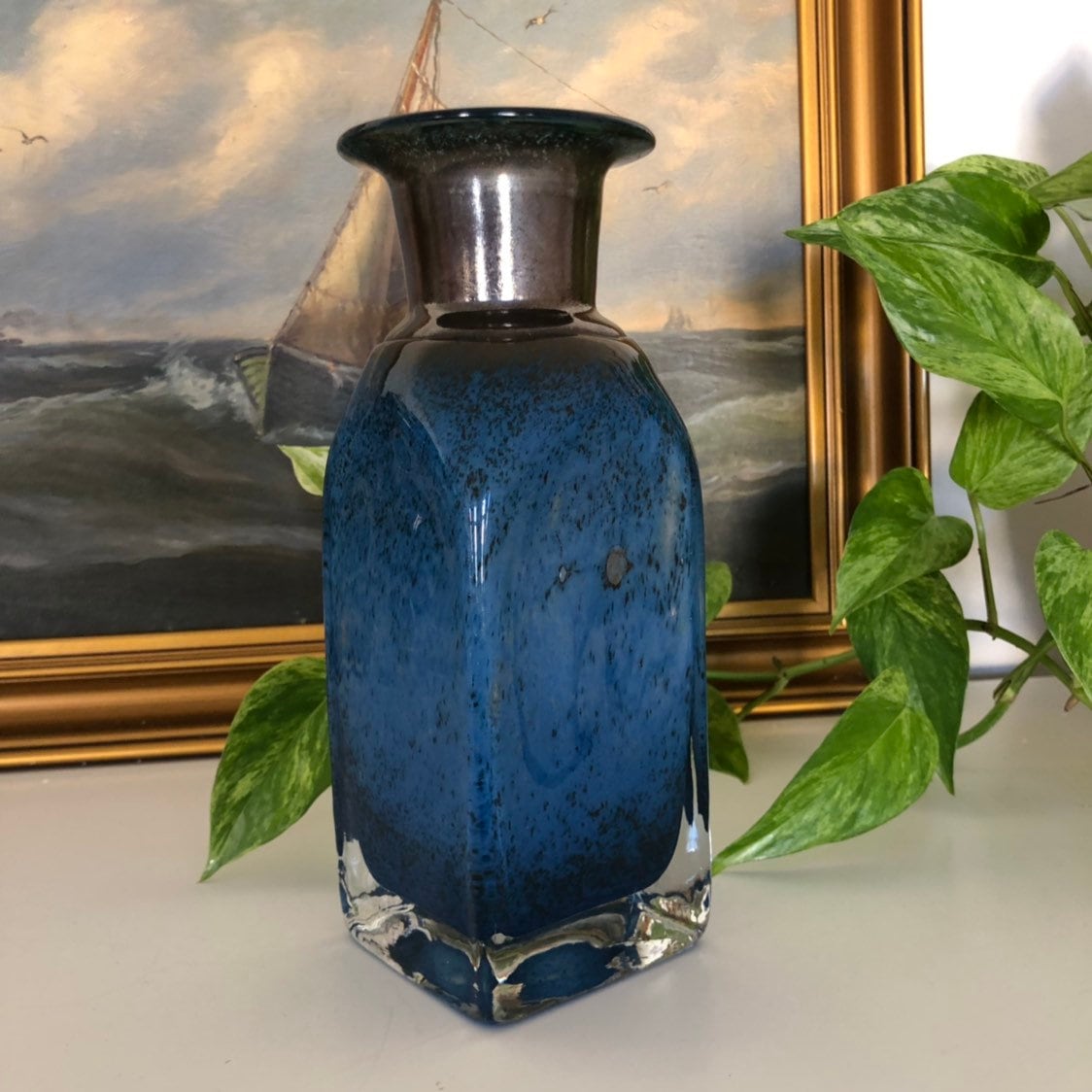 This is a beautiful vibrant cobalt blue glass vase with other shades creating an interesting pattern handblown into a mold. Designed by Bertil Vallien for Bods Åfors.
