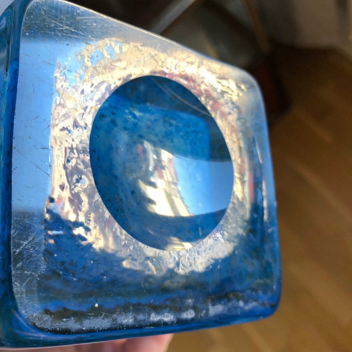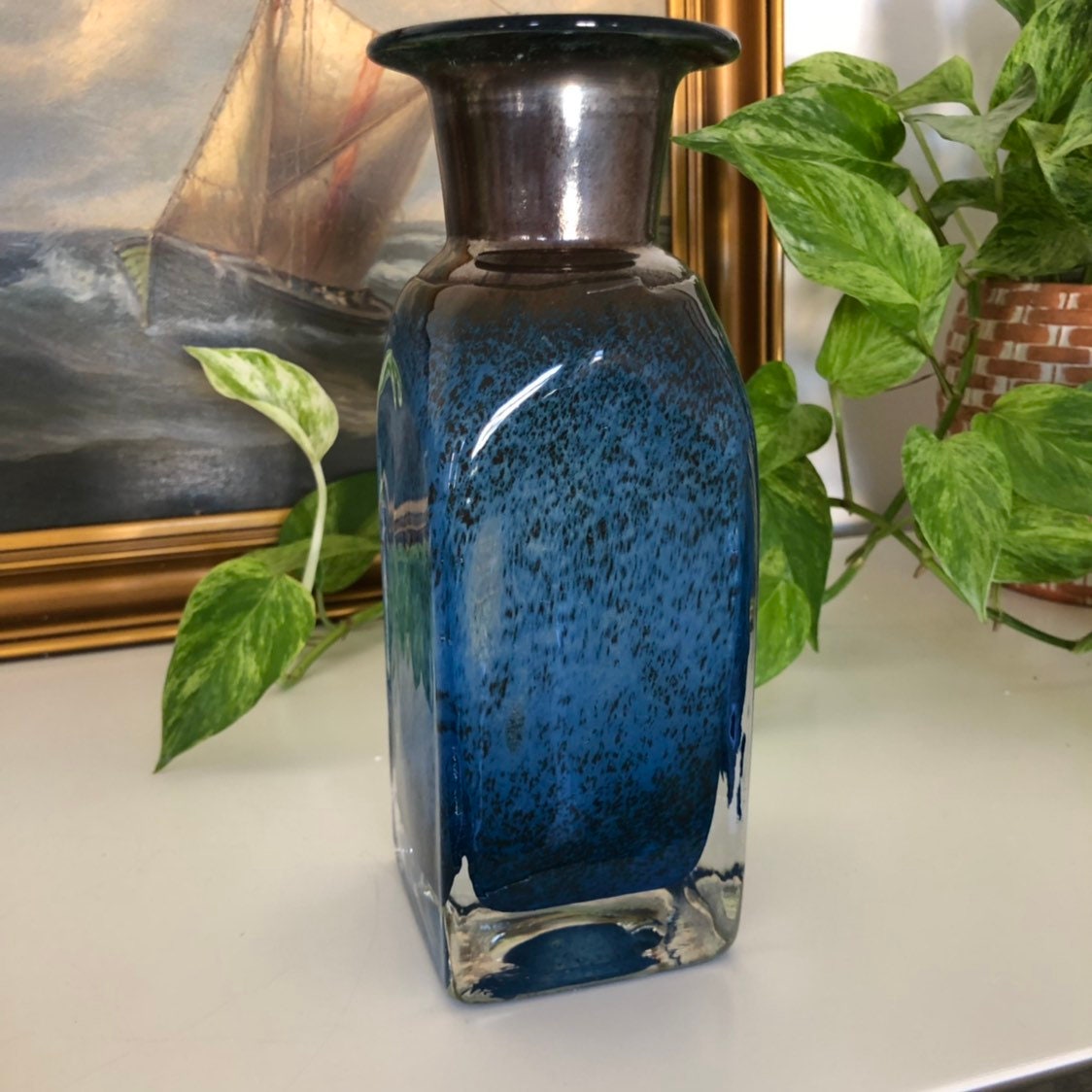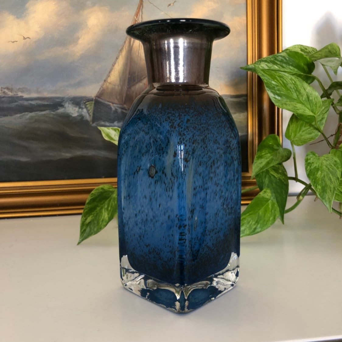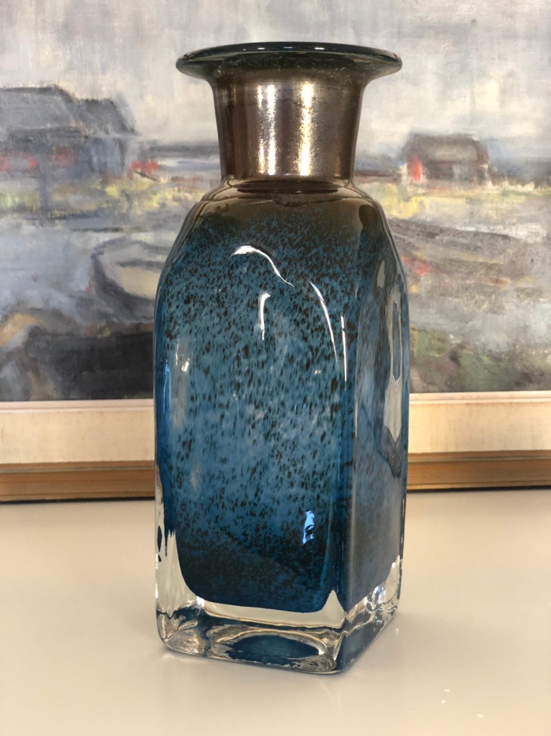 This is a beautiful vibrant cobalt blue glass vase with other shades creating an interesting pattern handblown into a mold. Designed by Bertil Vallien for Bods Åfors.