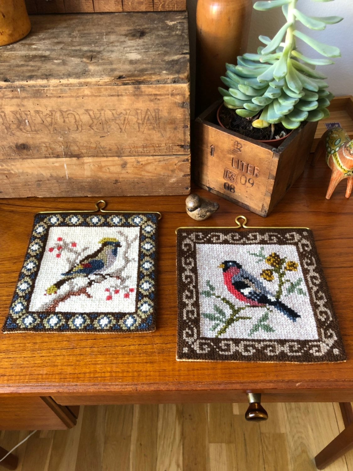 This is a pair of Scandinavian traditional embroidered needlepoint wall hangings in vibrant fall colors. They include gold hardware hangers.