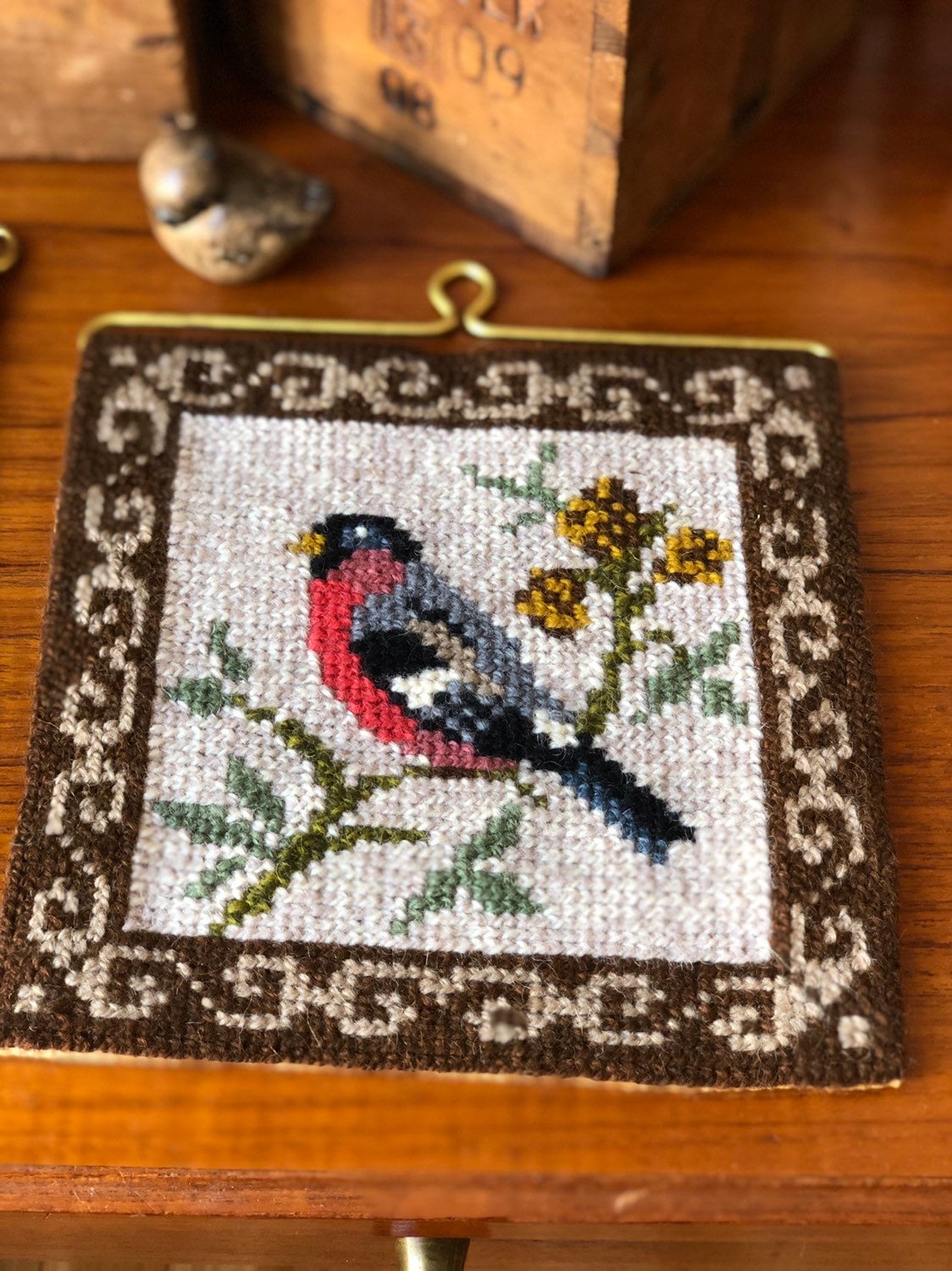The motifs are beautiful birds perched on a branch with folk art flowers in the background and a traditional Scandinavian embroidered border.