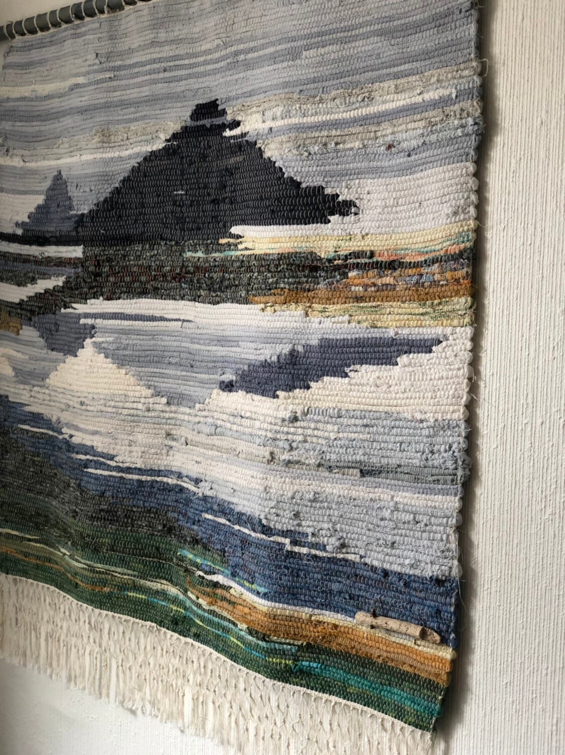 The end of the wall hanging is tied off with the traditional Scandinavian fringe and the weavers signature on a bit of local driftwood attached to the bottom.