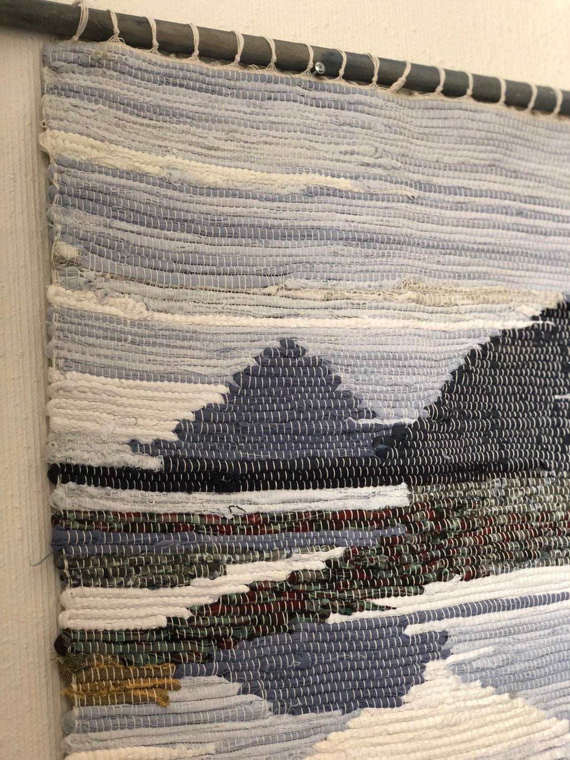 This is a large rag rug handwoven textile art Scandinavian wall hanging.