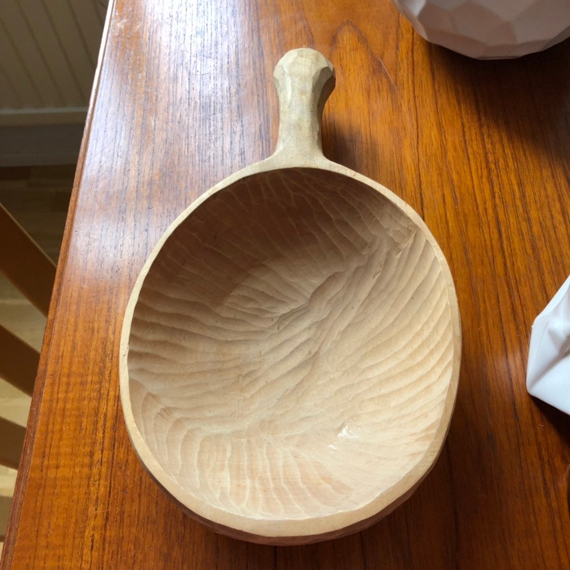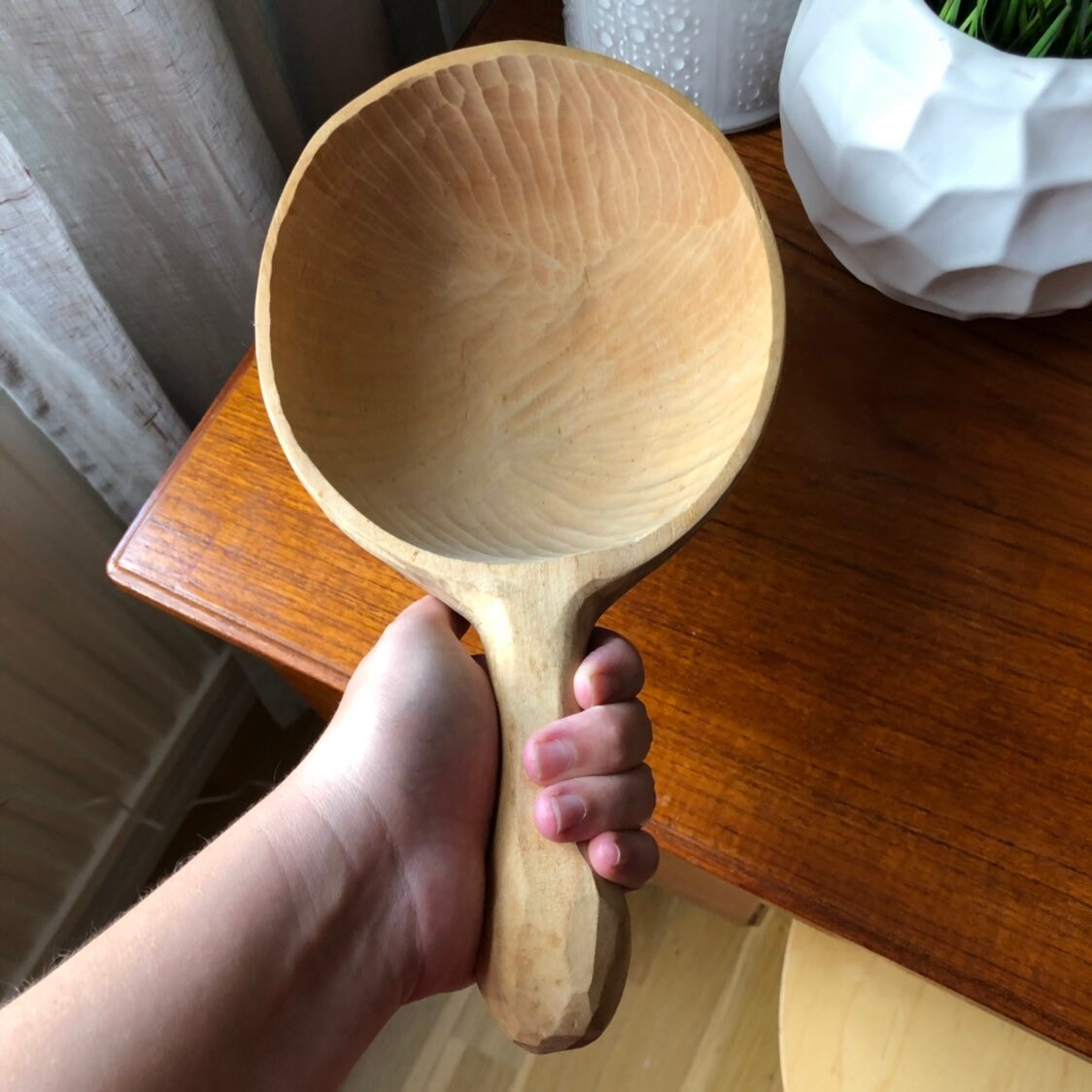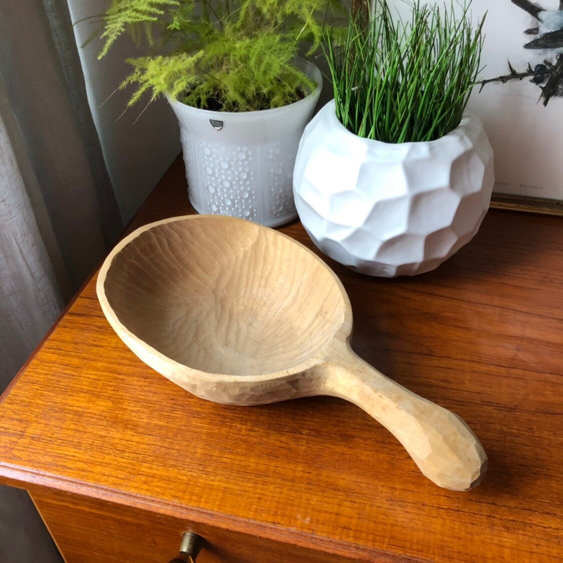 This a large beautiful Swedish hand carved wooden spoon / bowl with a handle.