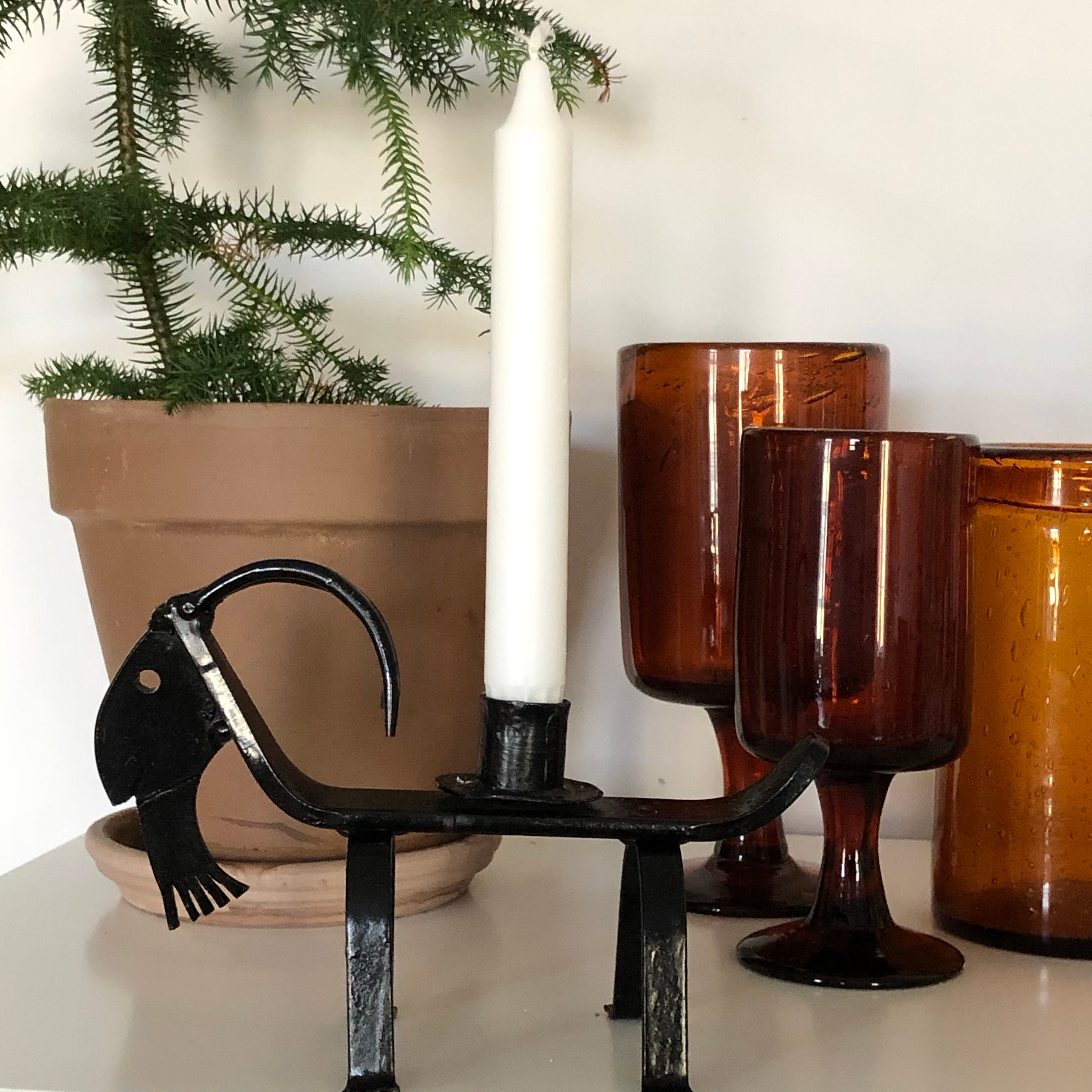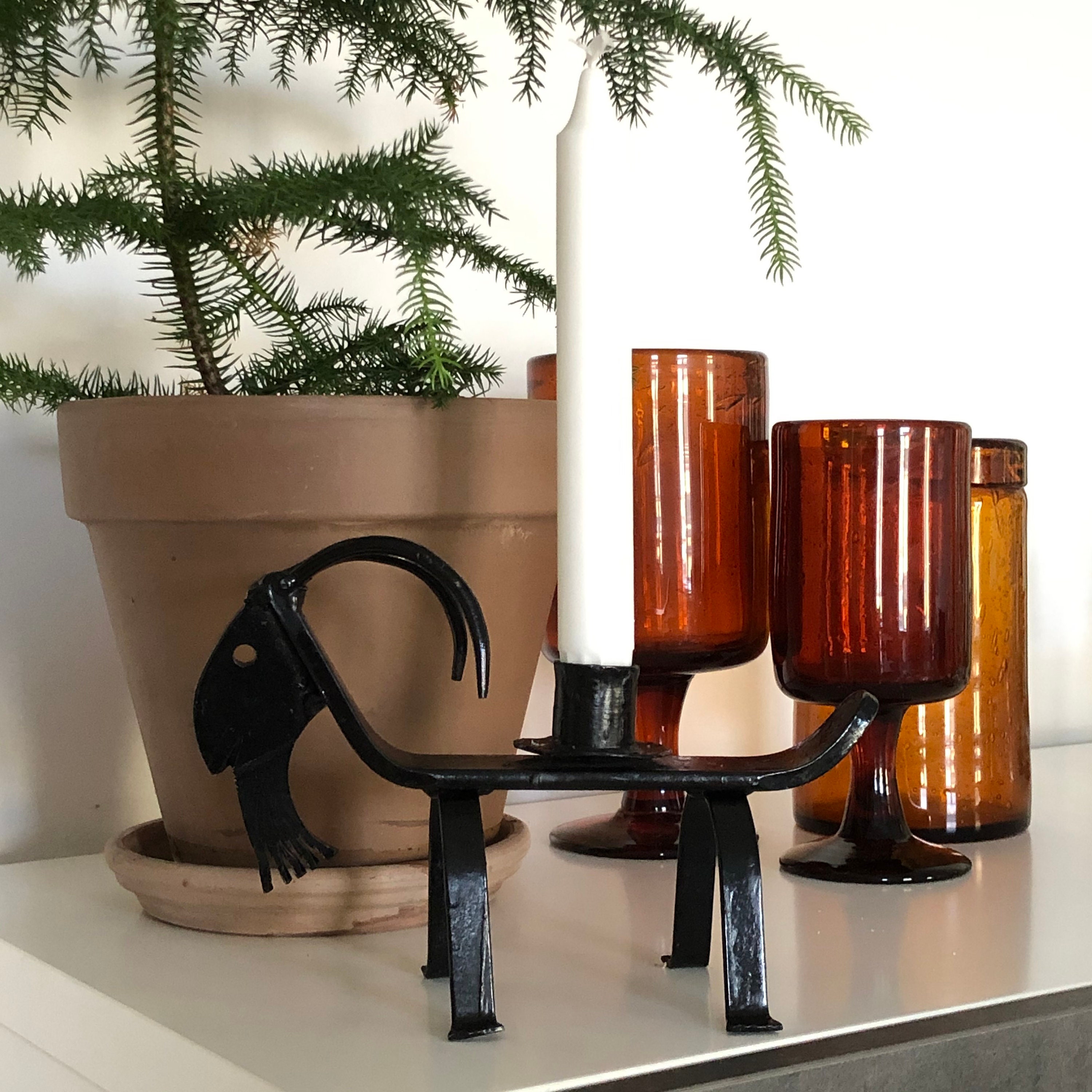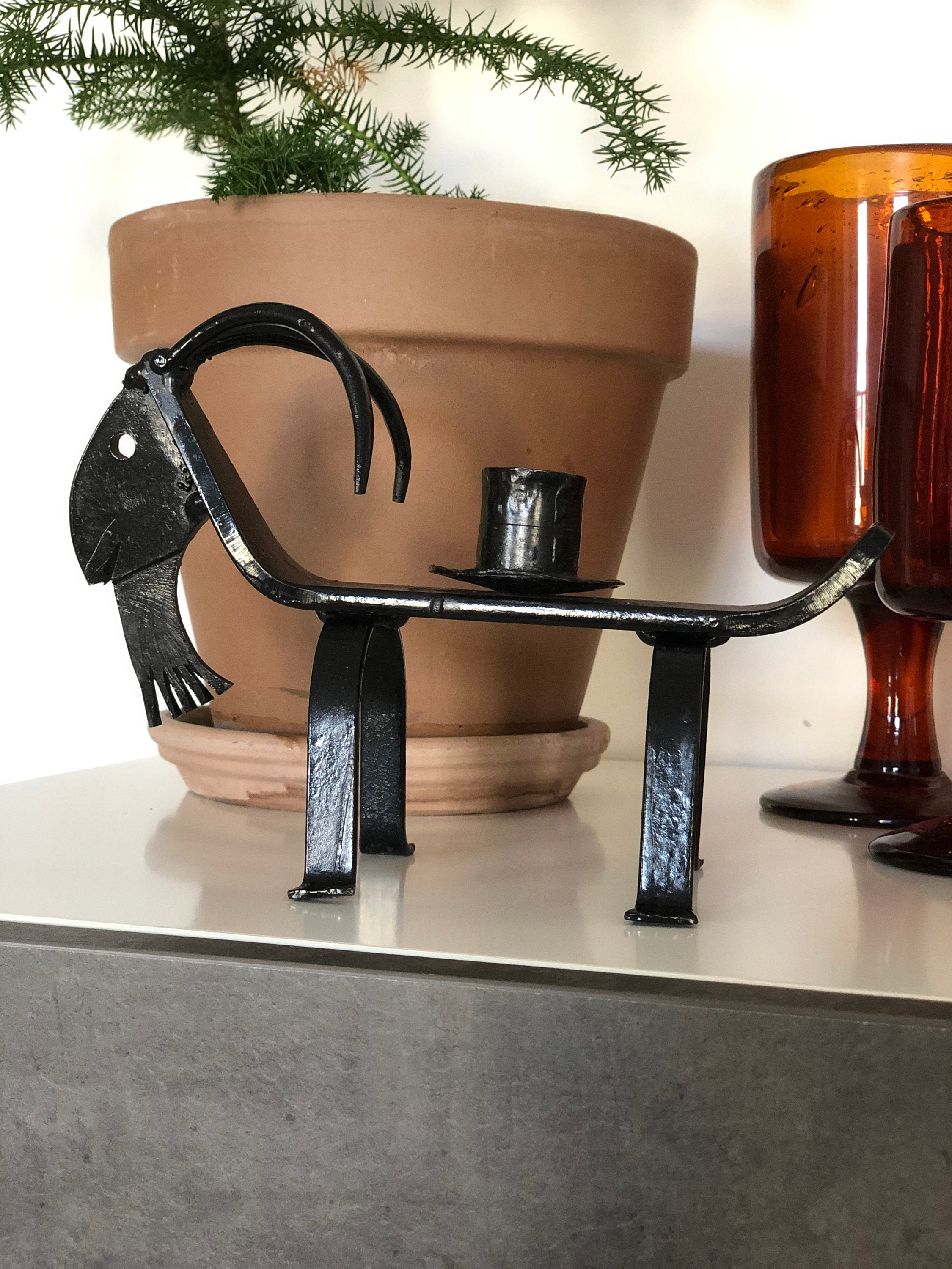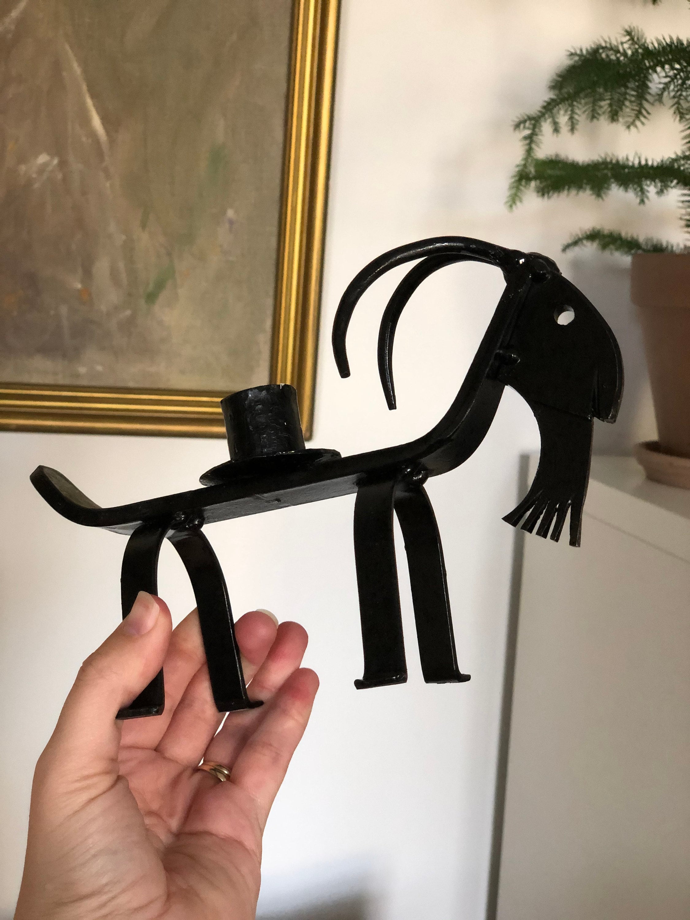 This is a well made heavy metal Viking style handmade in Sweden Christmas goat candle holder. They fit tapered candles and will make a great centerpiece on your table or even in an outdoor space.