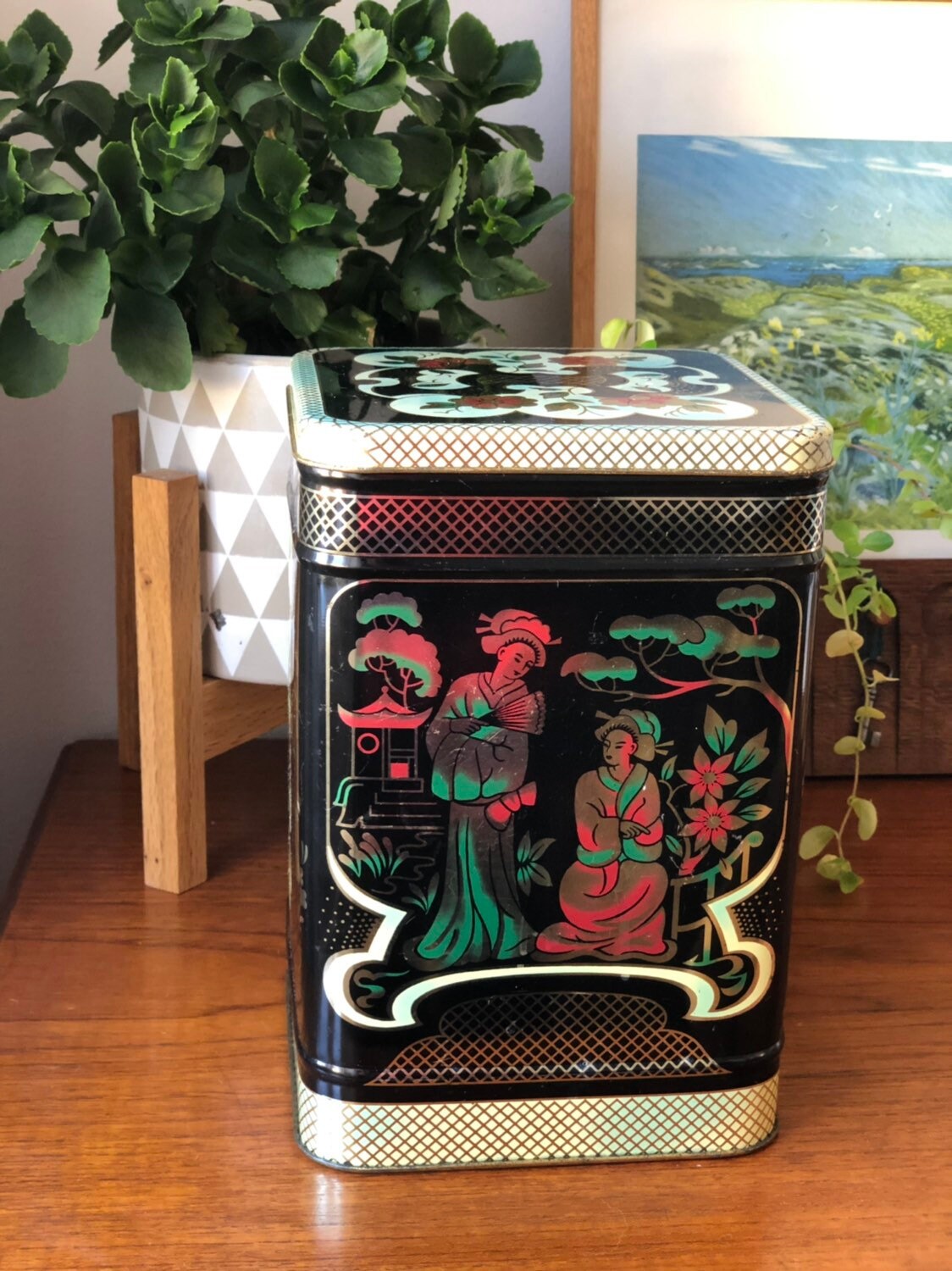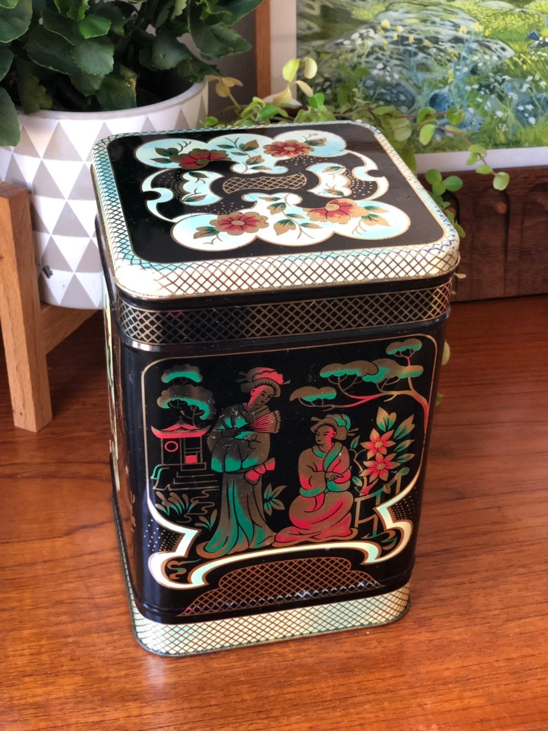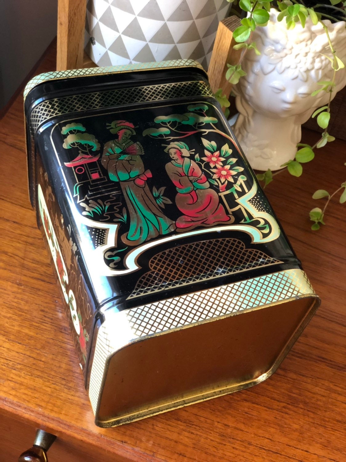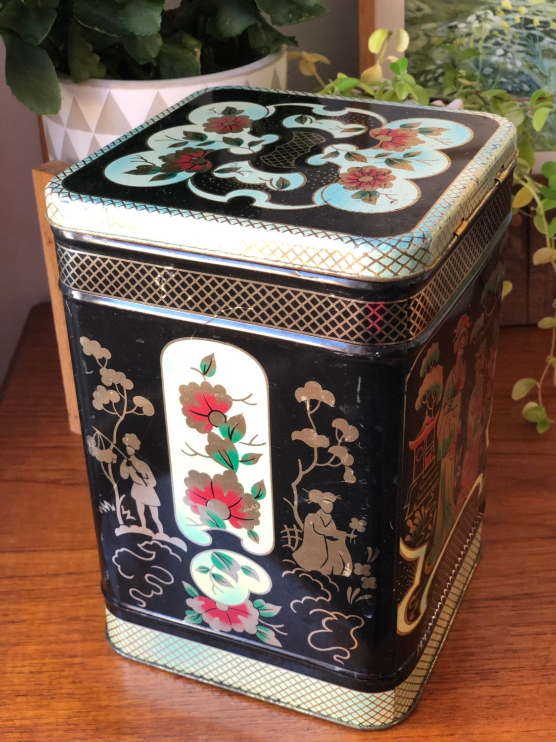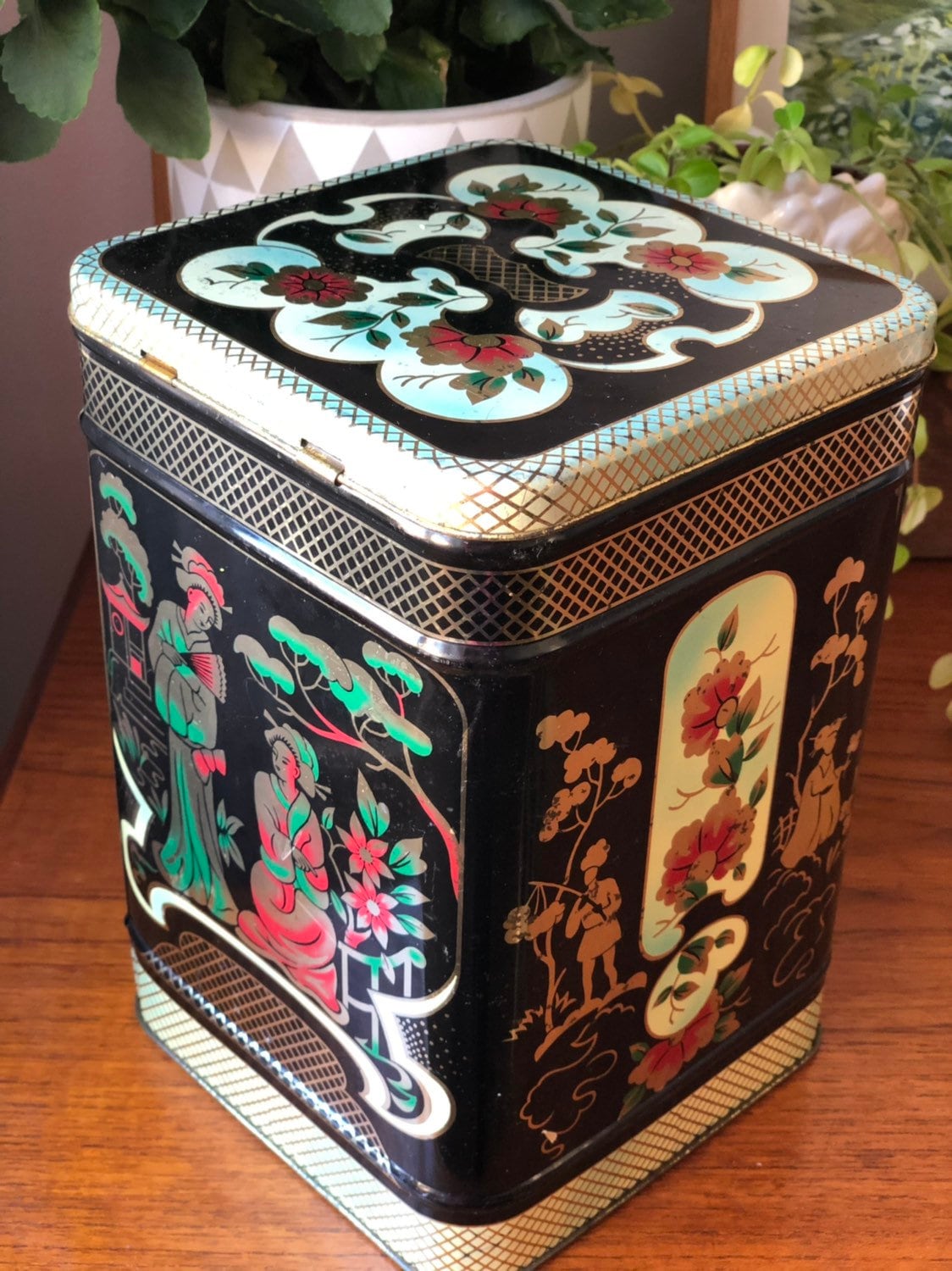 Tea Tin/England/Large Chinese chinoiserie tin/vintage