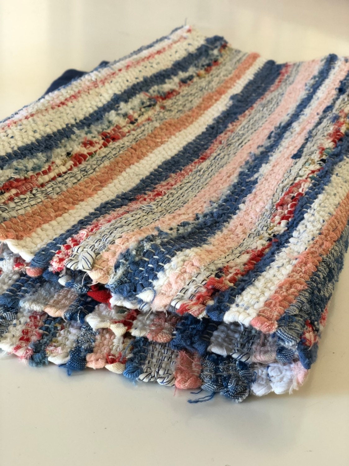 This is a vintage handwoven Scandinavian rag rug table runner with a traditional Scandinavian colors.