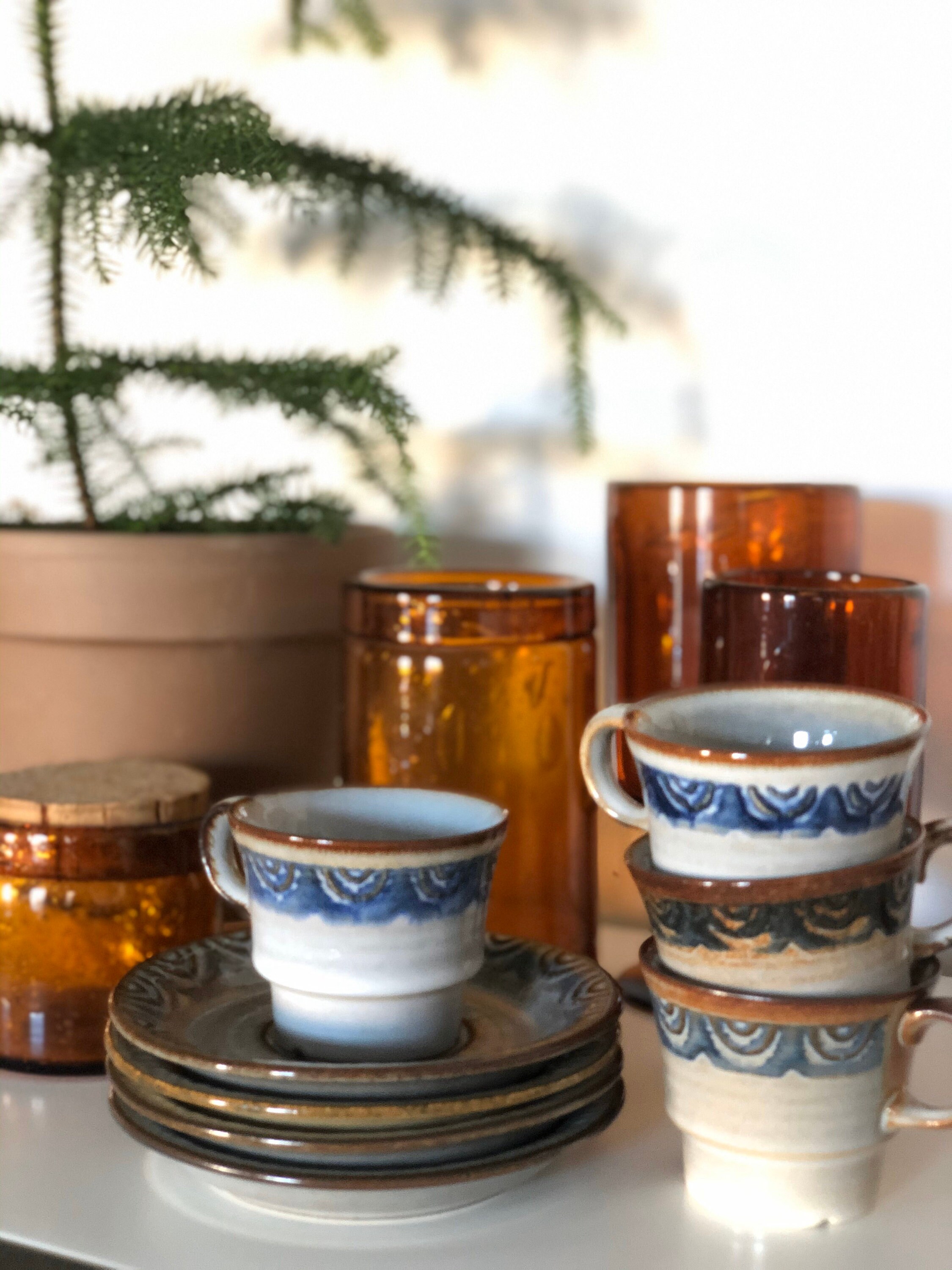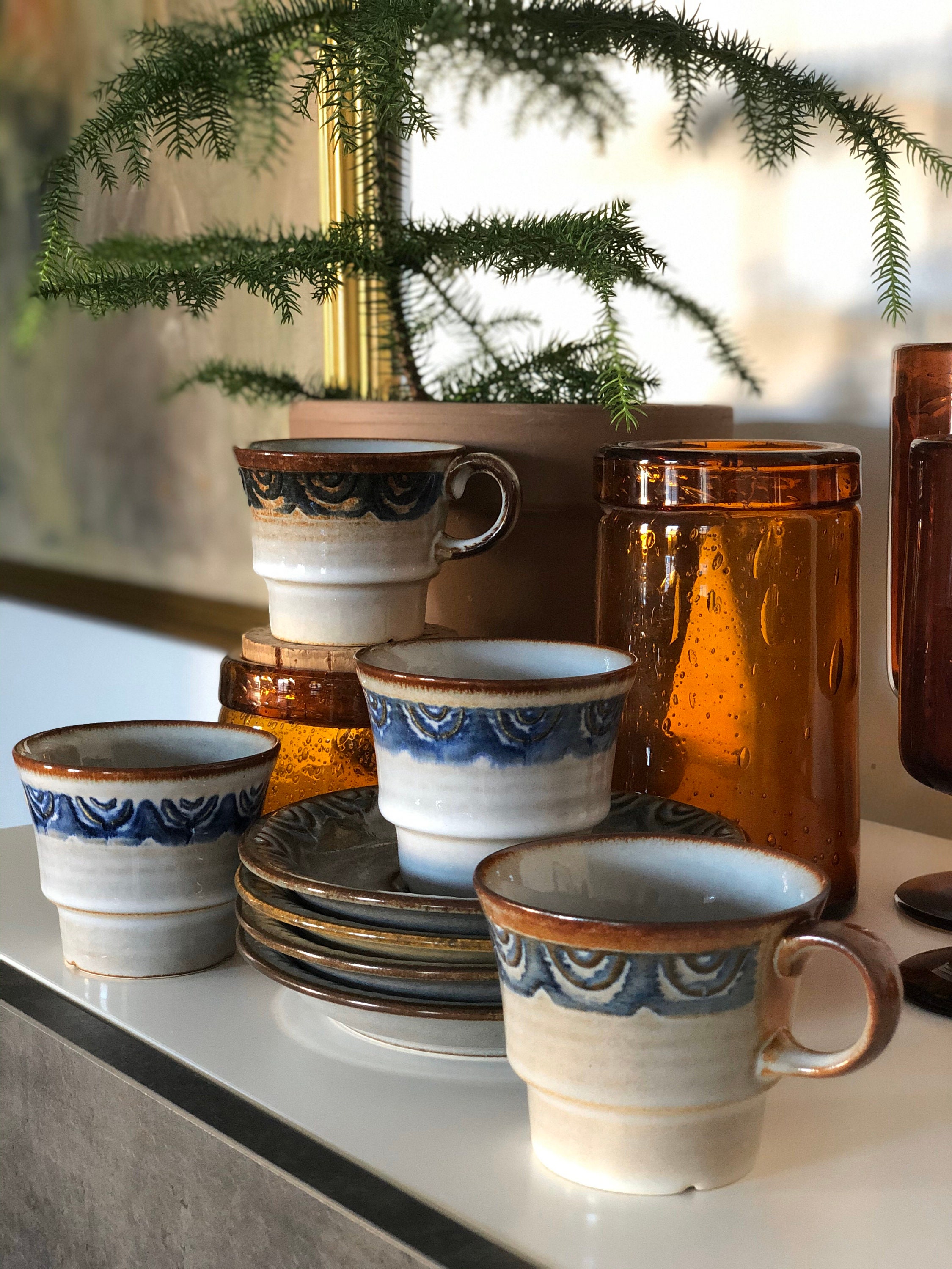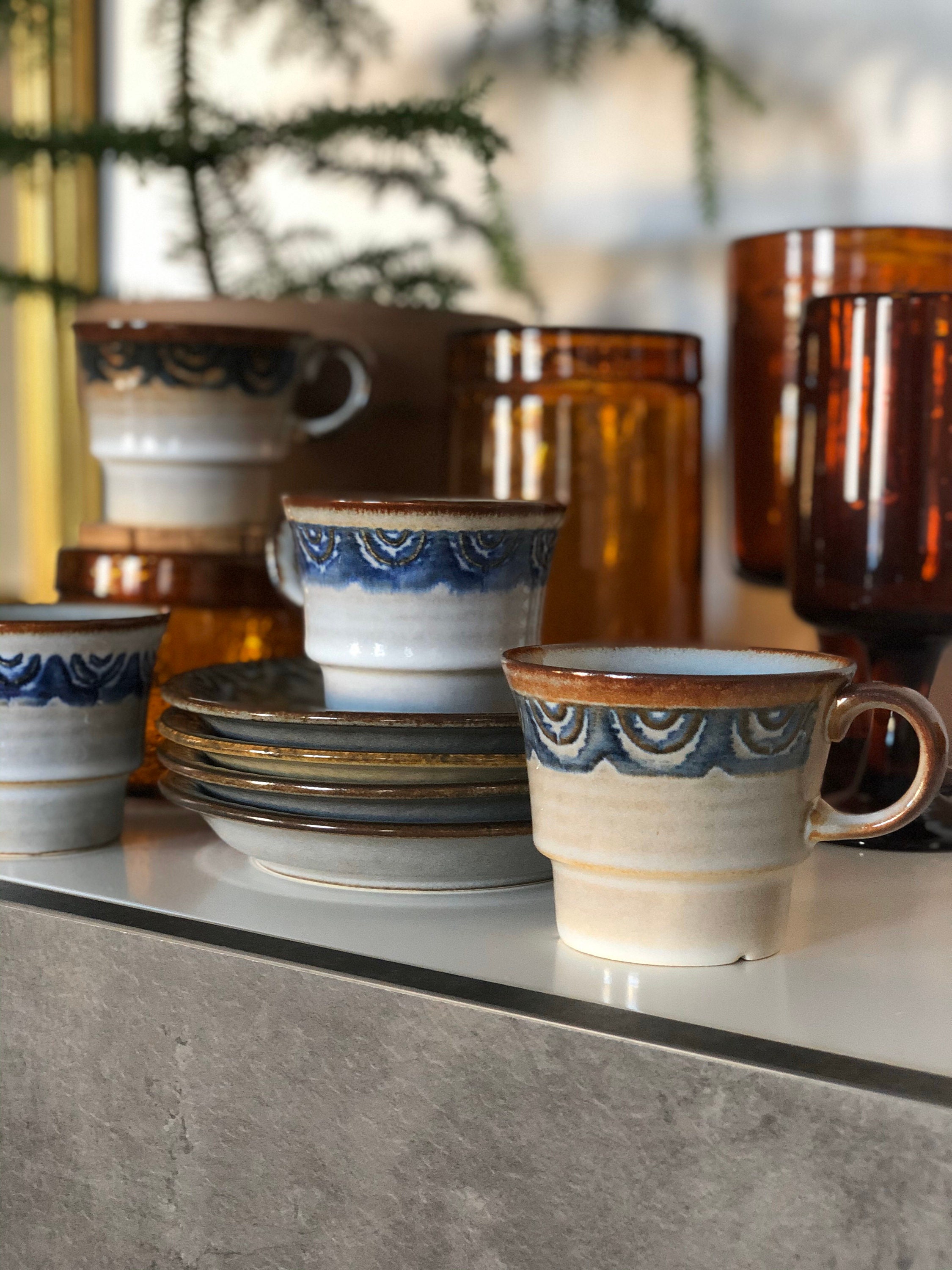 This is a vintage set of 4 Danish cups and saucers by Soholm pottery company from the Rotna series designed by Arne Finne.