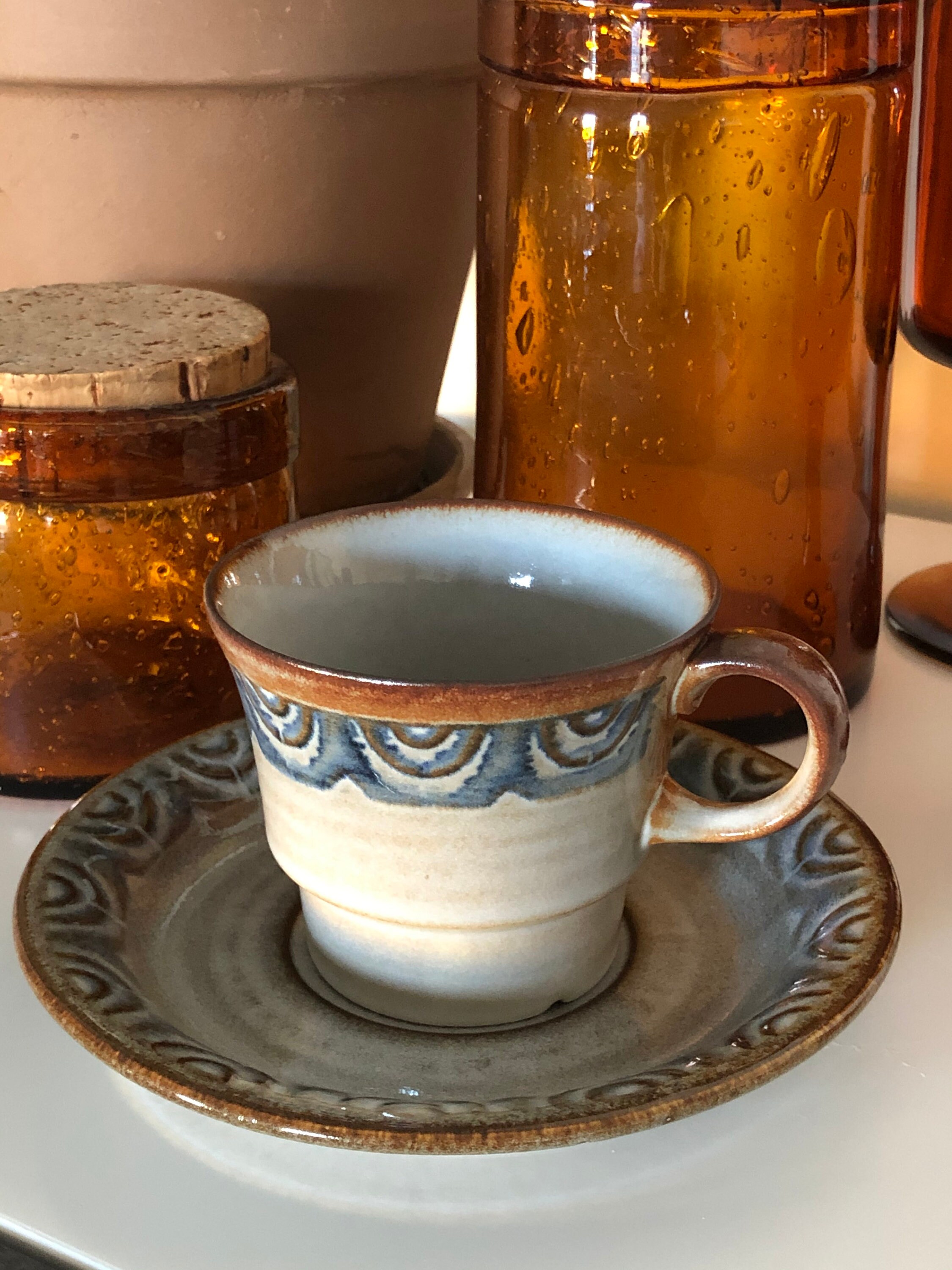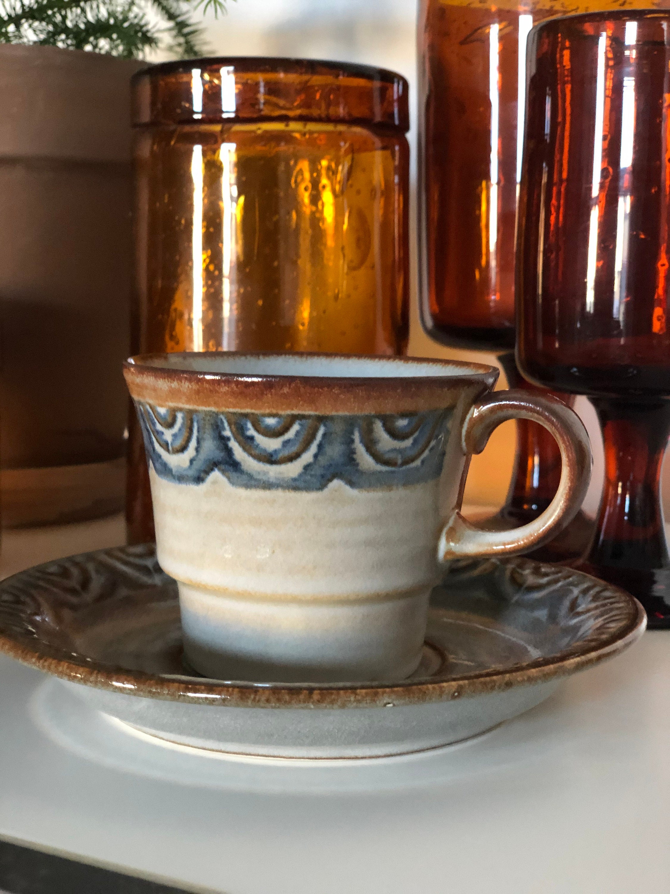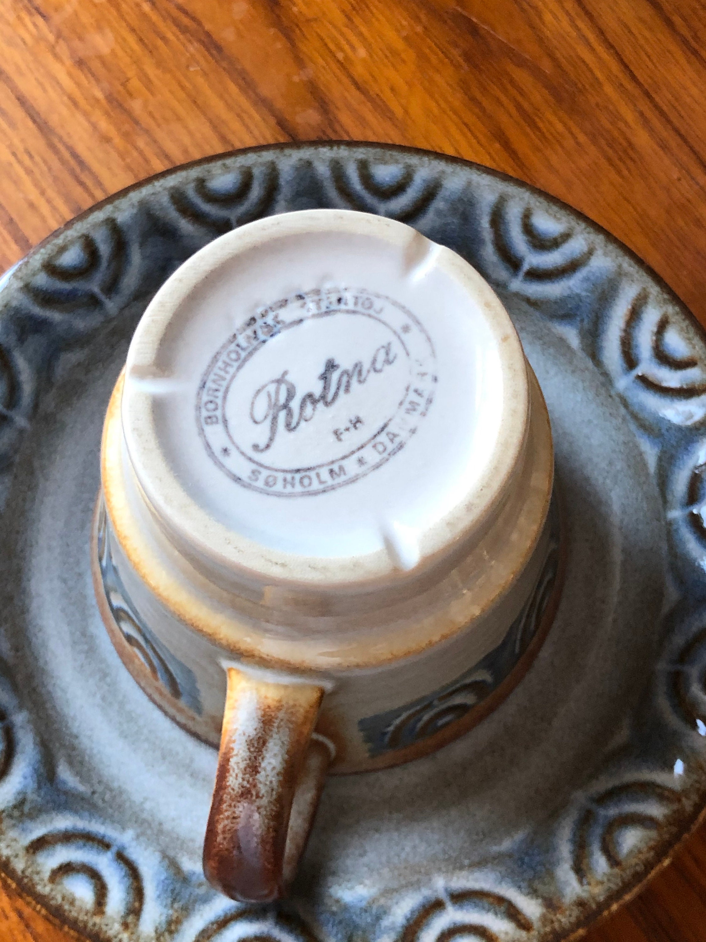 This is a vintage set of 4 Danish cups and saucers by Soholm pottery company from the Rotna series designed by Arne Finne.