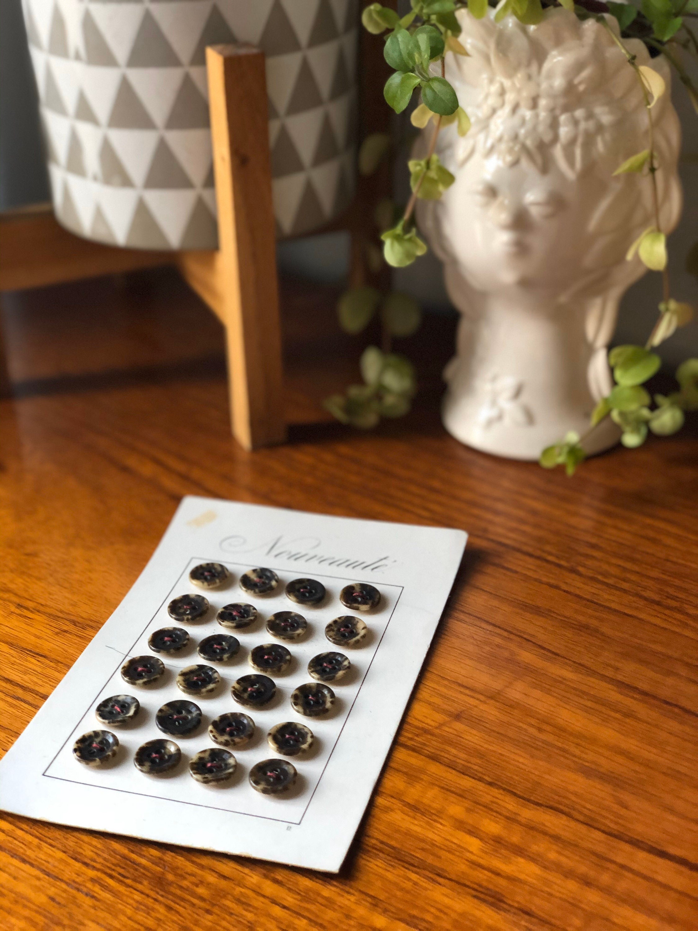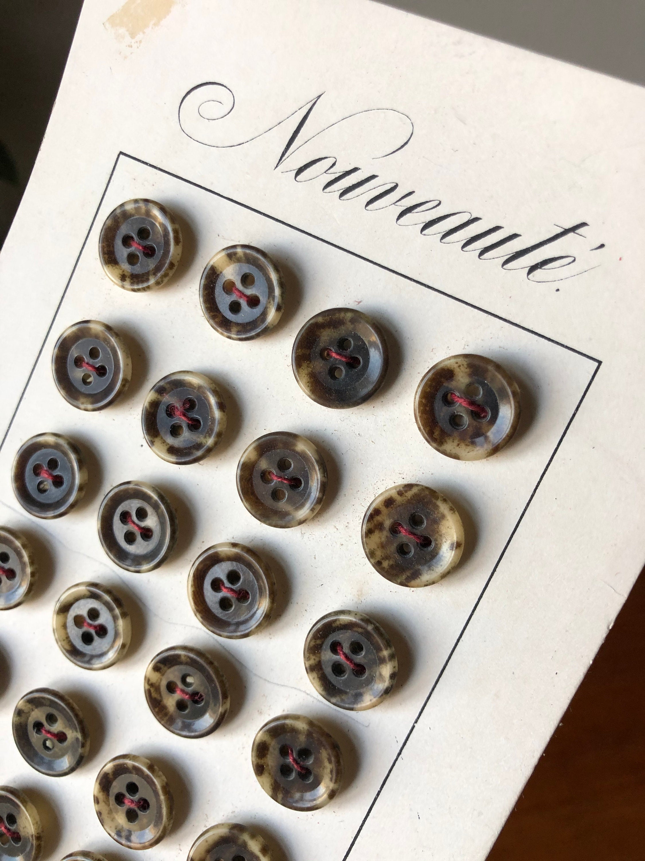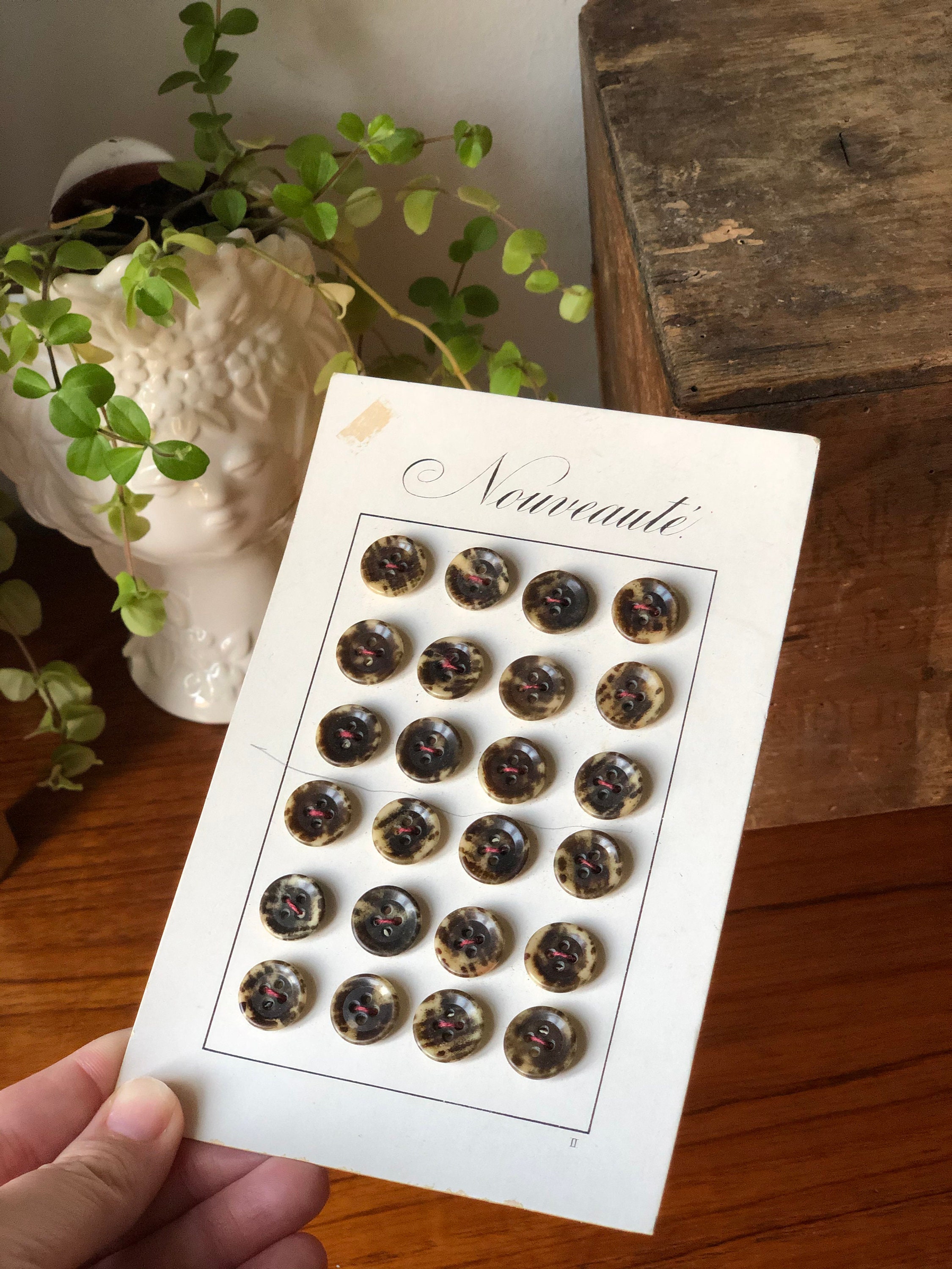 This is a set of 24 never used 1940s buttons from Paris France still on original card. They have a beautiful speckled pattern.