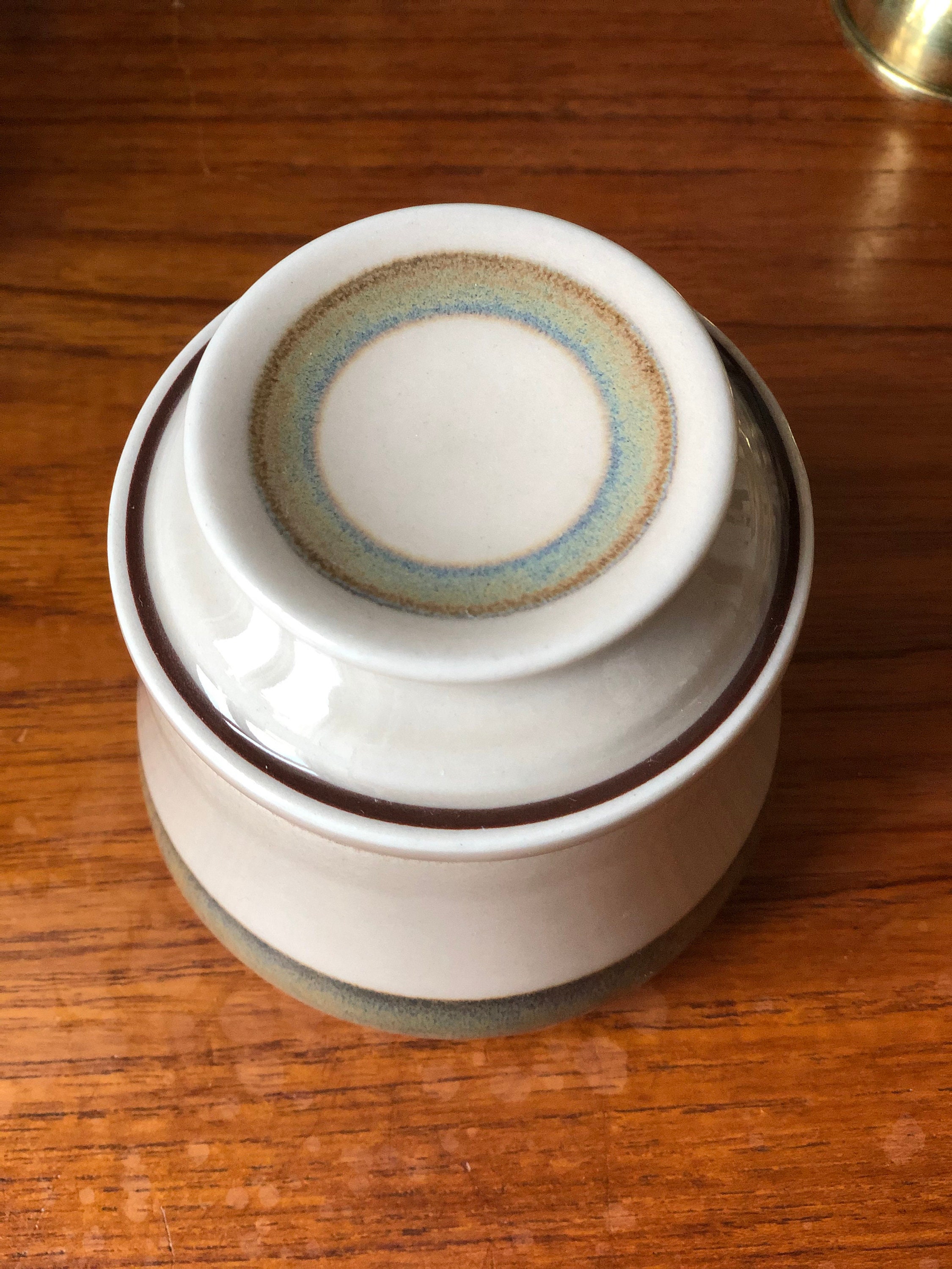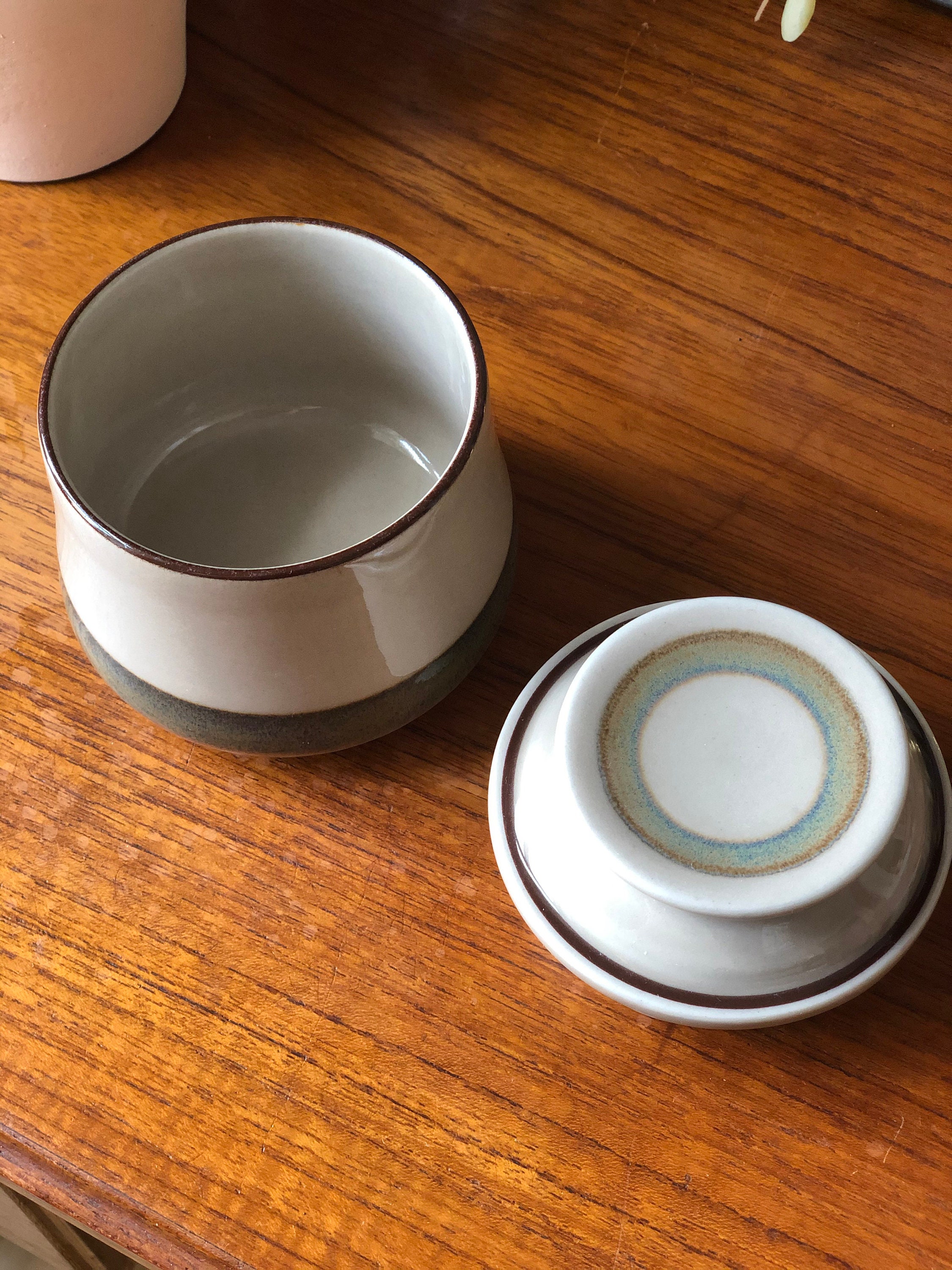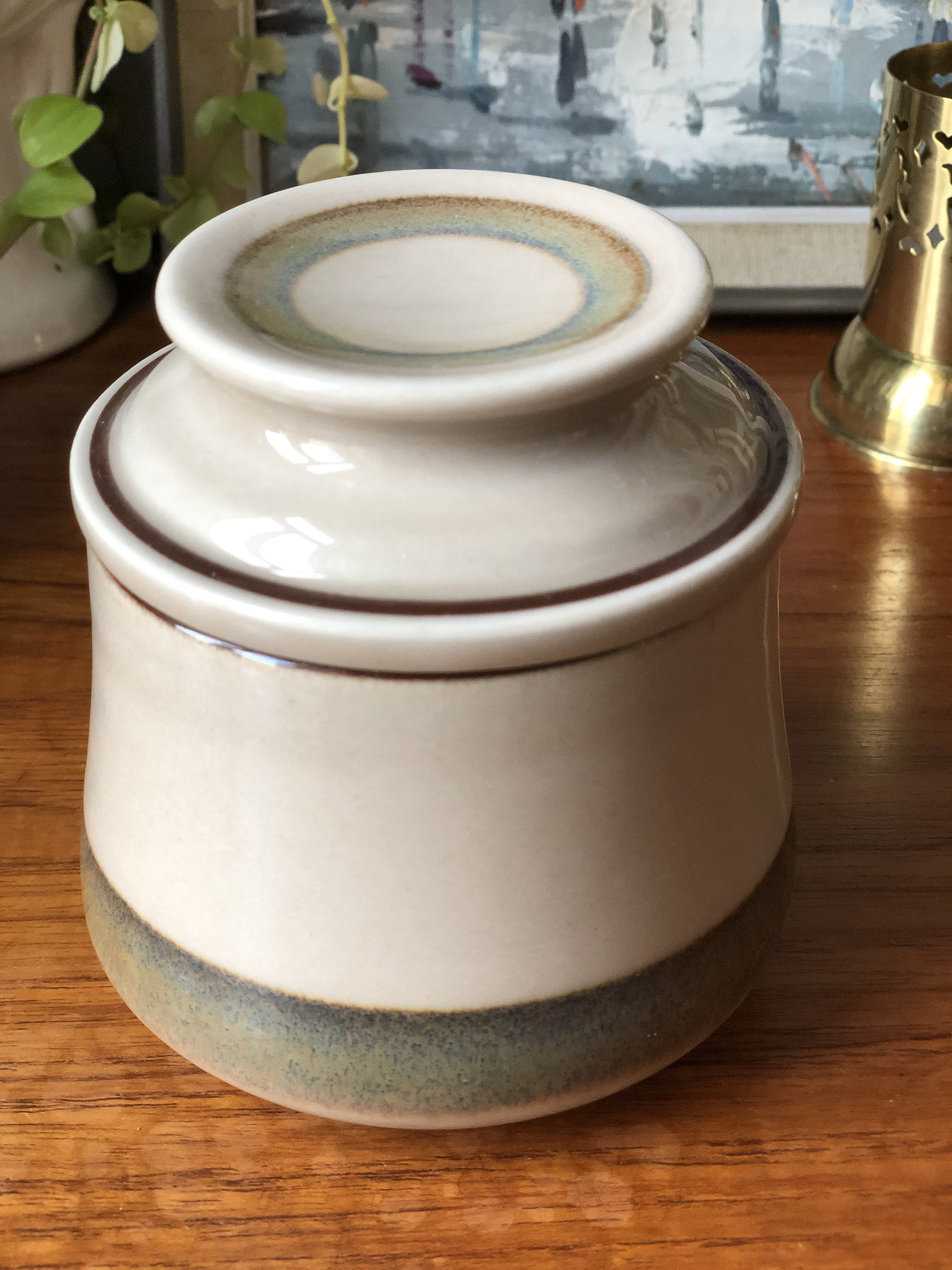 This is a vintage B&G stoneware Danish lidded jar / sugar bowl from the Peru series decorated with a large light brown stripe.