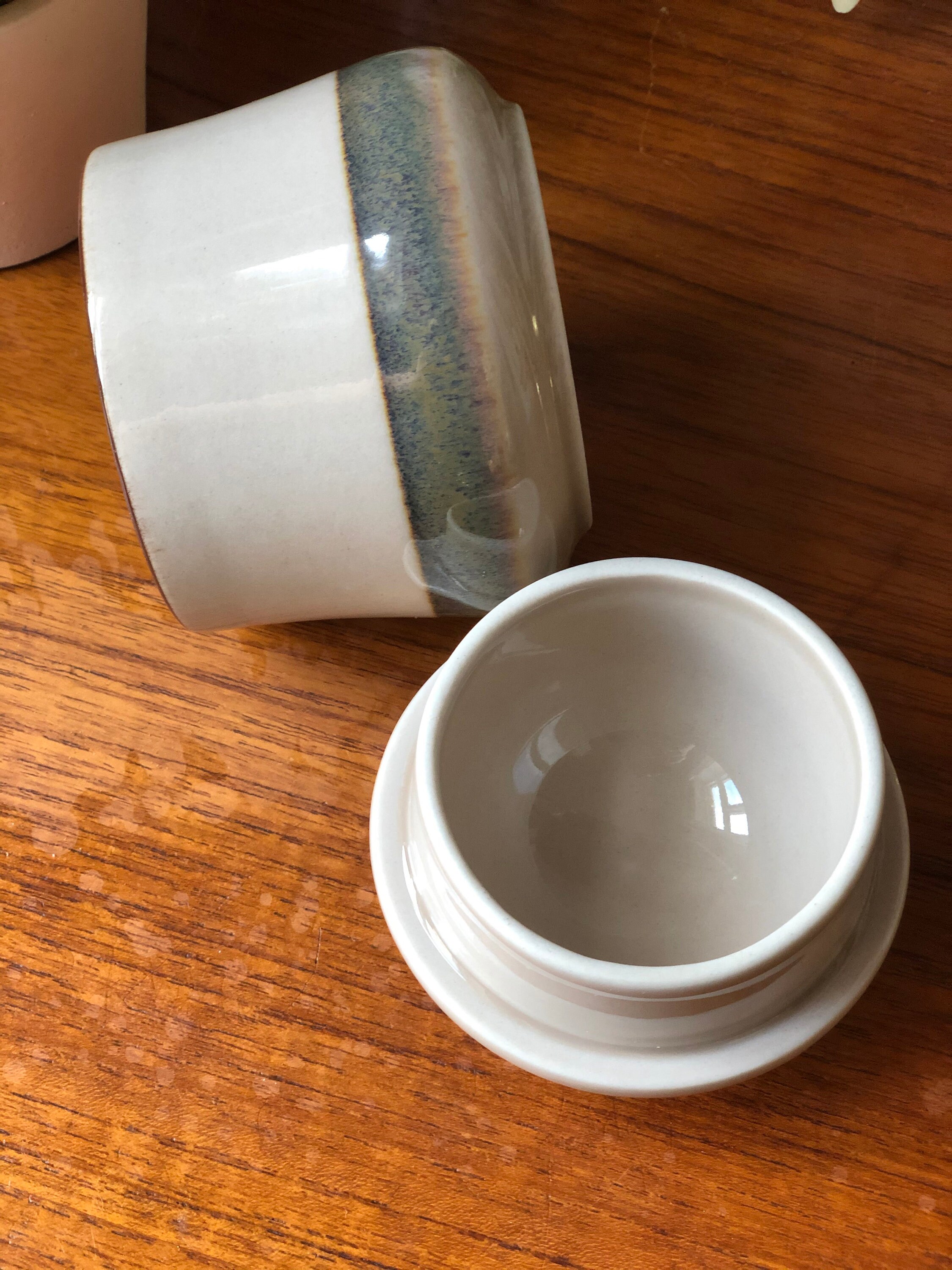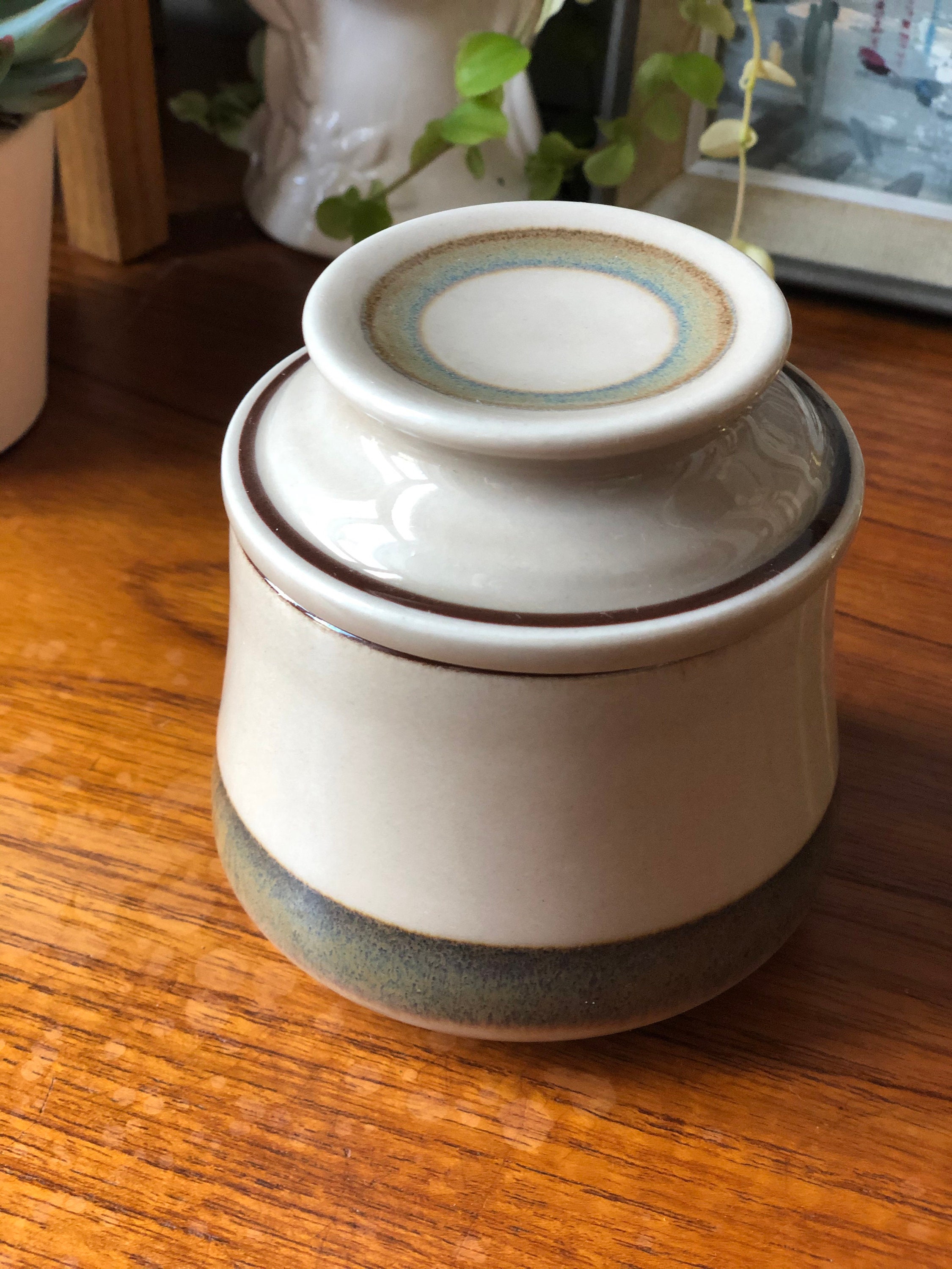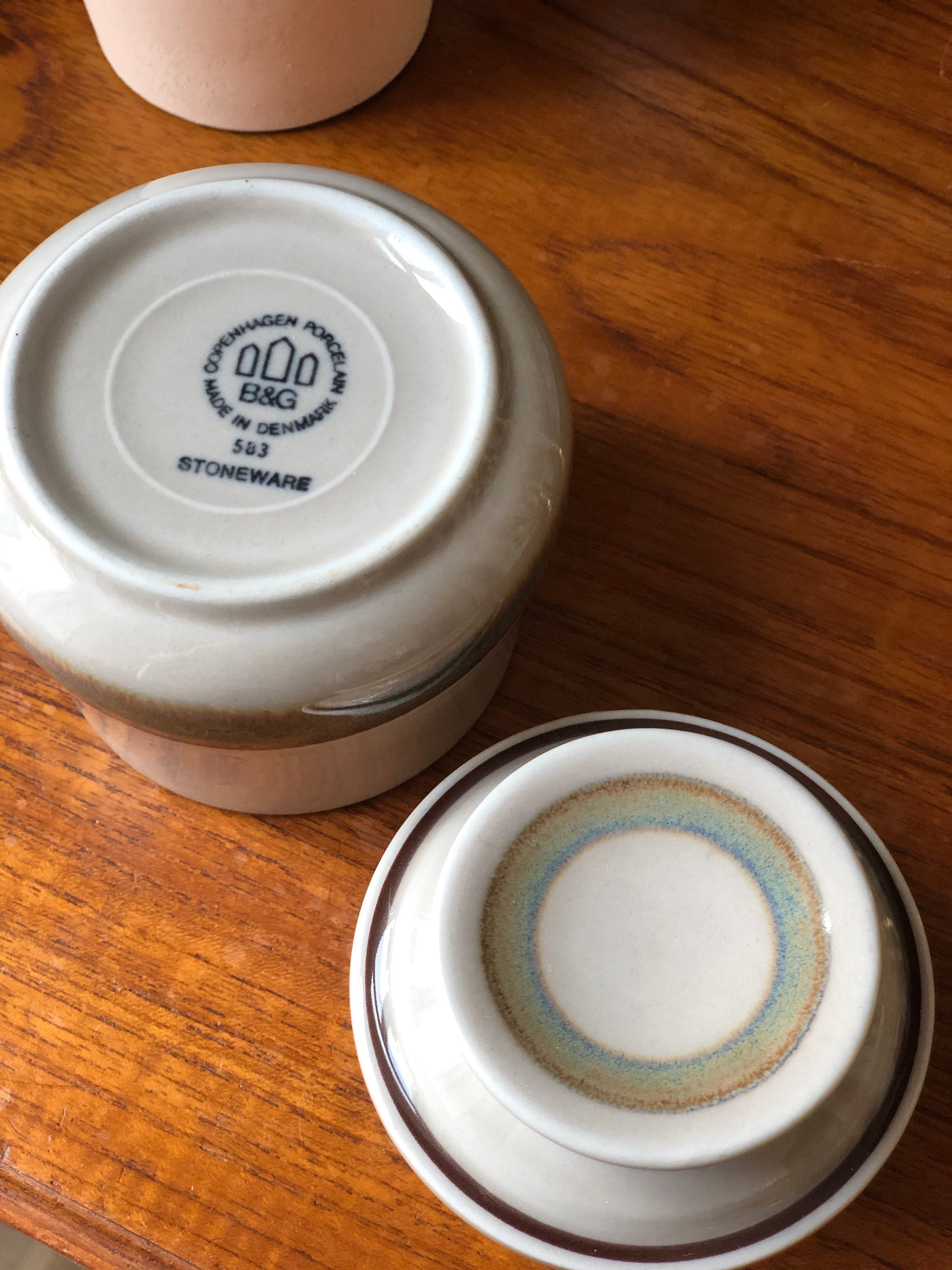 This is a vintage B&G stoneware Danish lidded jar / sugar bowl from the Peru series decorated with a large light brown stripe.