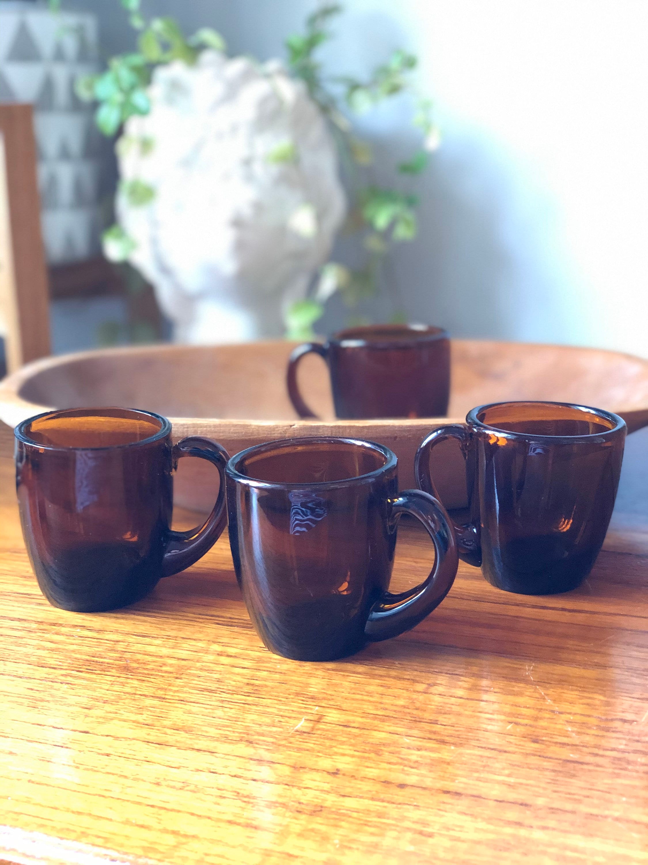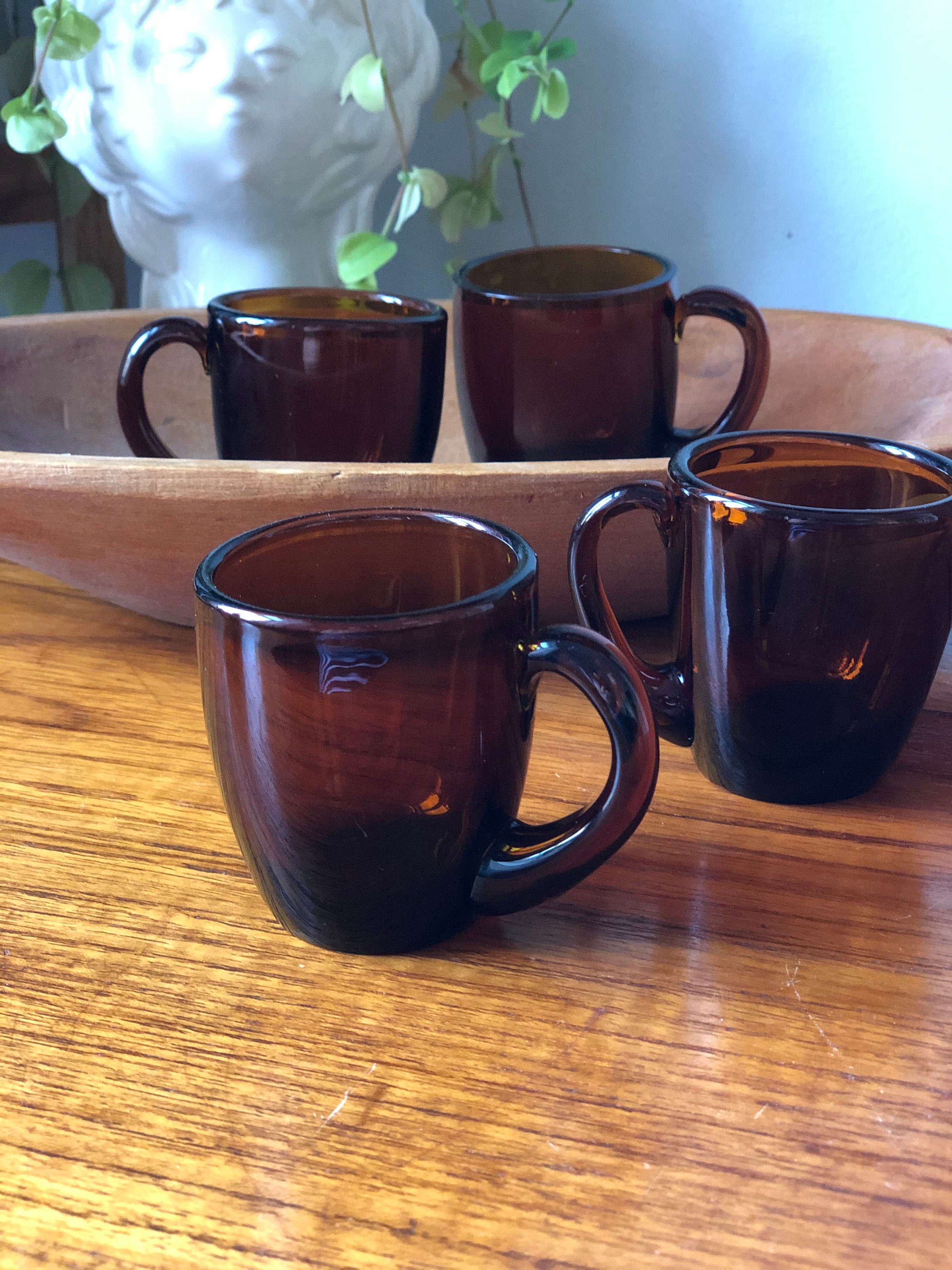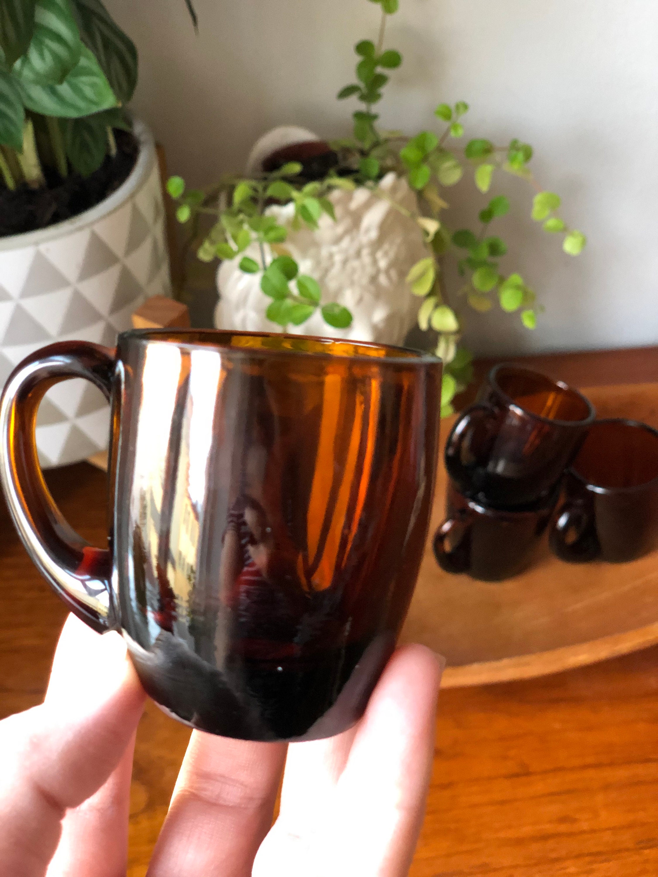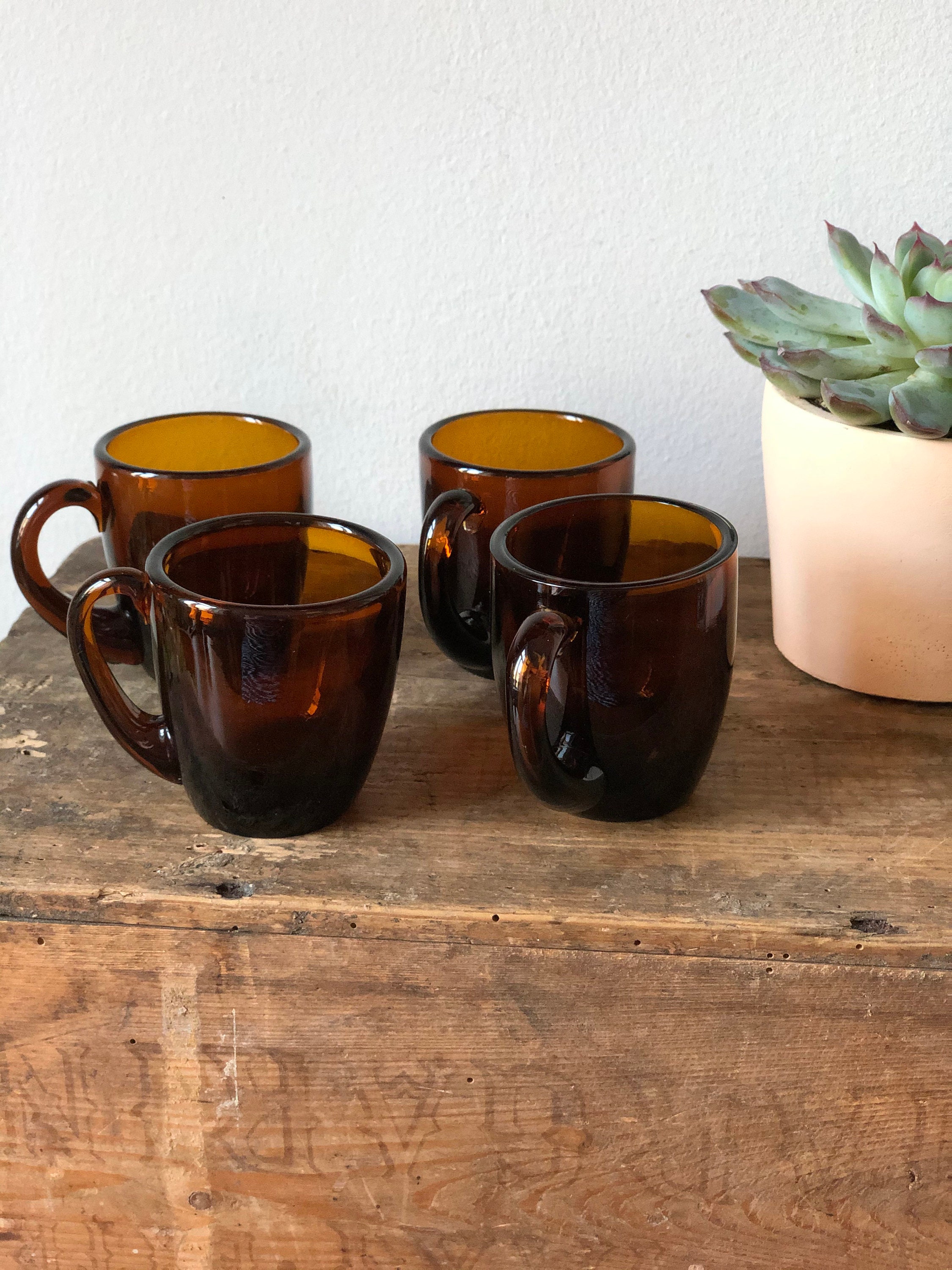They are handblown amber glass with a handle. These glasses are a great example of Scandinavian quality glass. They are so retro and will look great on display as well as when you are using them.