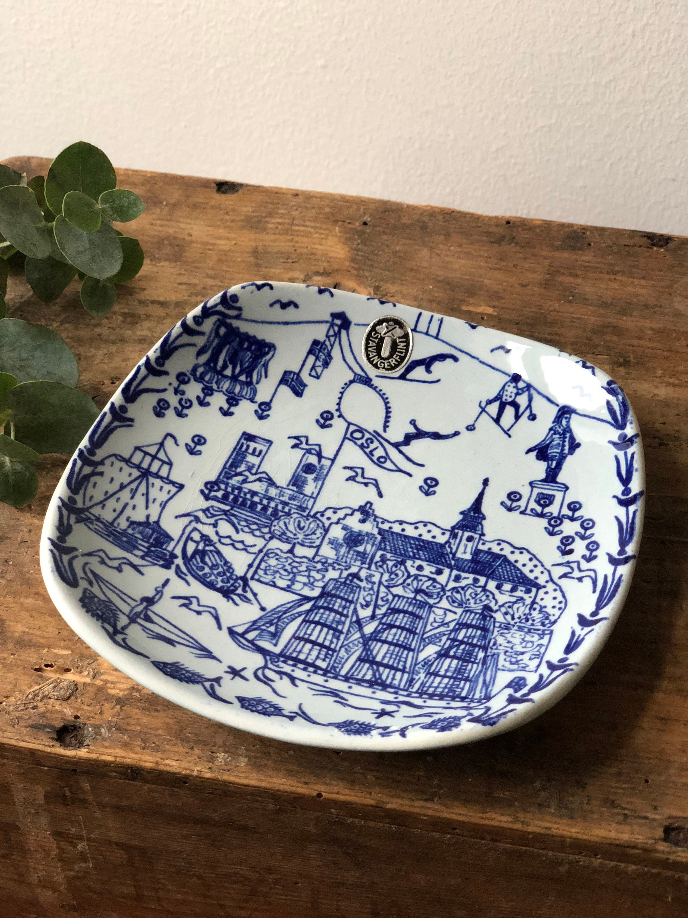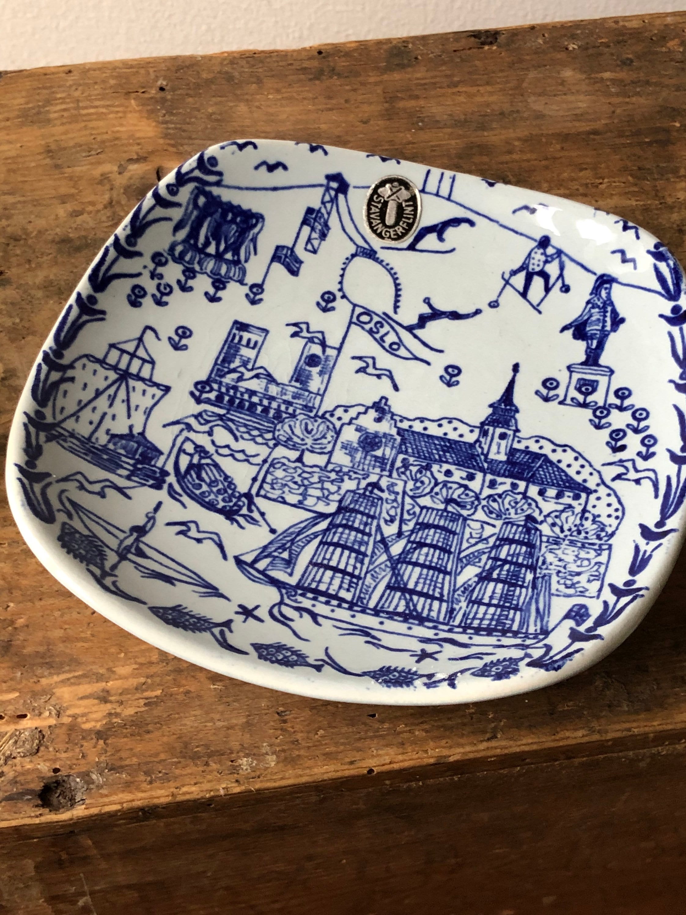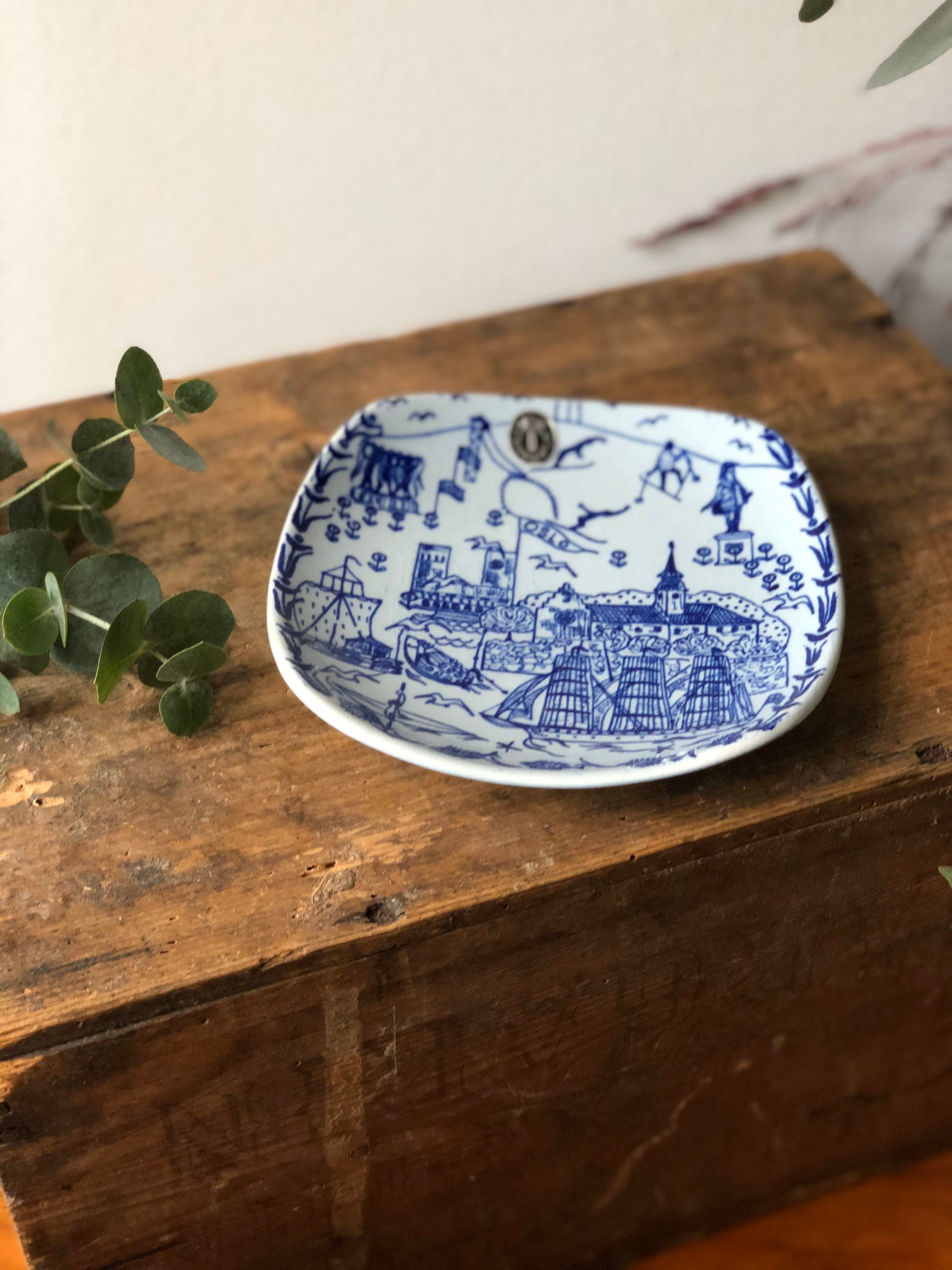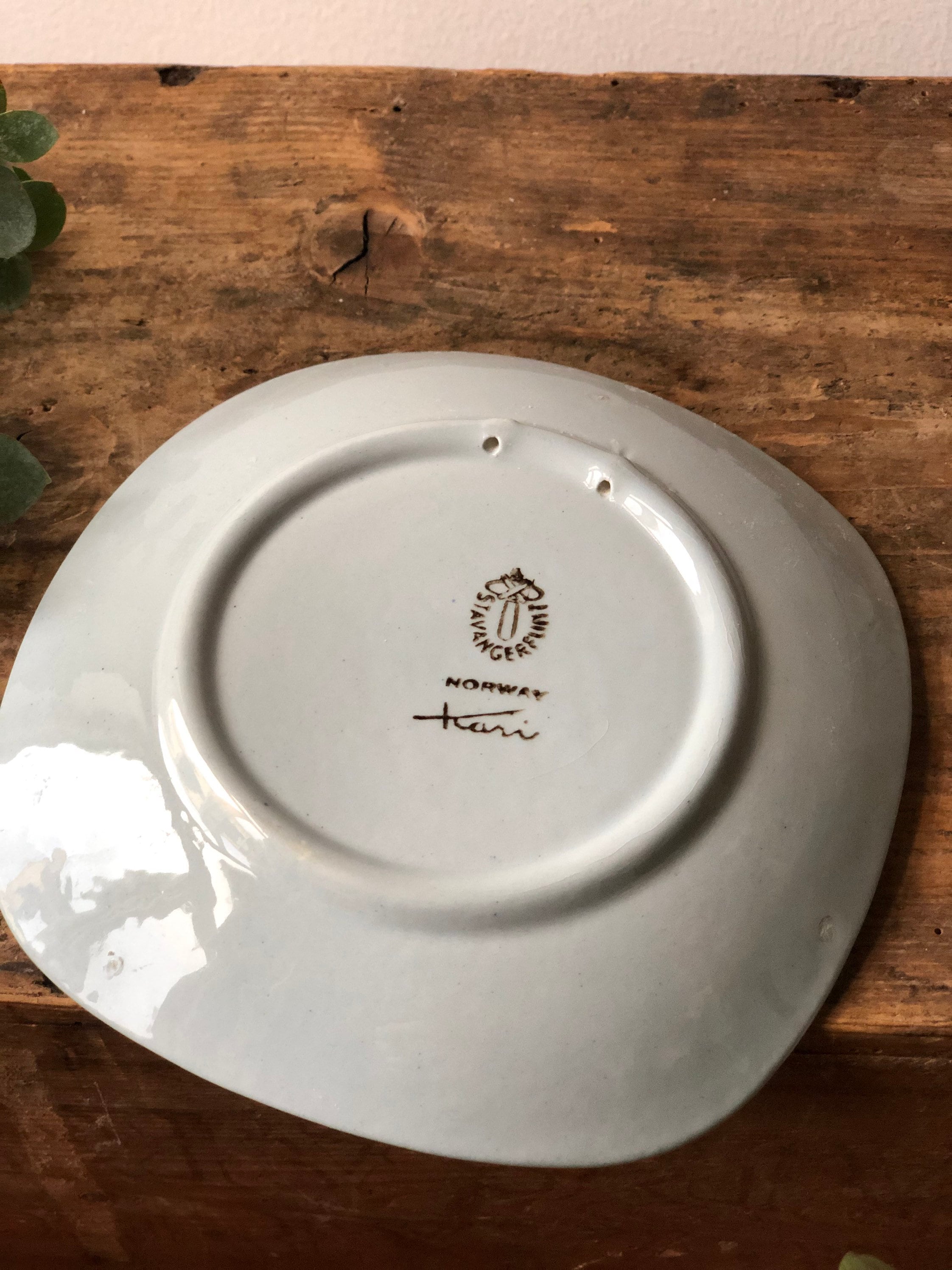 This is a lovely Stavangerflint trinket plate designed by Kari Nyquist, Norway. It is a light blue color with darker blue detail. It is signed by the artist.