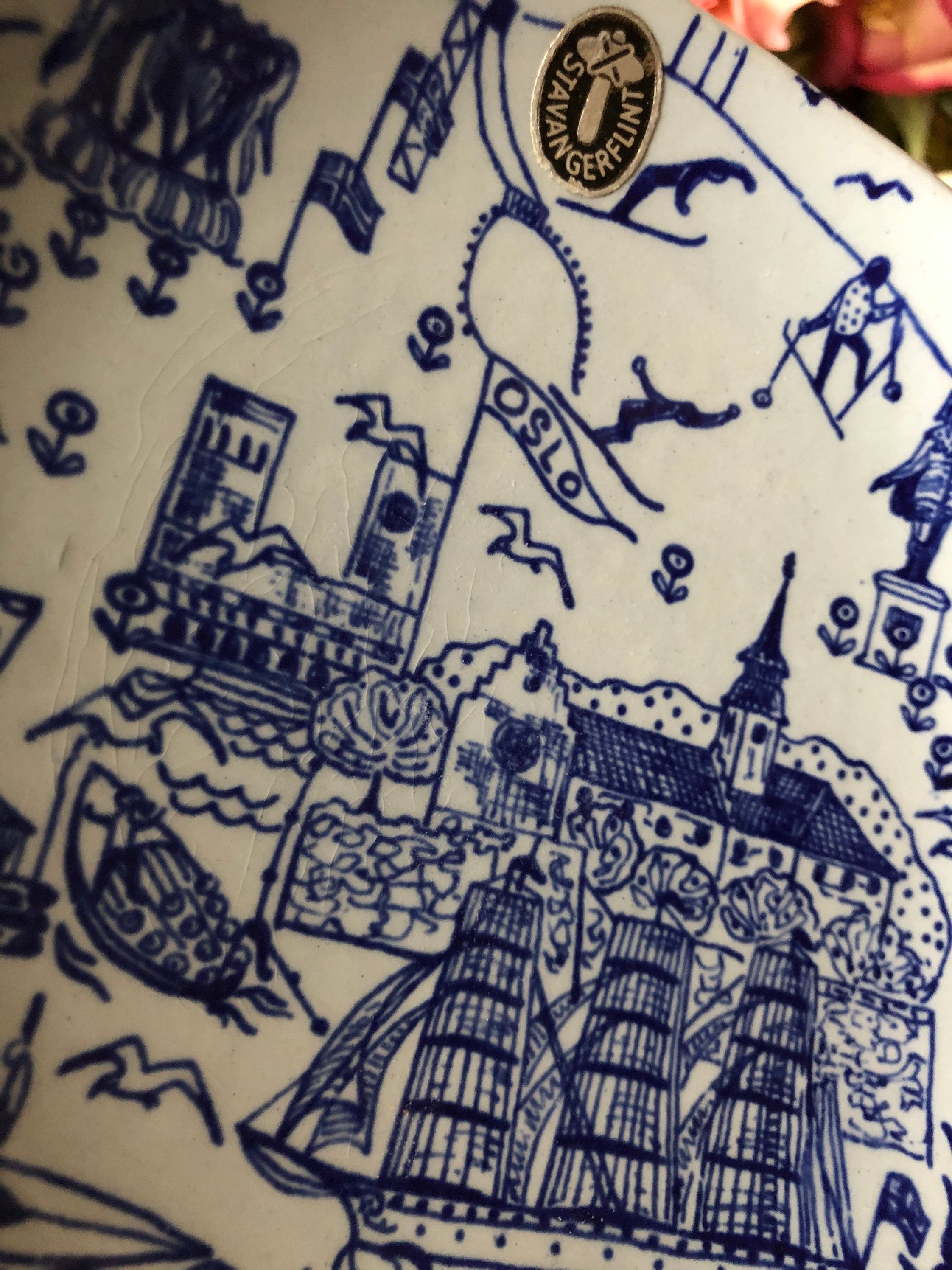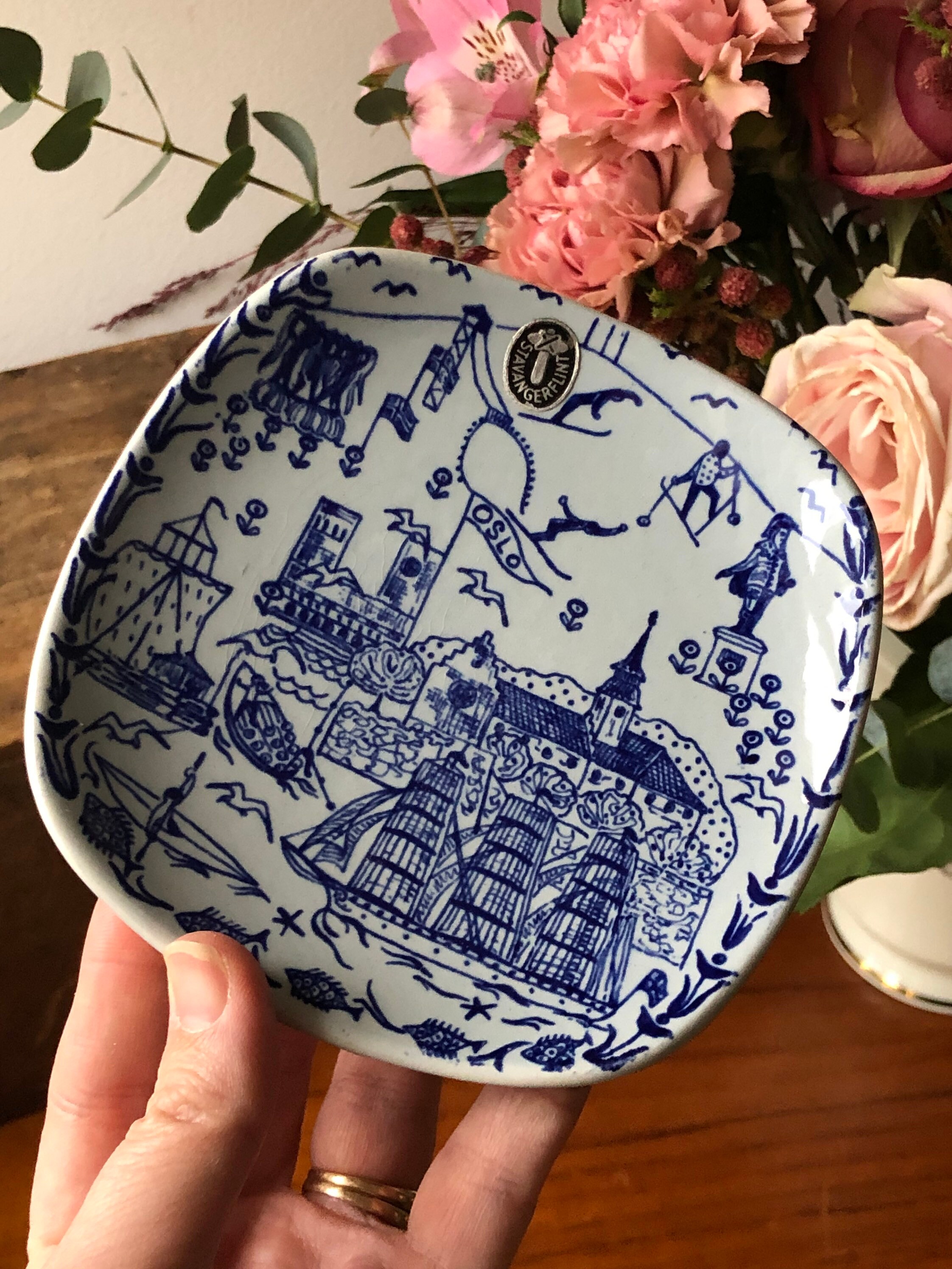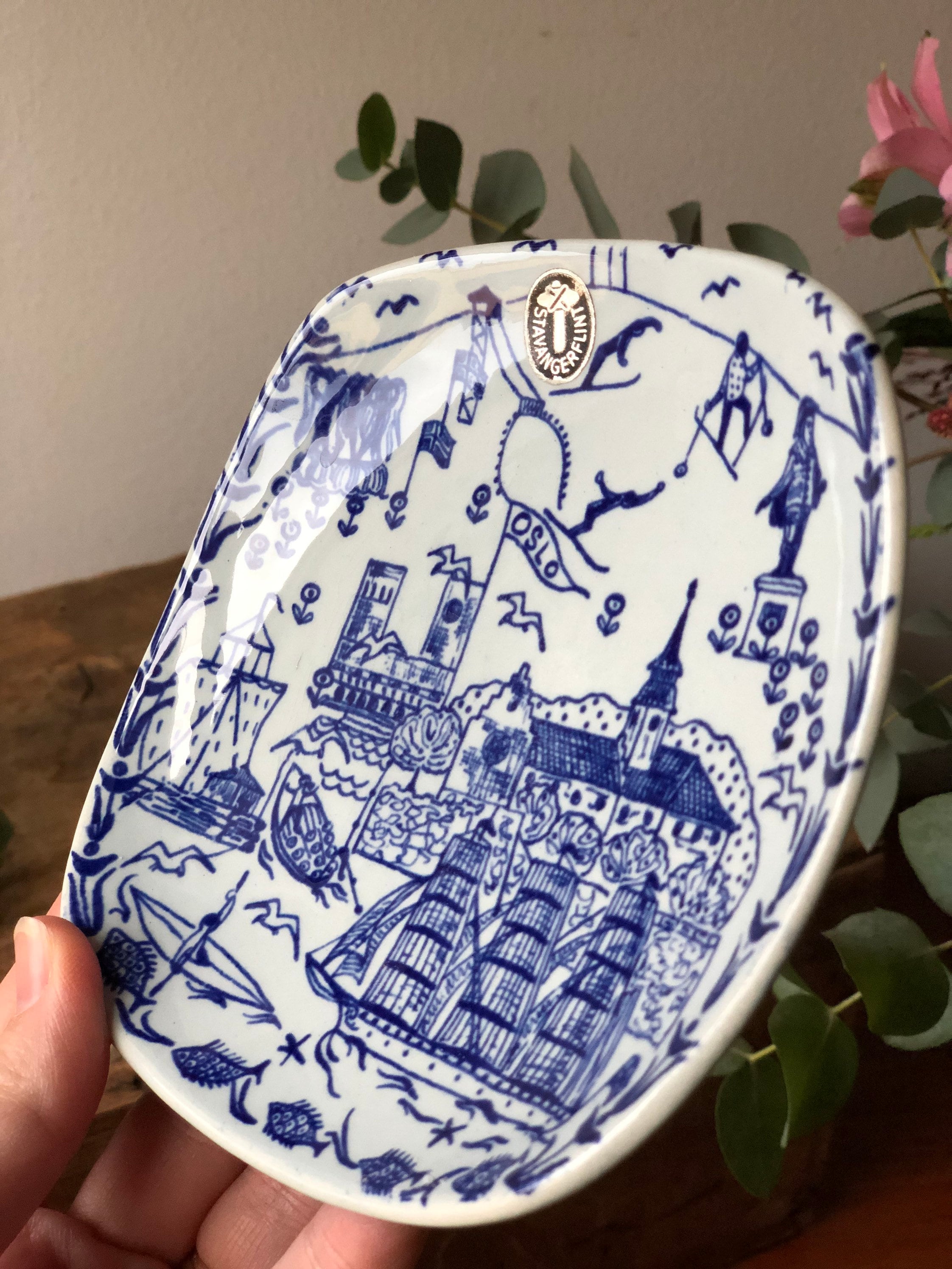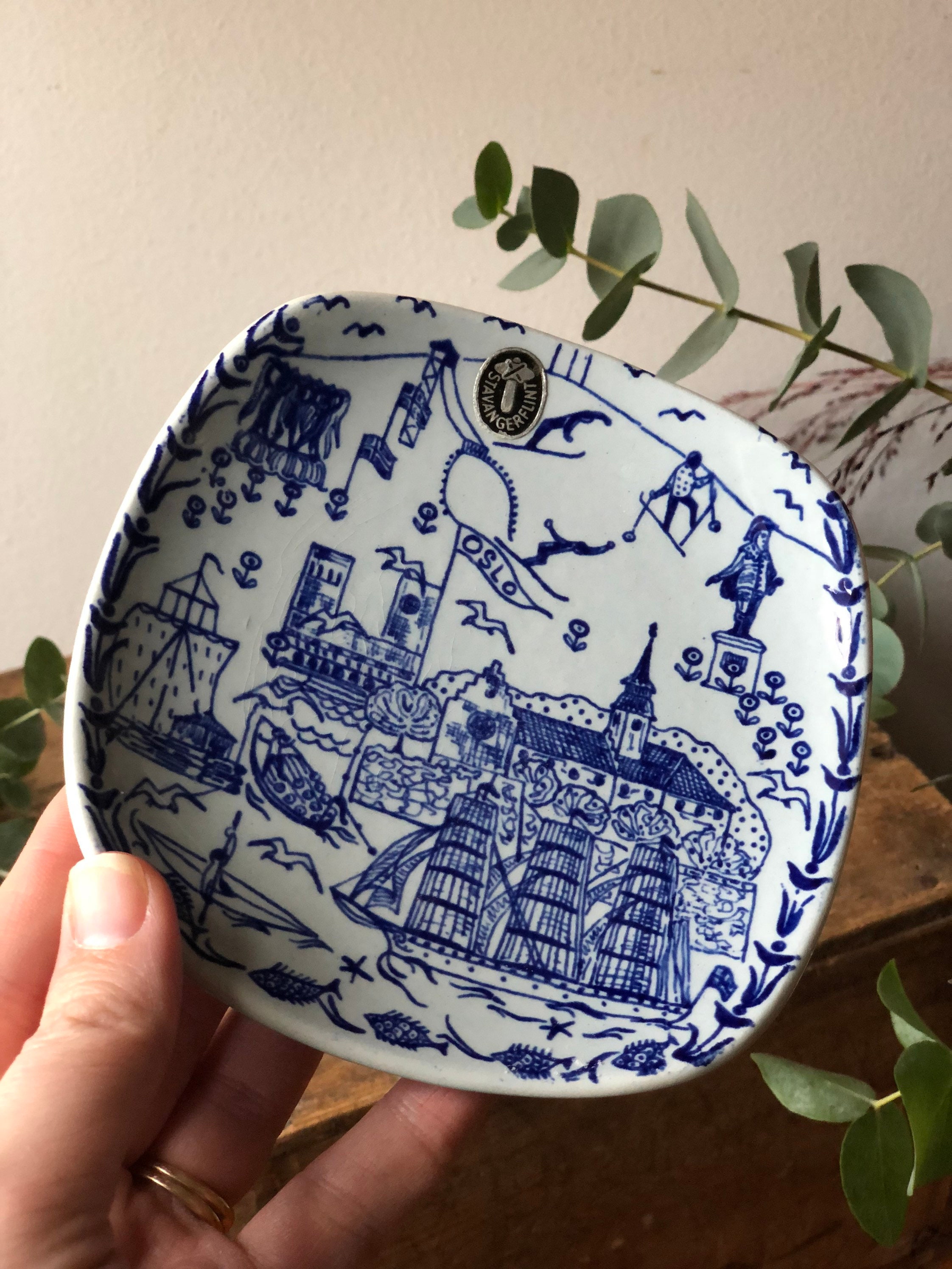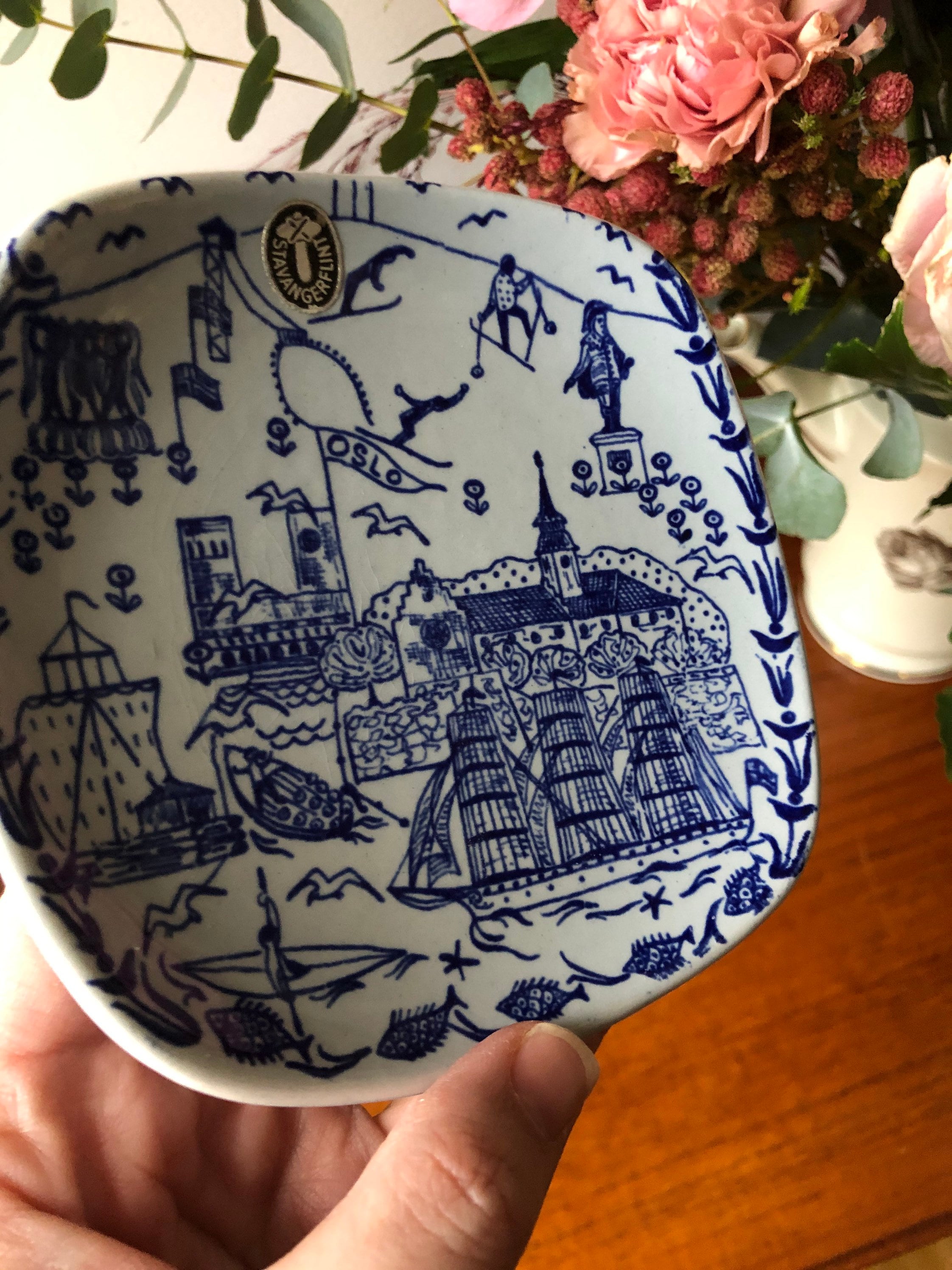 This is a lovely Stavangerflint trinket plate designed by Kari Nyquist, Norway. It is a light blue color with darker blue detail. It is signed by the artist.