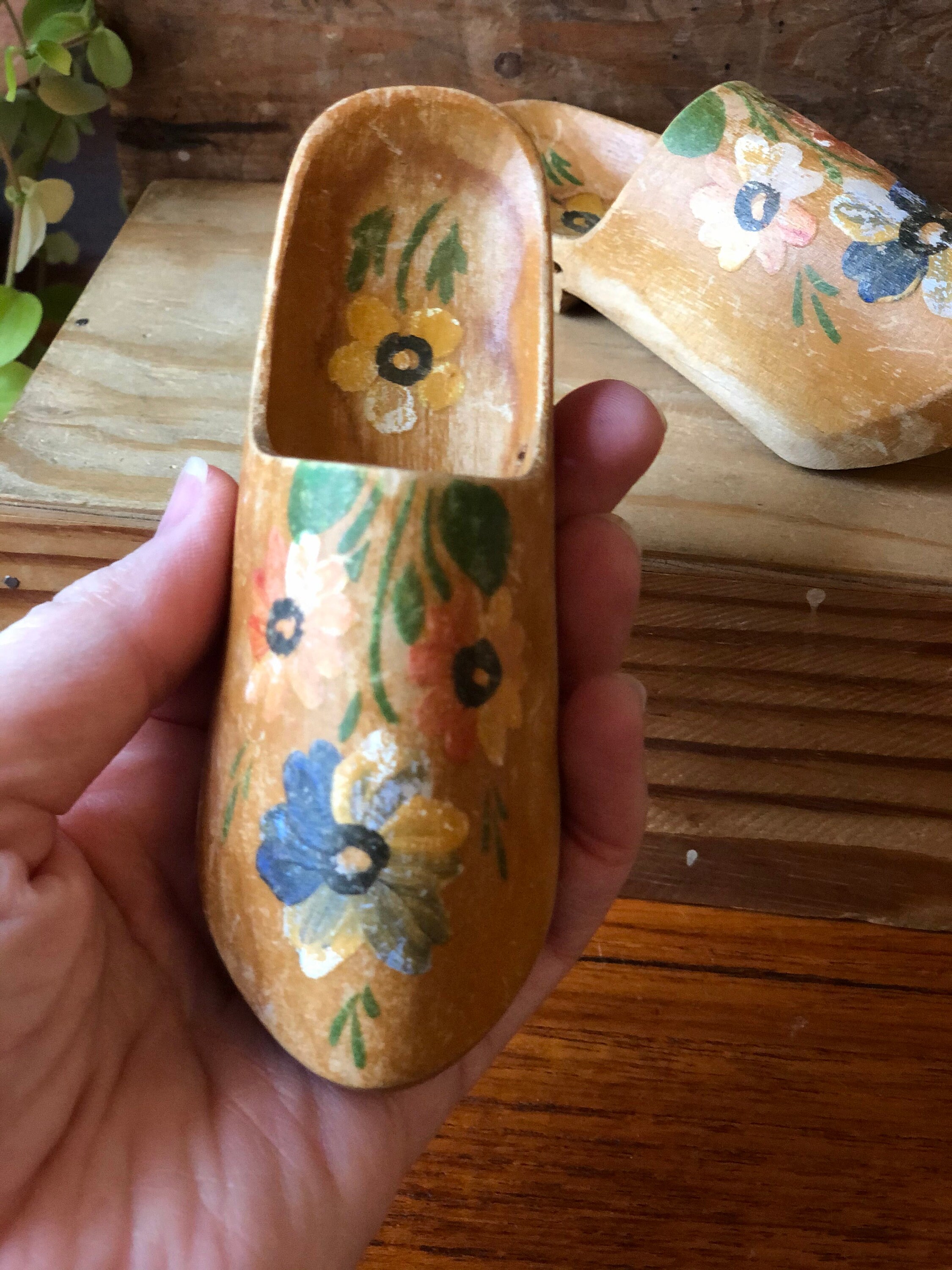 This is a pair of hand crafted wooden miniature clogs from the turn of the century.