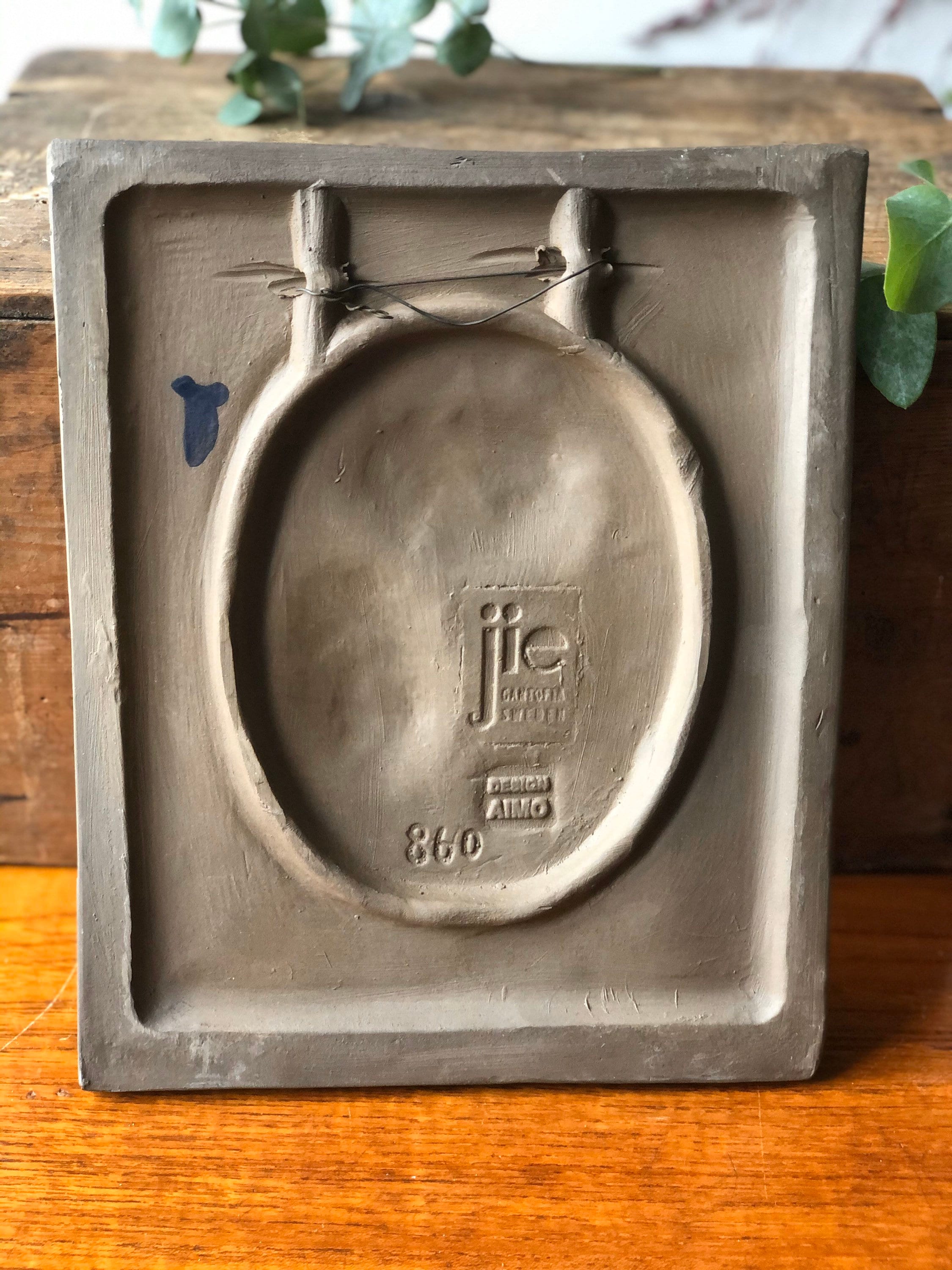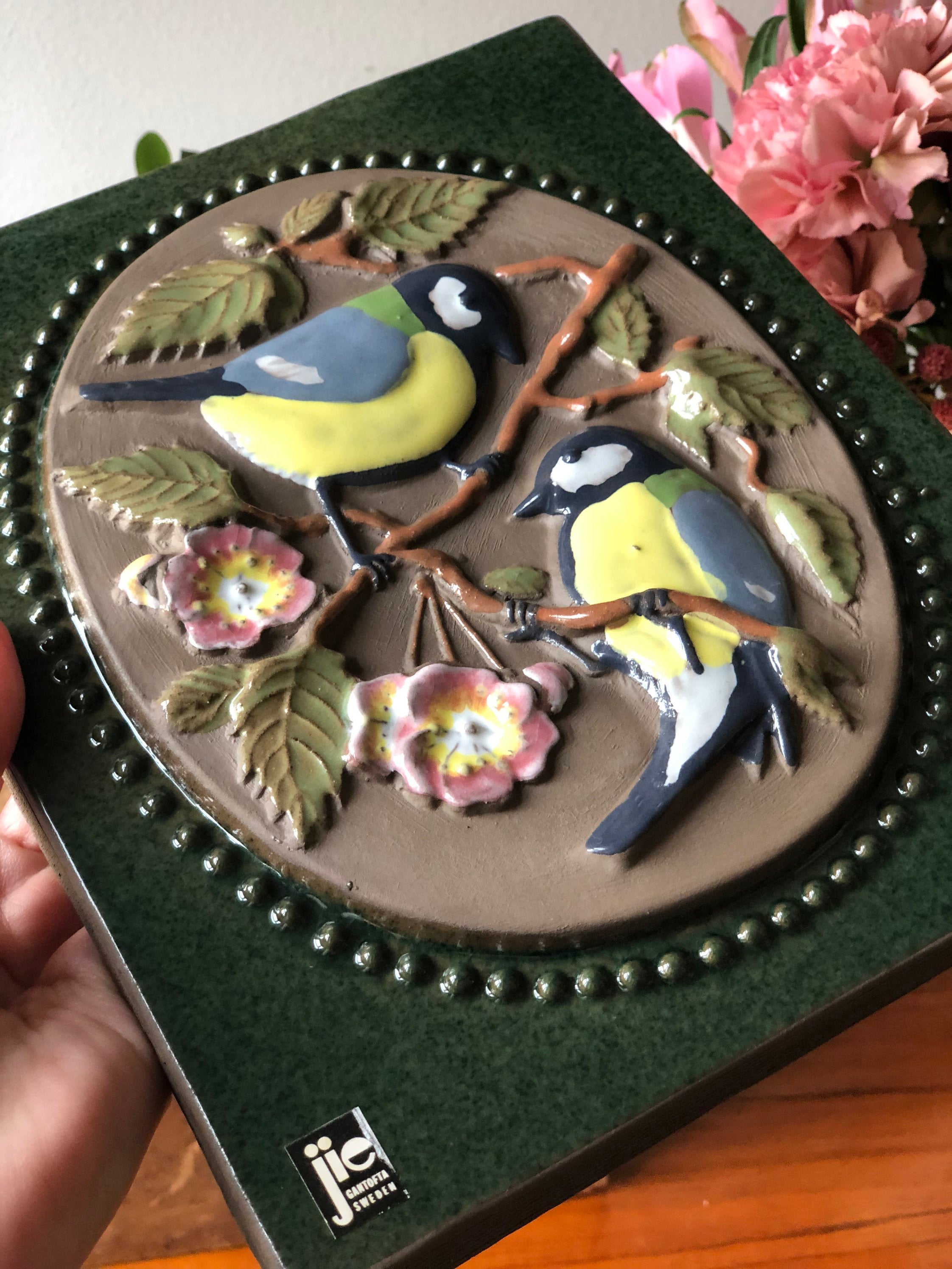This is a sweet ceramic wall hanging with Yellow breasted birds among leaves in a flowering tree by artist Staffan Johnson for Jie Gantofta, Sweden.