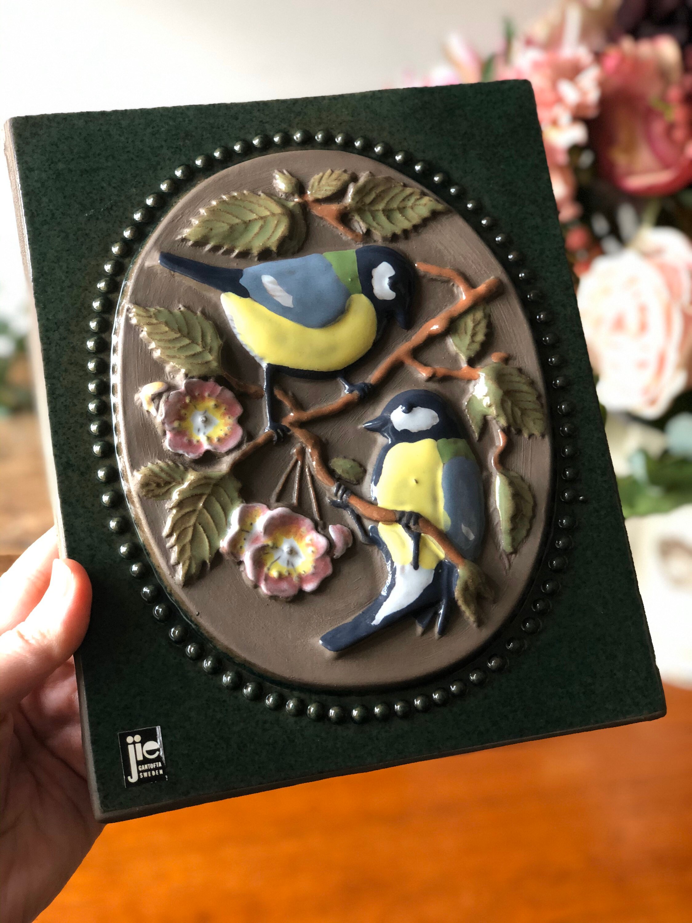 This ceramic plaque has beautiful birds with a picturesque background and a partially glazed ceramic relief.