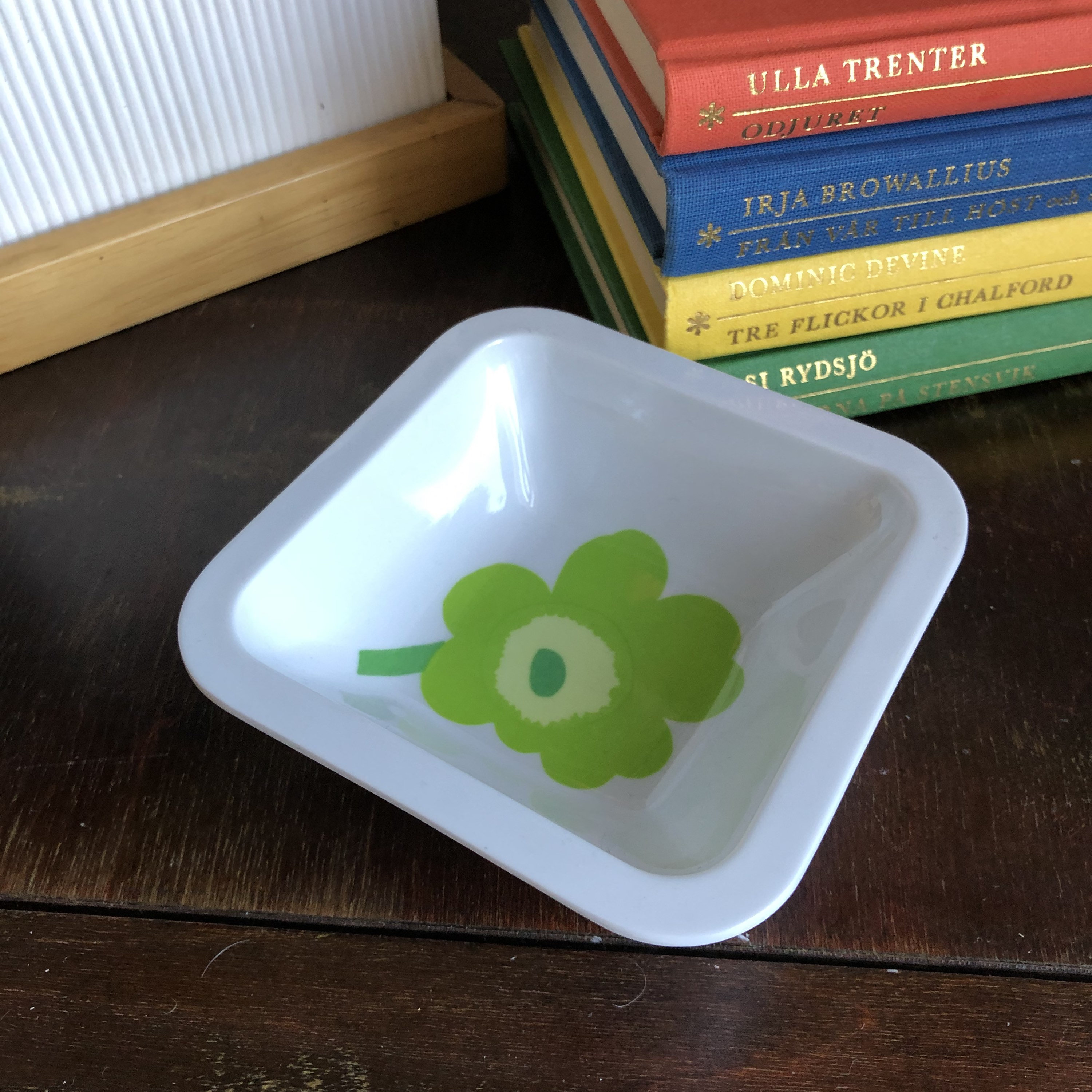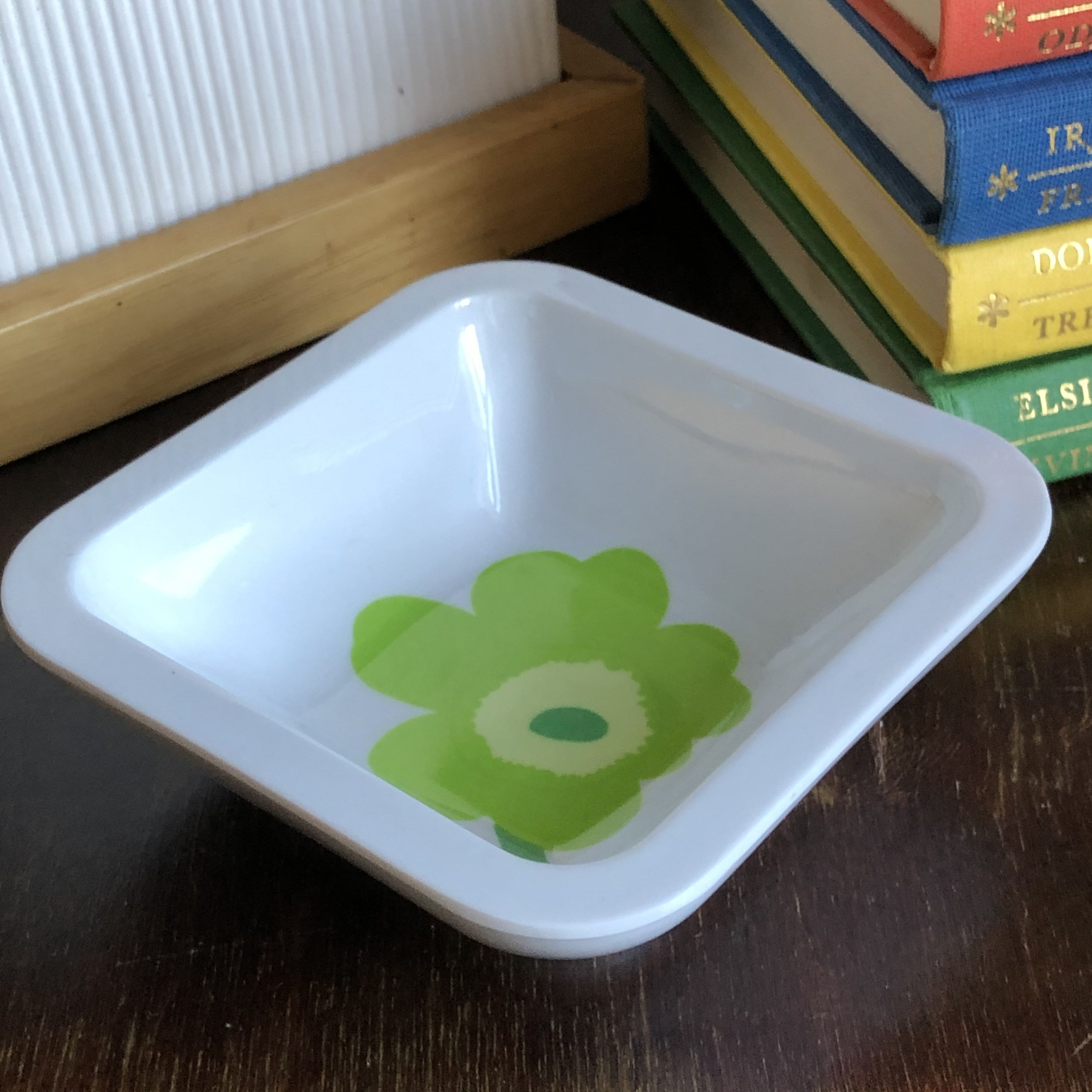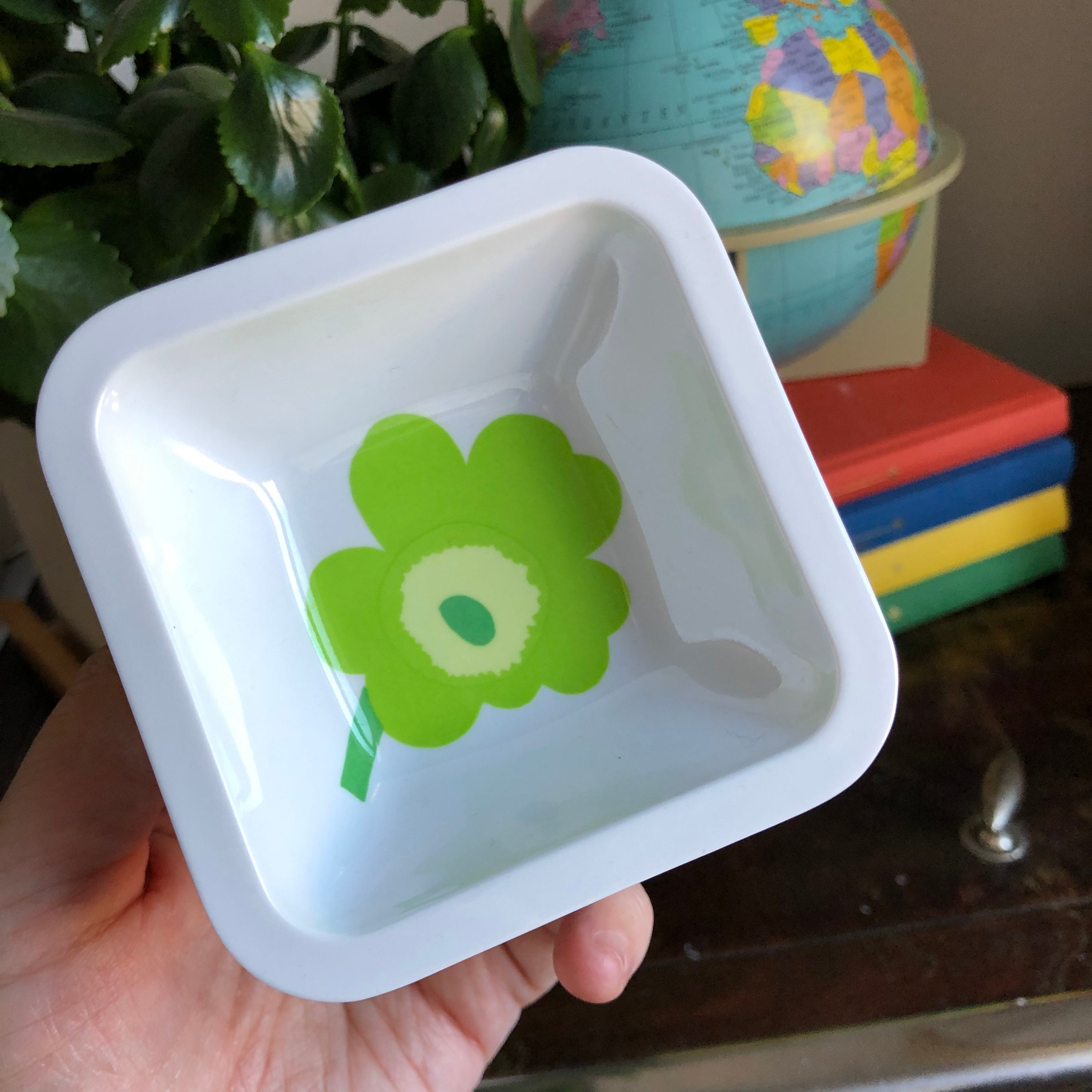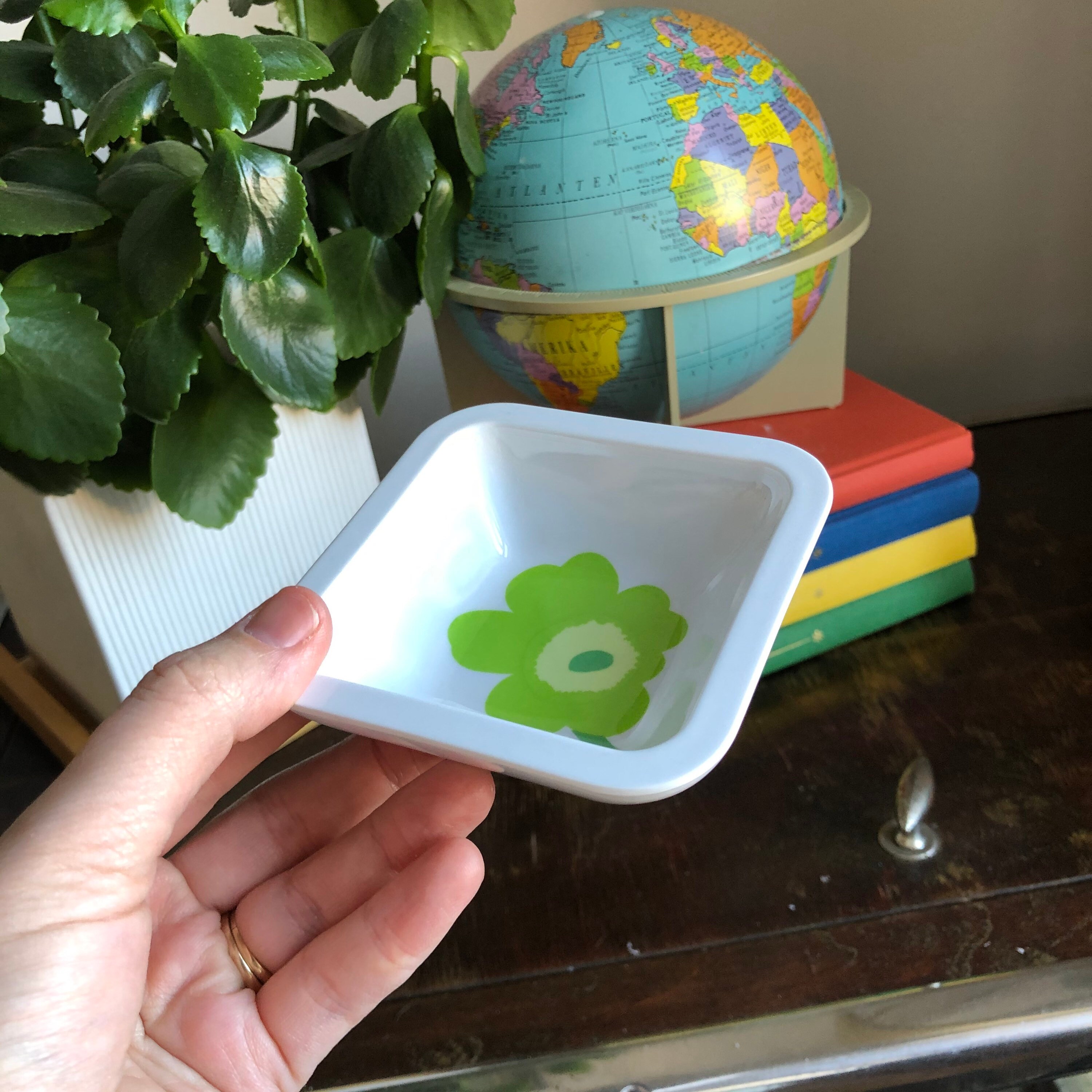 This is a small Marimekko melamine trinket bowl condiment bowl made in Finland. It is produced by Zak Designs using the Unikko pattern by Marimekko.