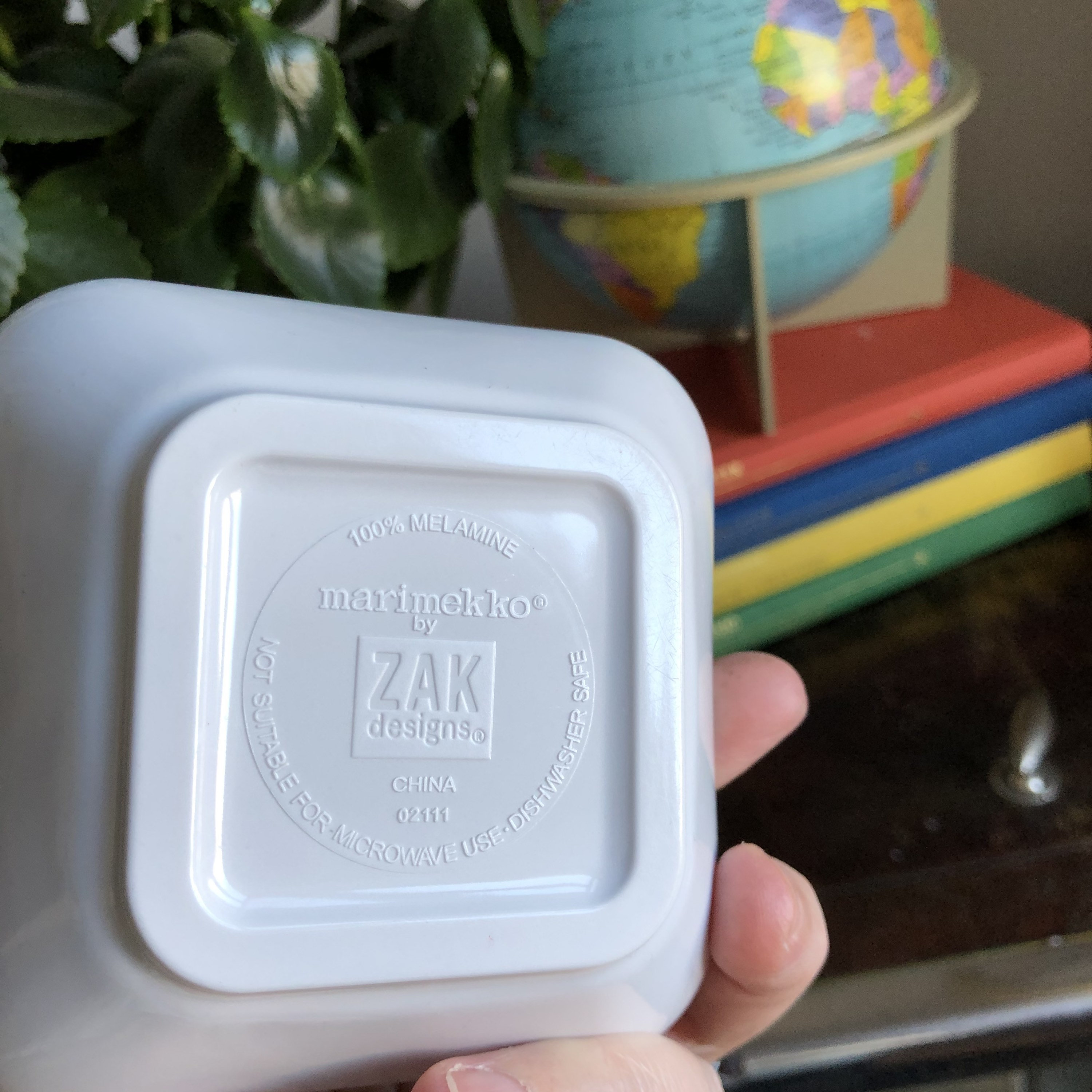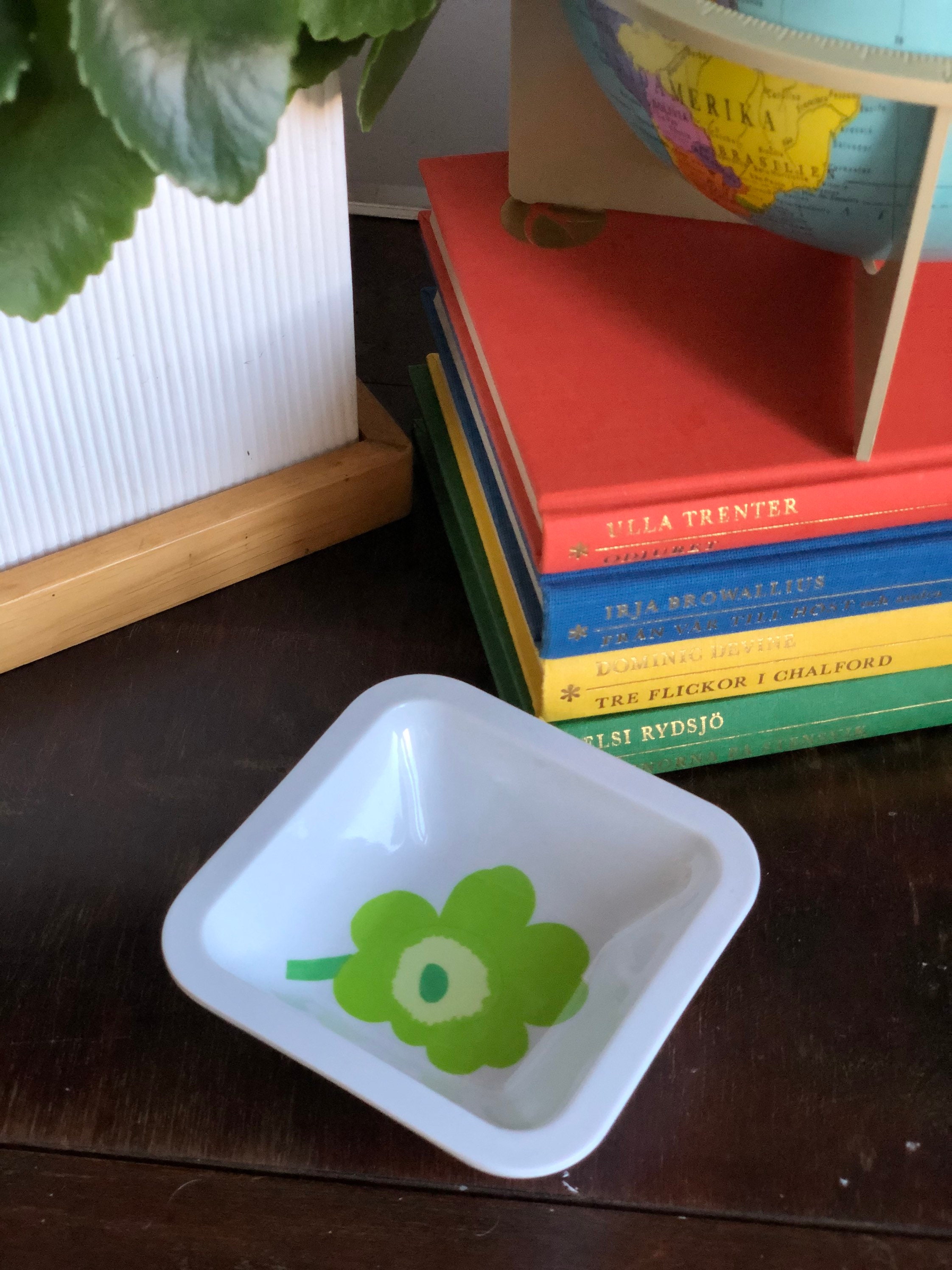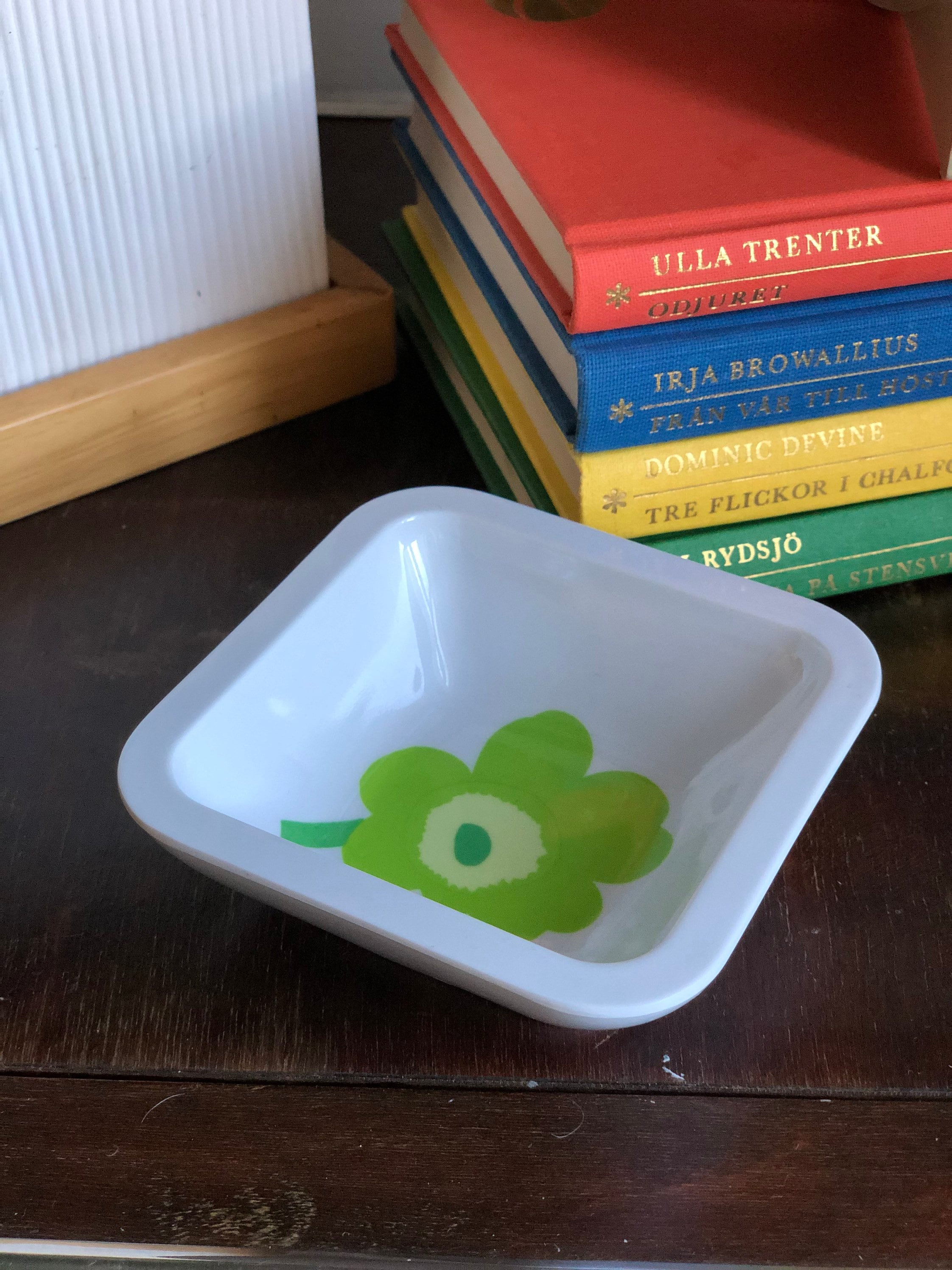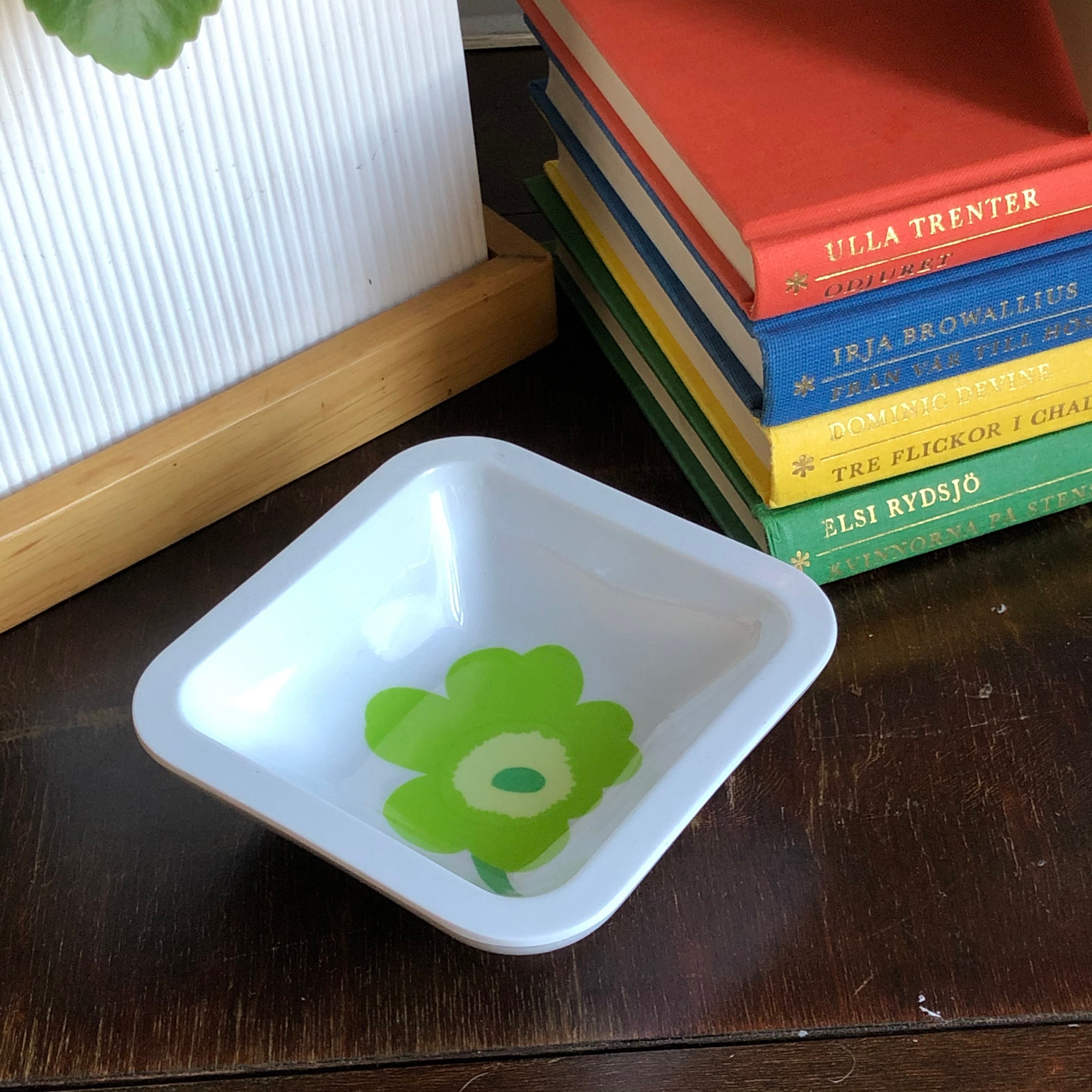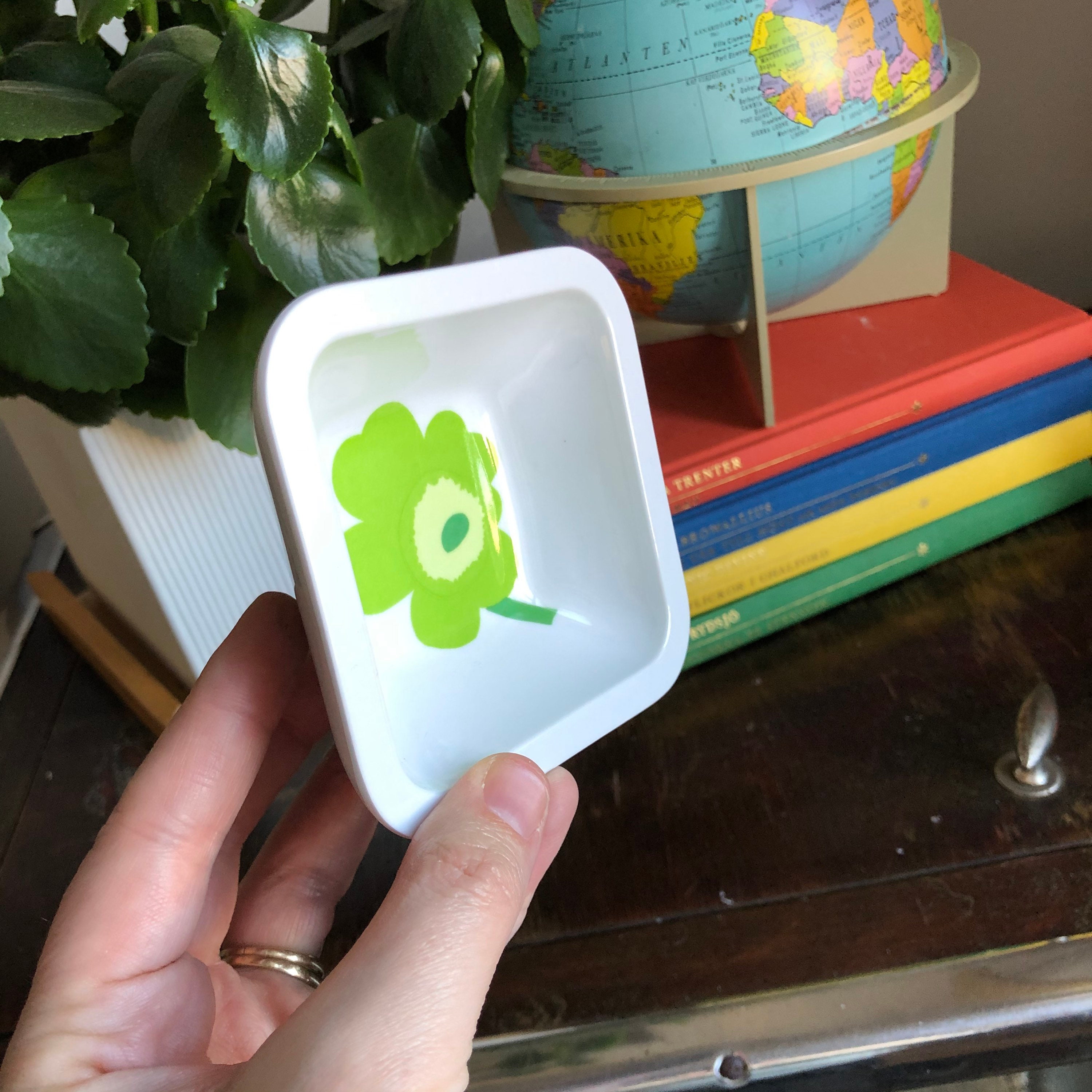 This is a small Marimekko melamine trinket bowl condiment bowl made in Finland. It is produced by Zak Designs using the Unikko pattern by Marimekko.