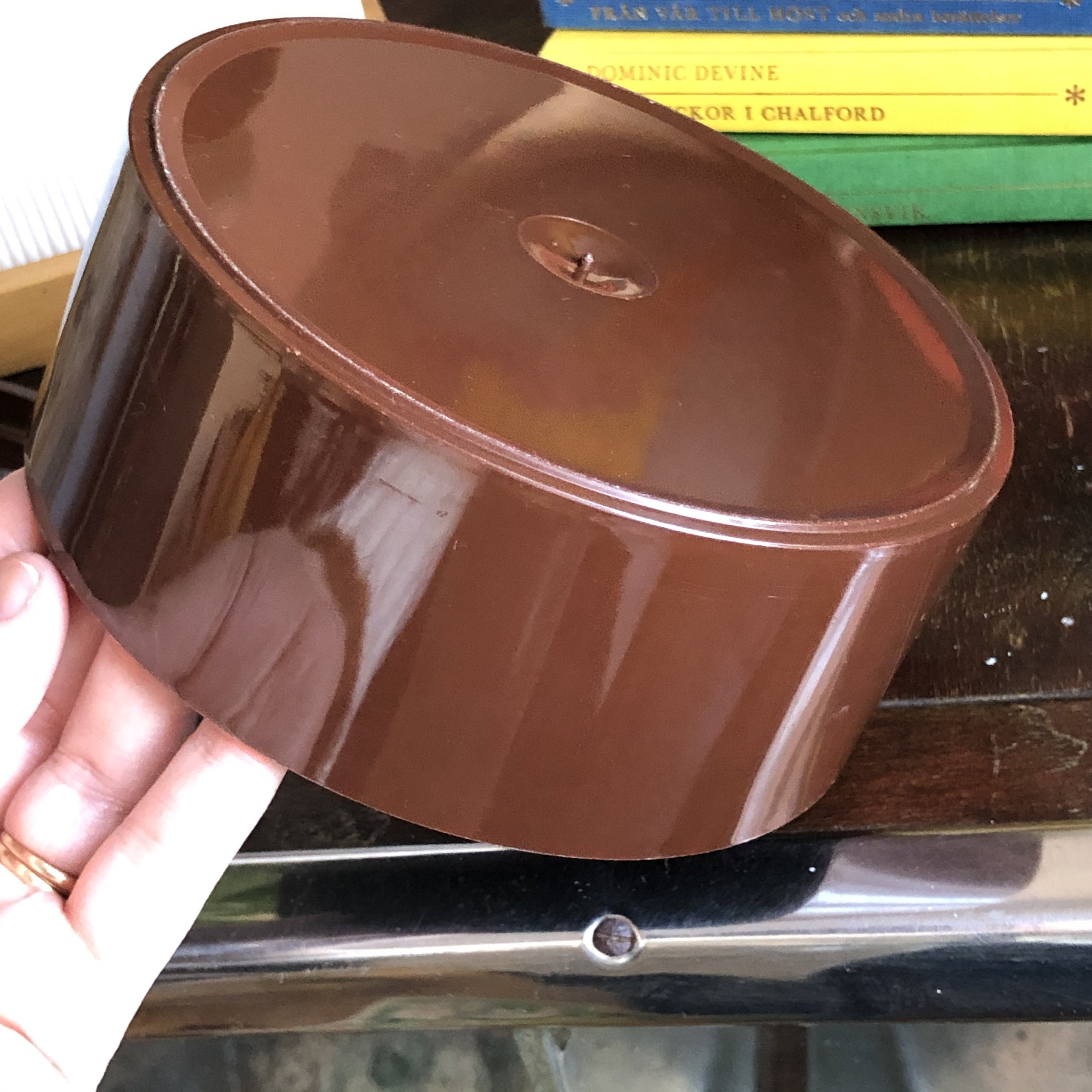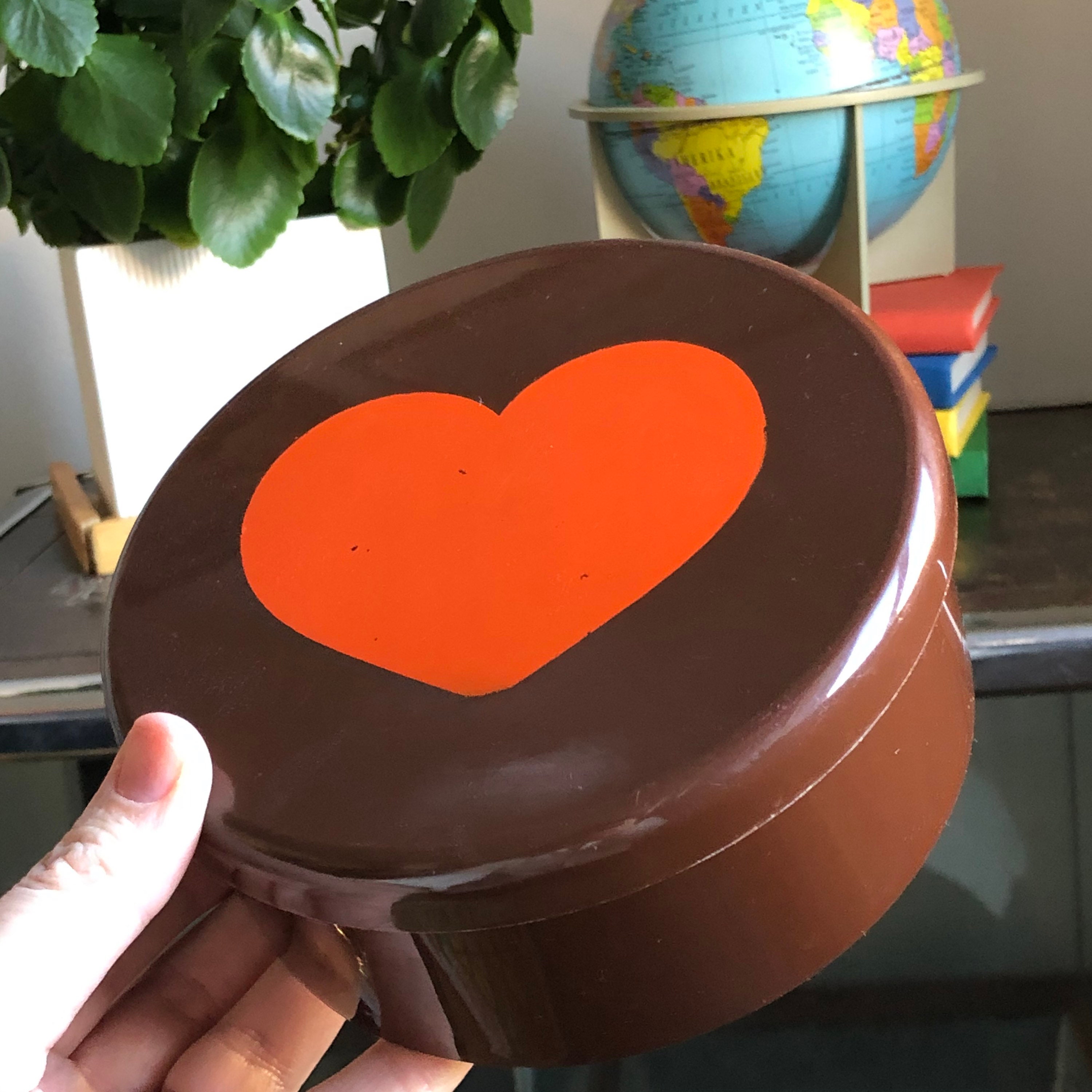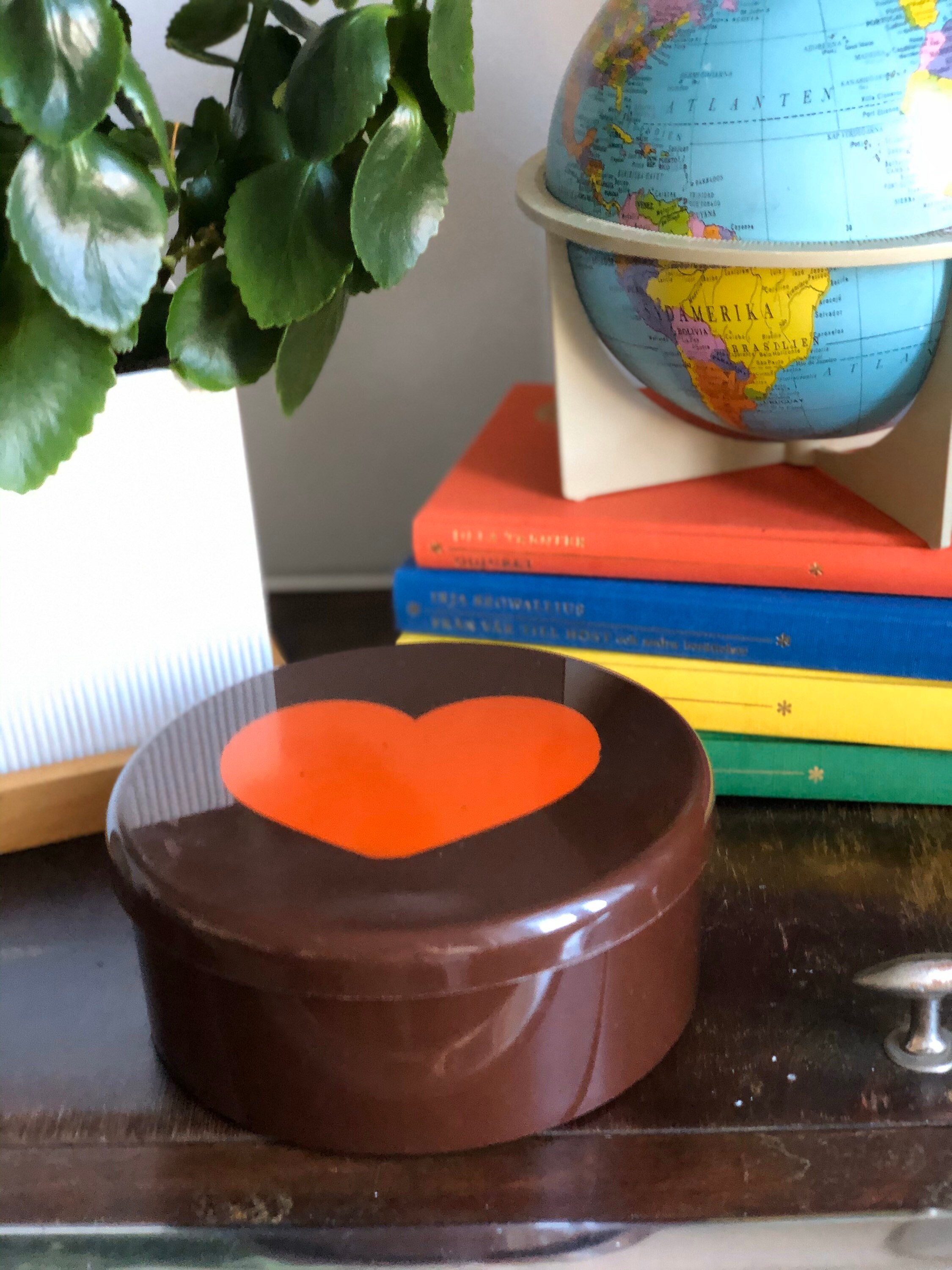 This is a sweet retro Scandinavian designed hard plastic container in brown with a big bright orange heart on the lid.