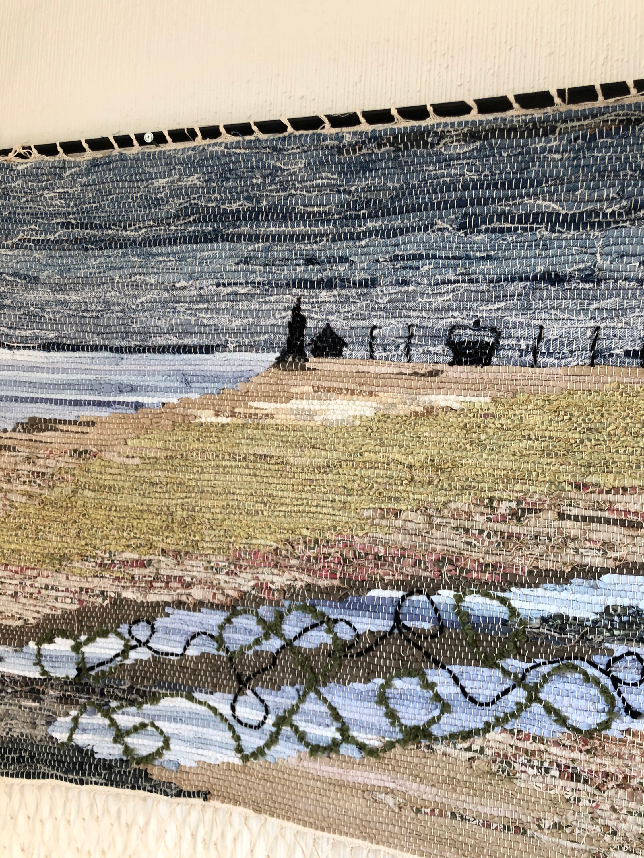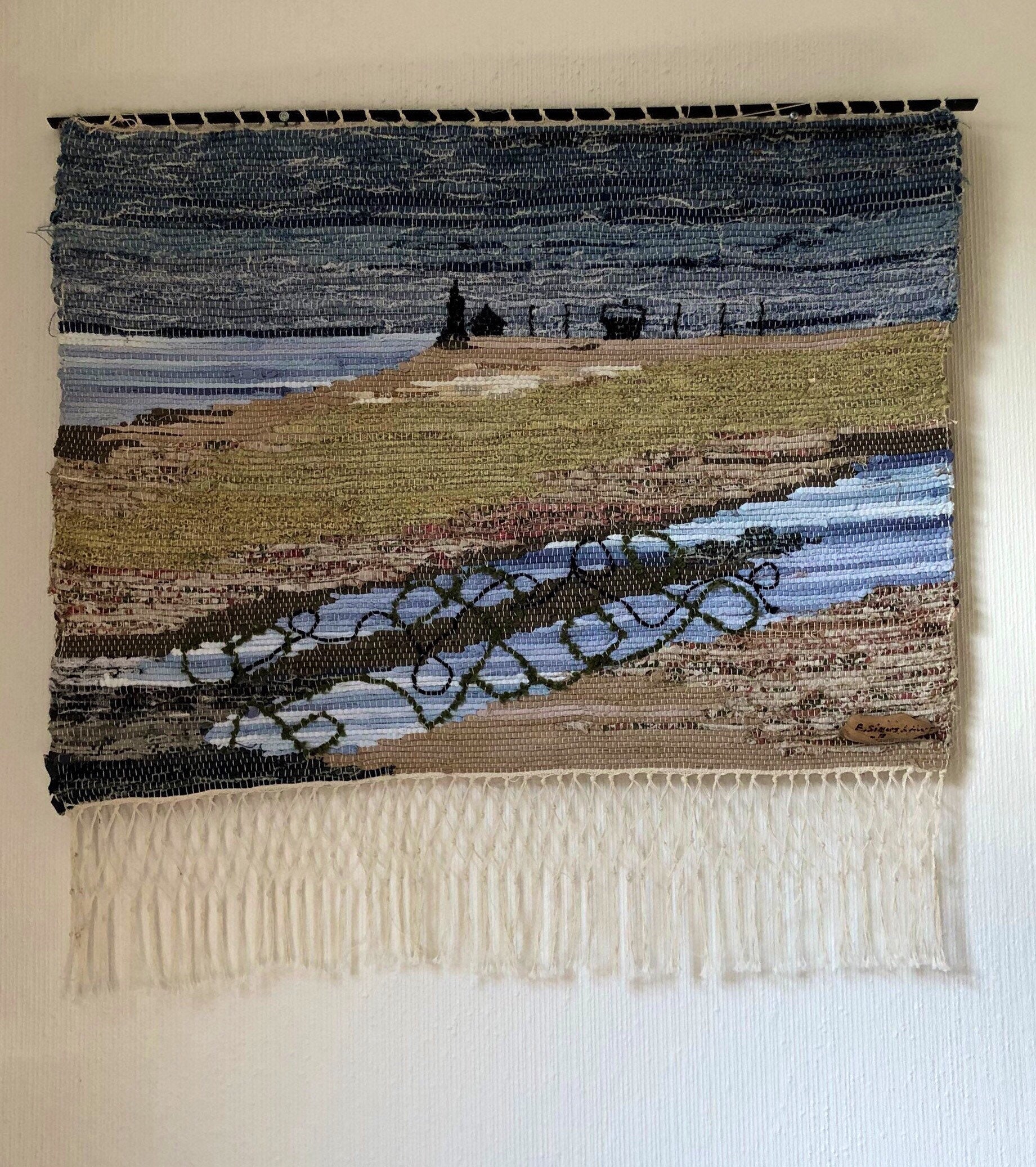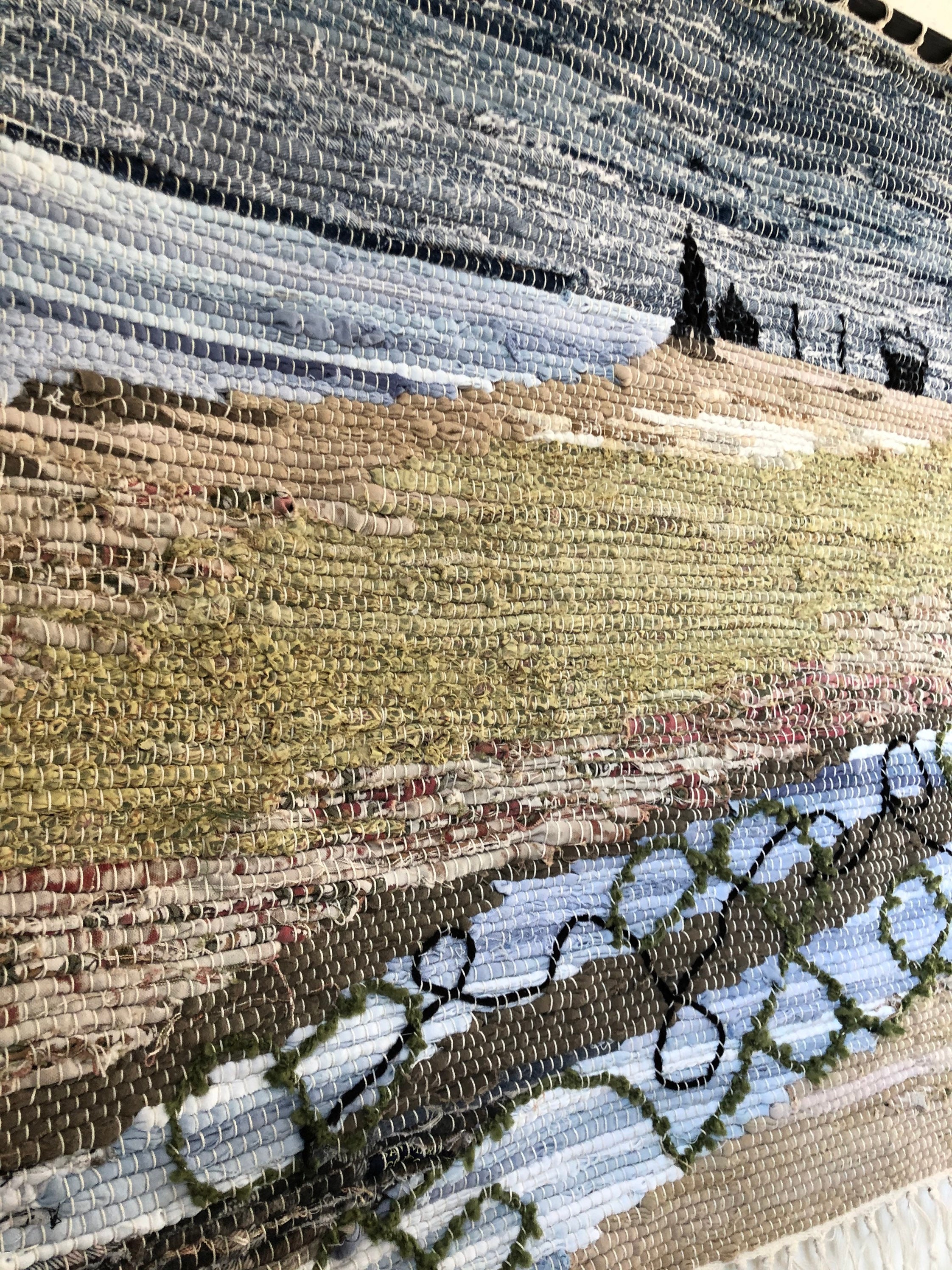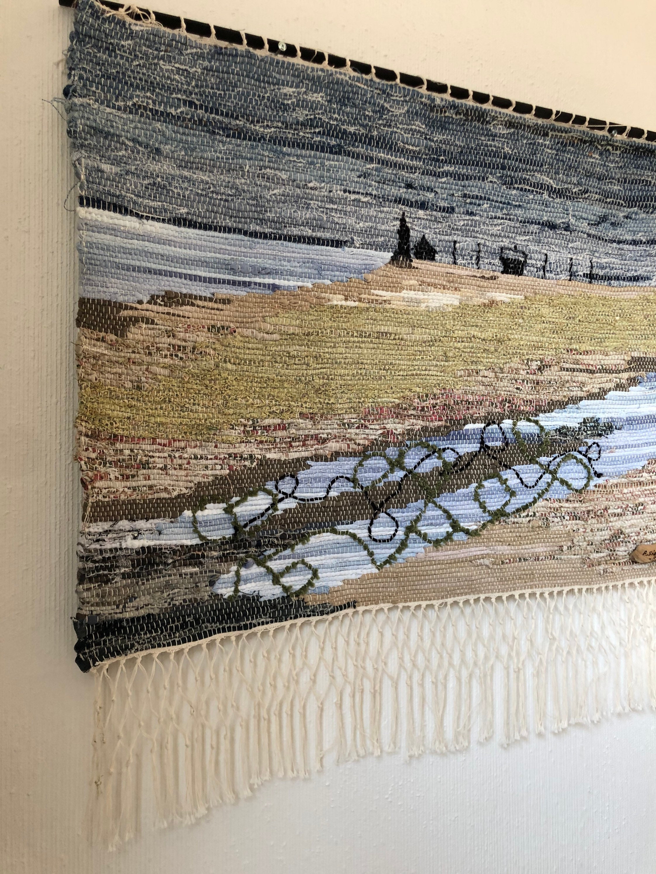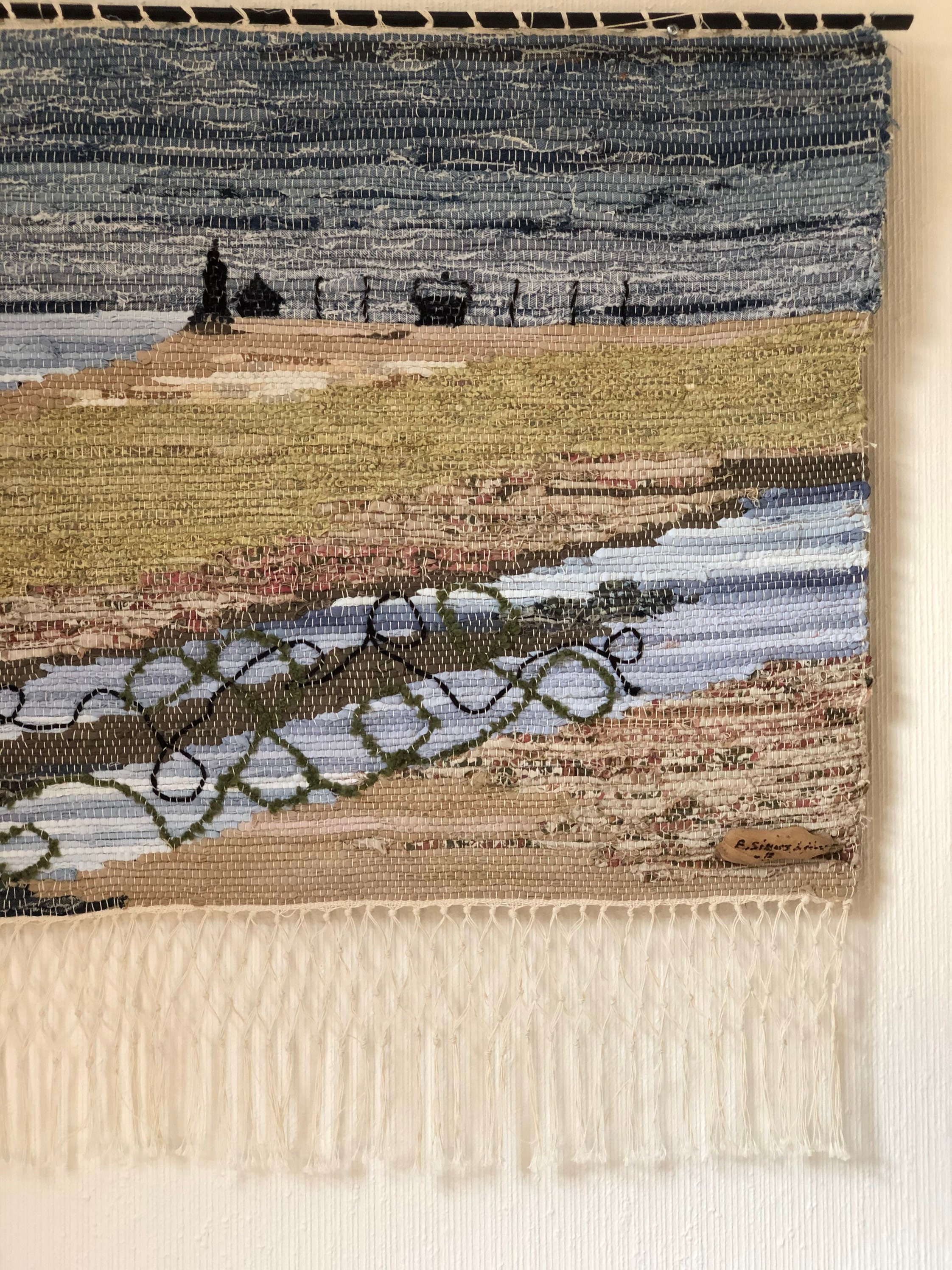 The end of the wall hanging is tied off with the traditional Scandinavian fringe and the weavers signature on a bit of local driftwood attached to the bottom.