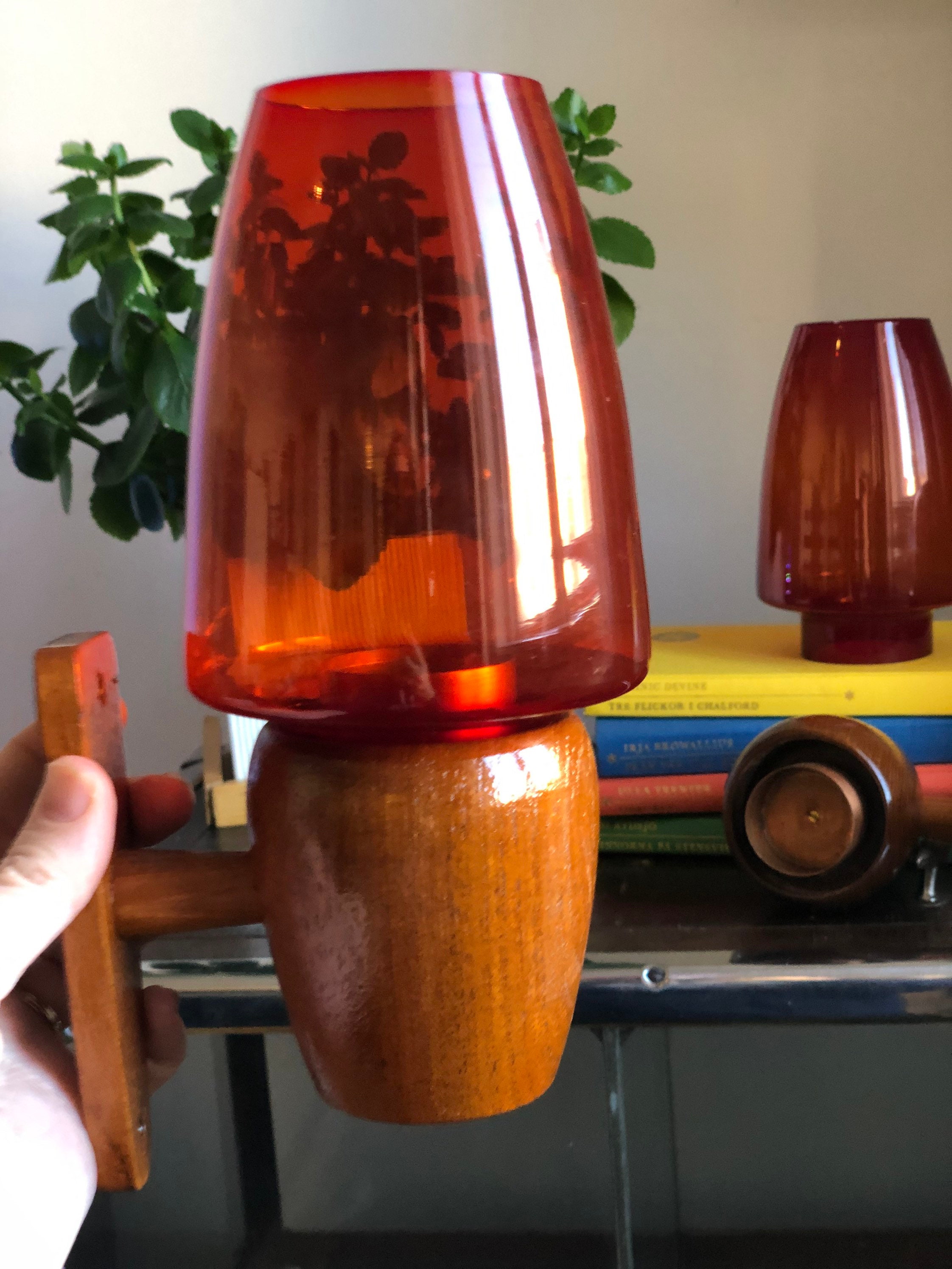 This is a pair swedish teak wooden wall sconces, with orange glass domes over votive candle holders. Designed by Carl Holmberg, SWEDEN.