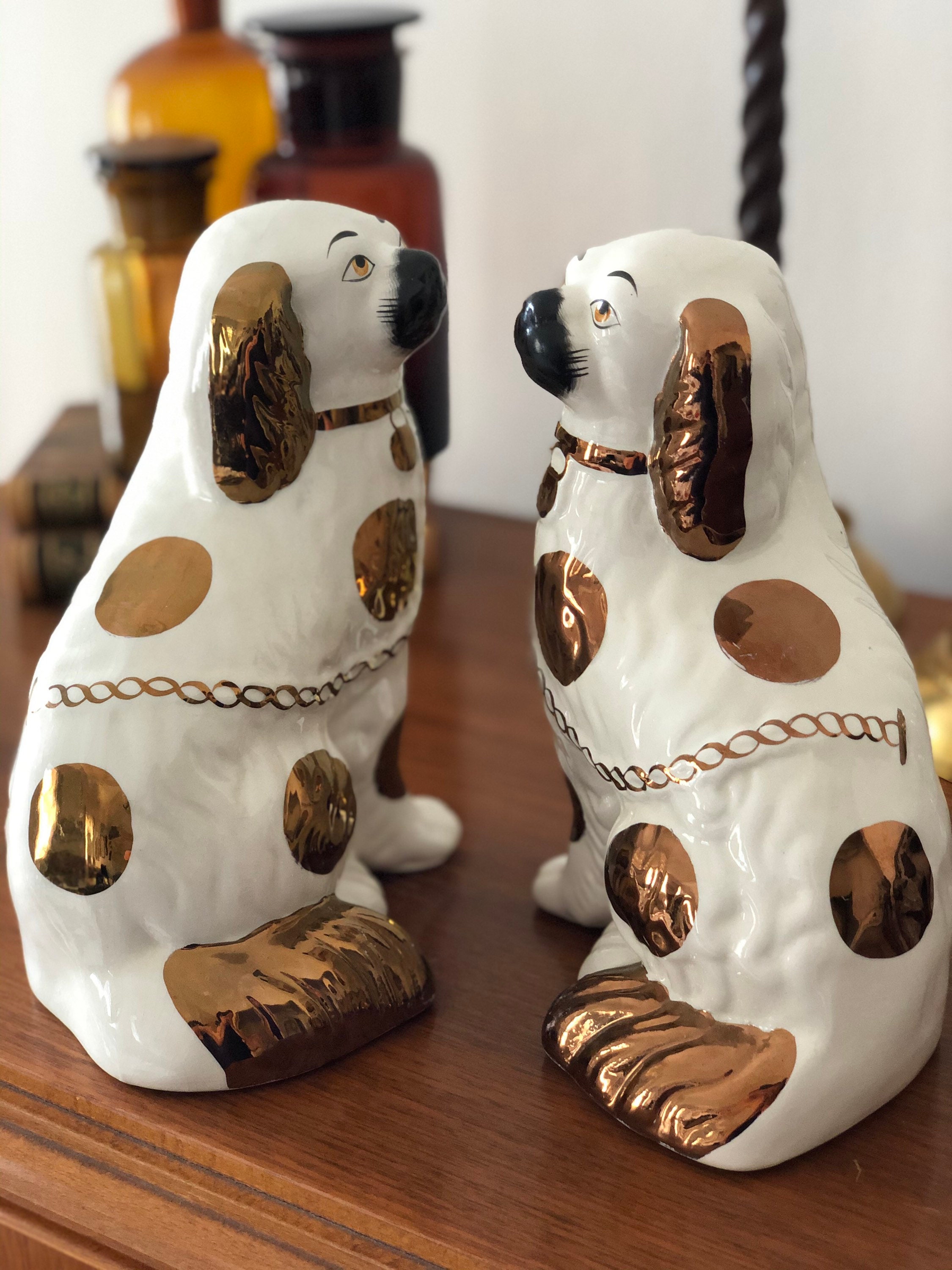 These two vintage English dog figurines are a perfect edition to your mantle or eclectic mix. They have loads of personality and will make you smile every day. They have a unique coppery color.