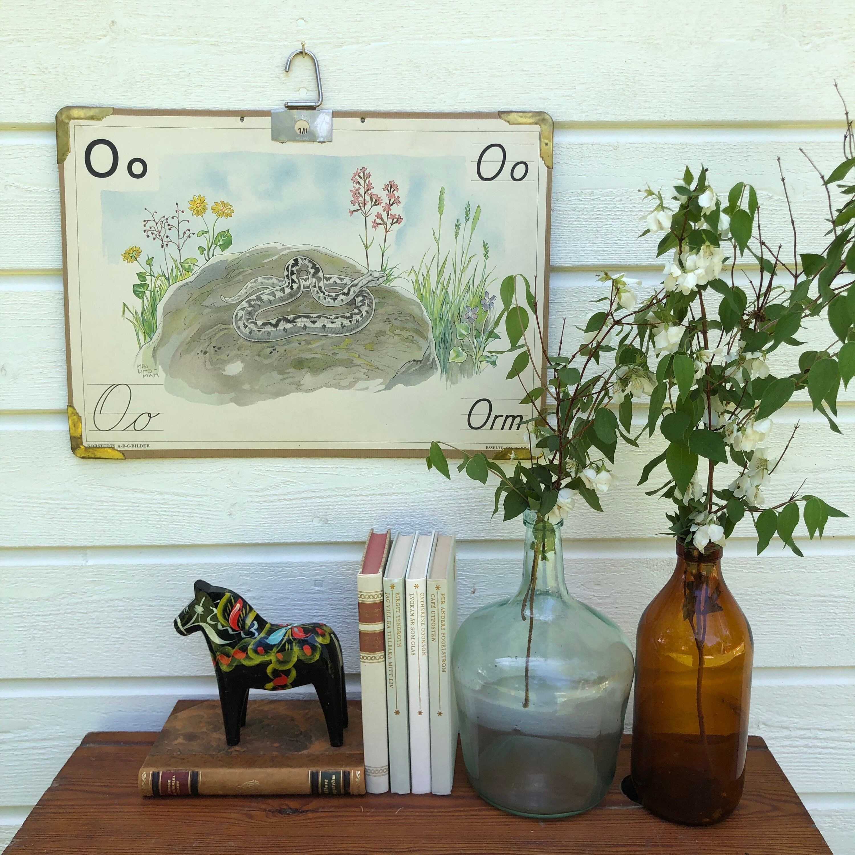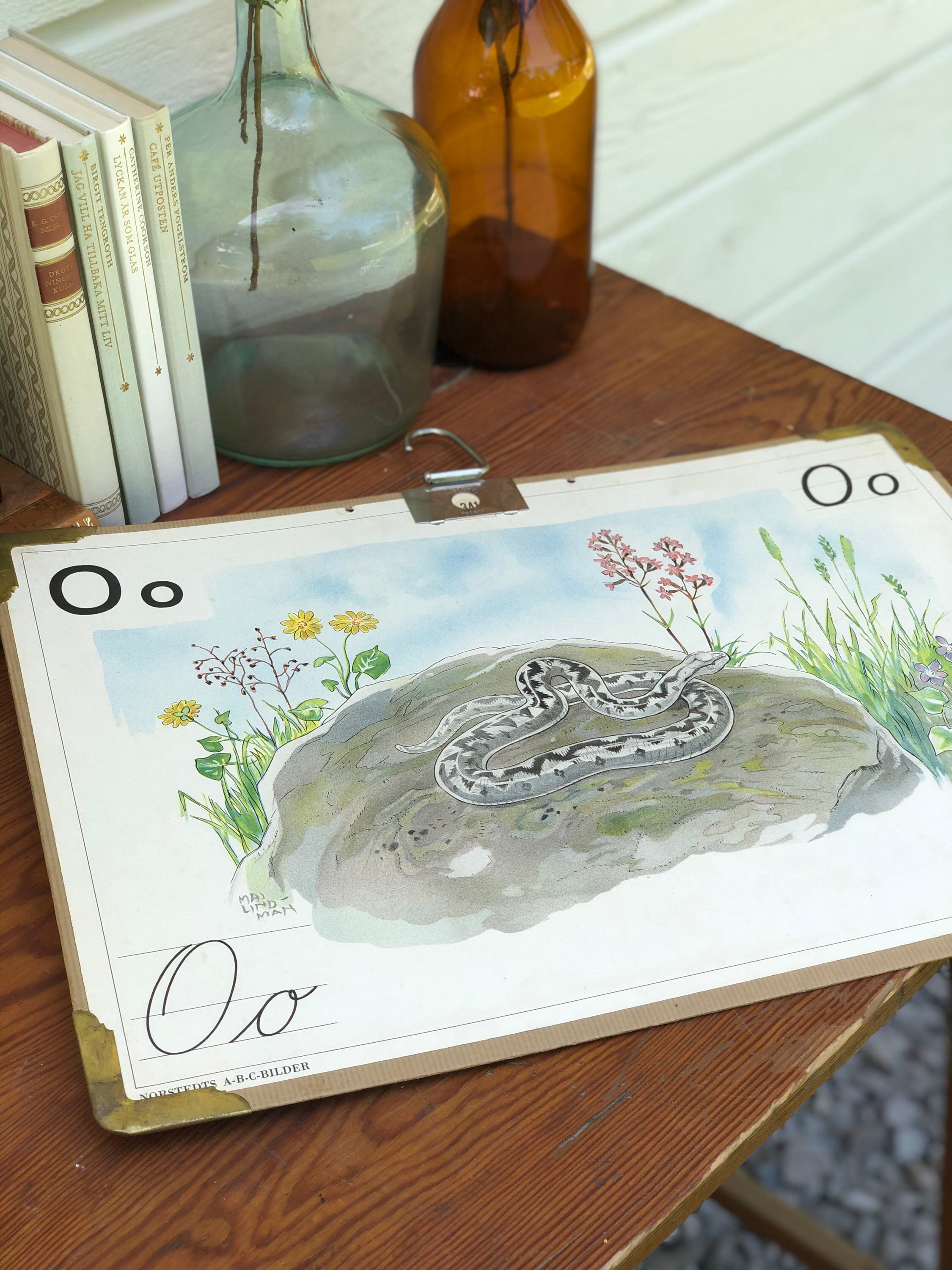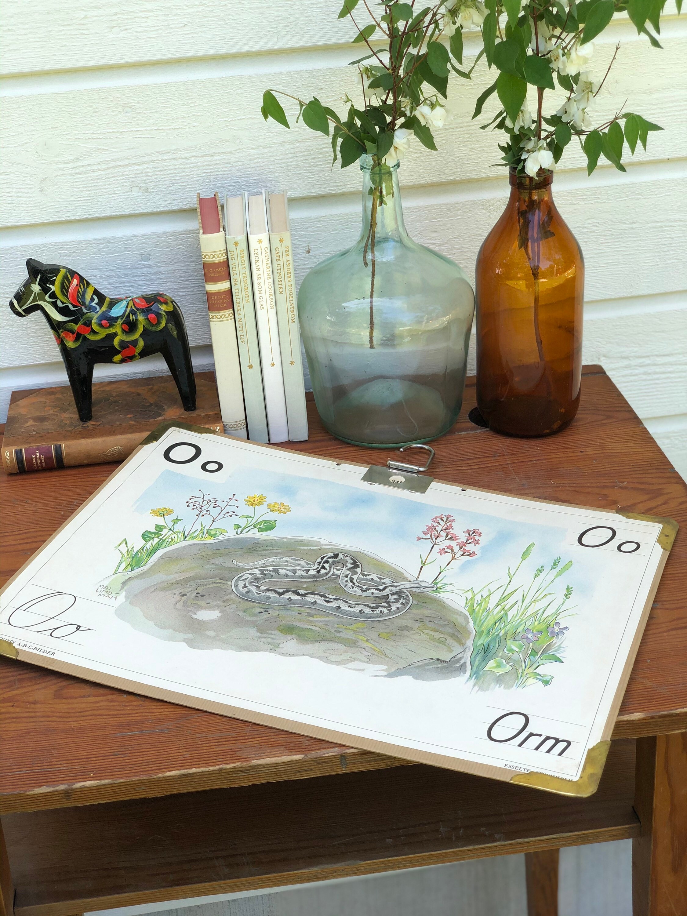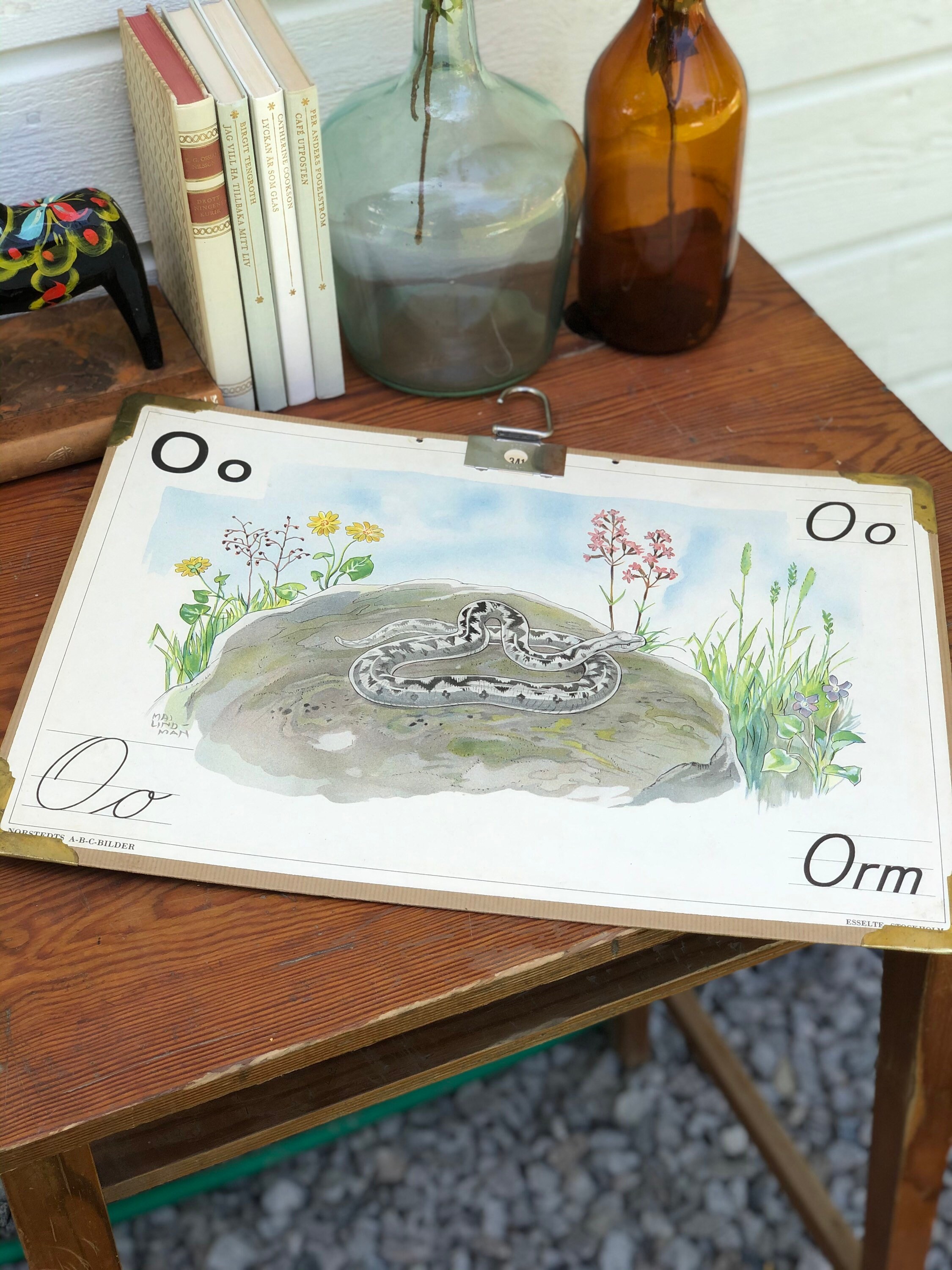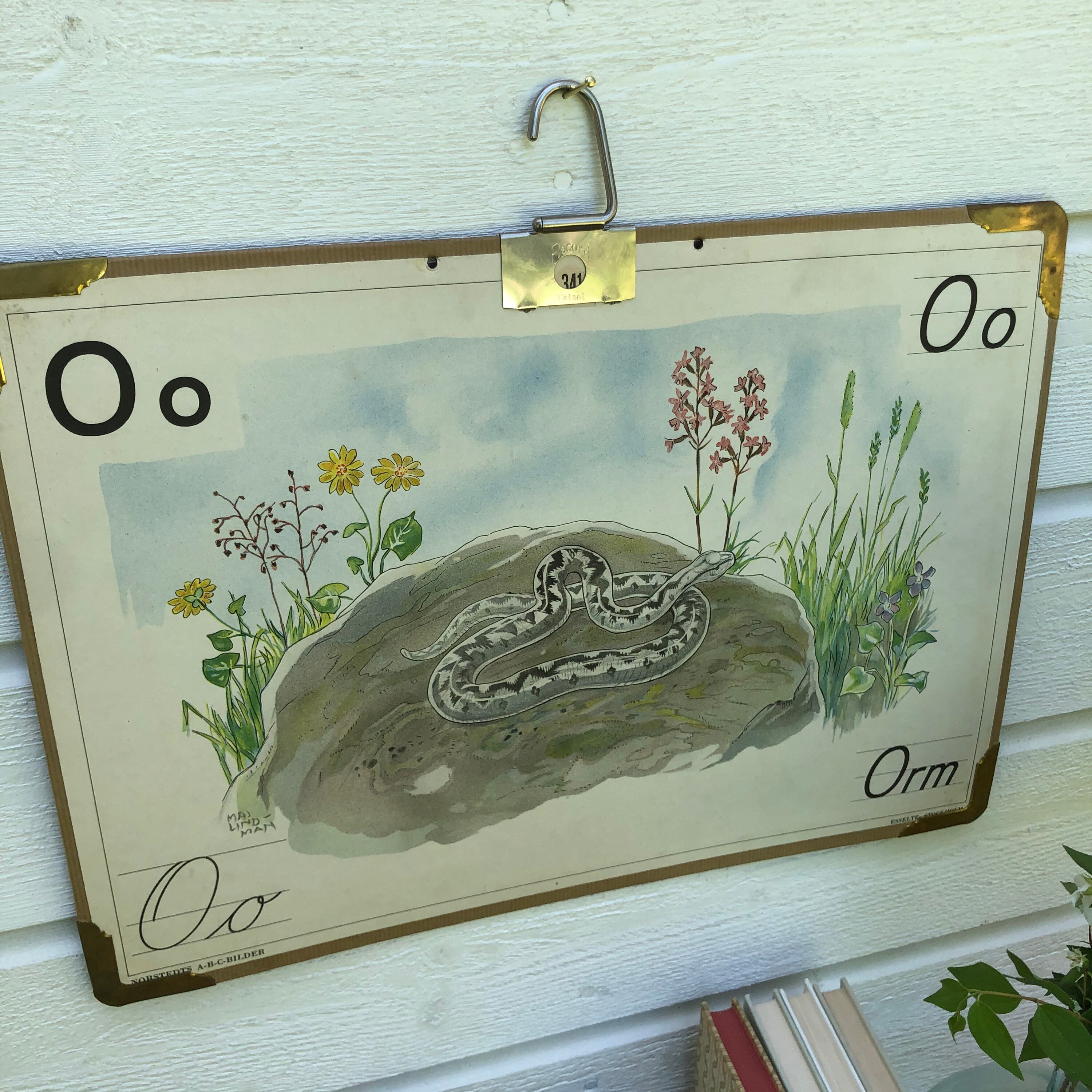 This is a vintage Swedish school house letter illustration poster on backing with metal hook.