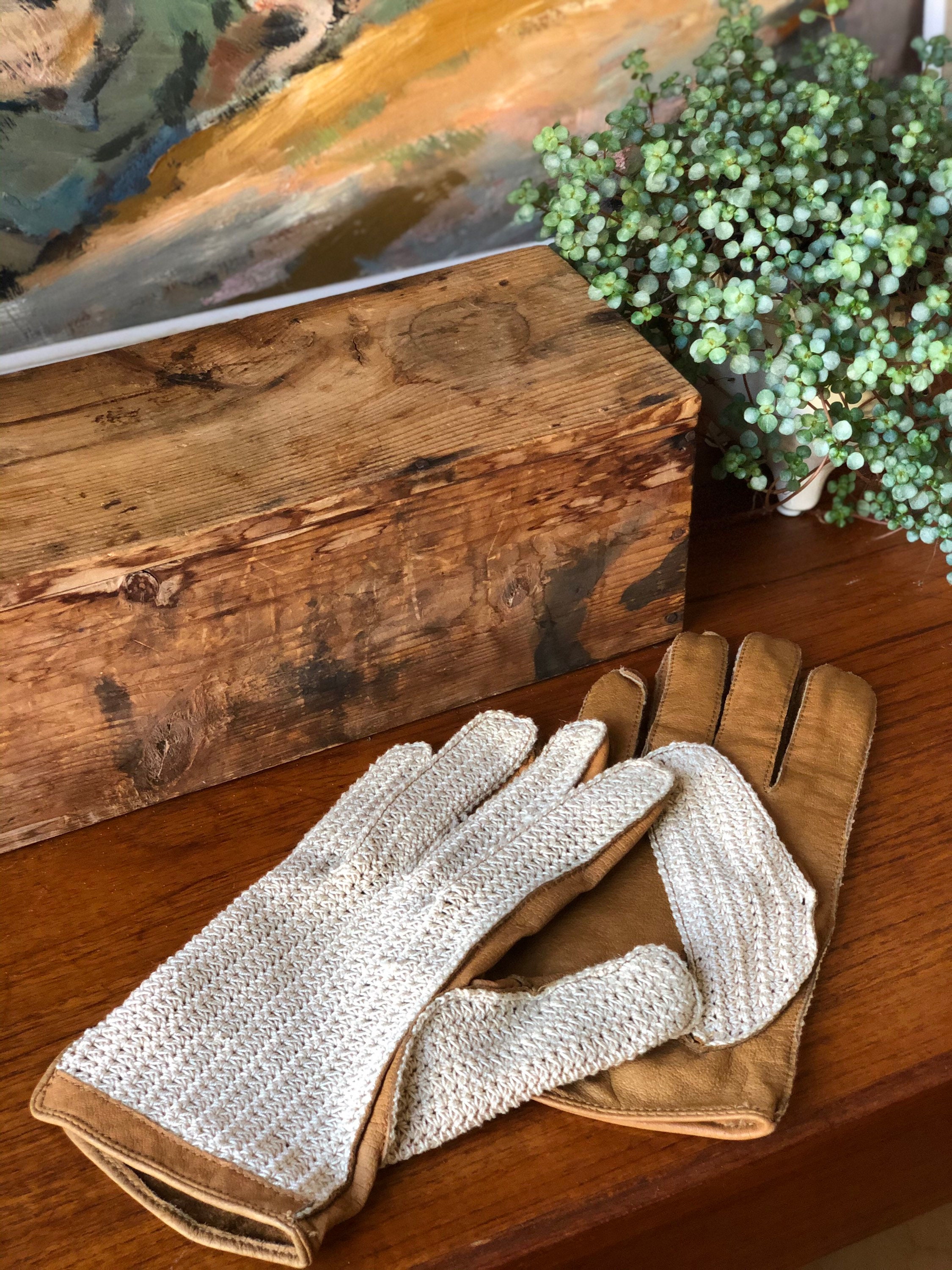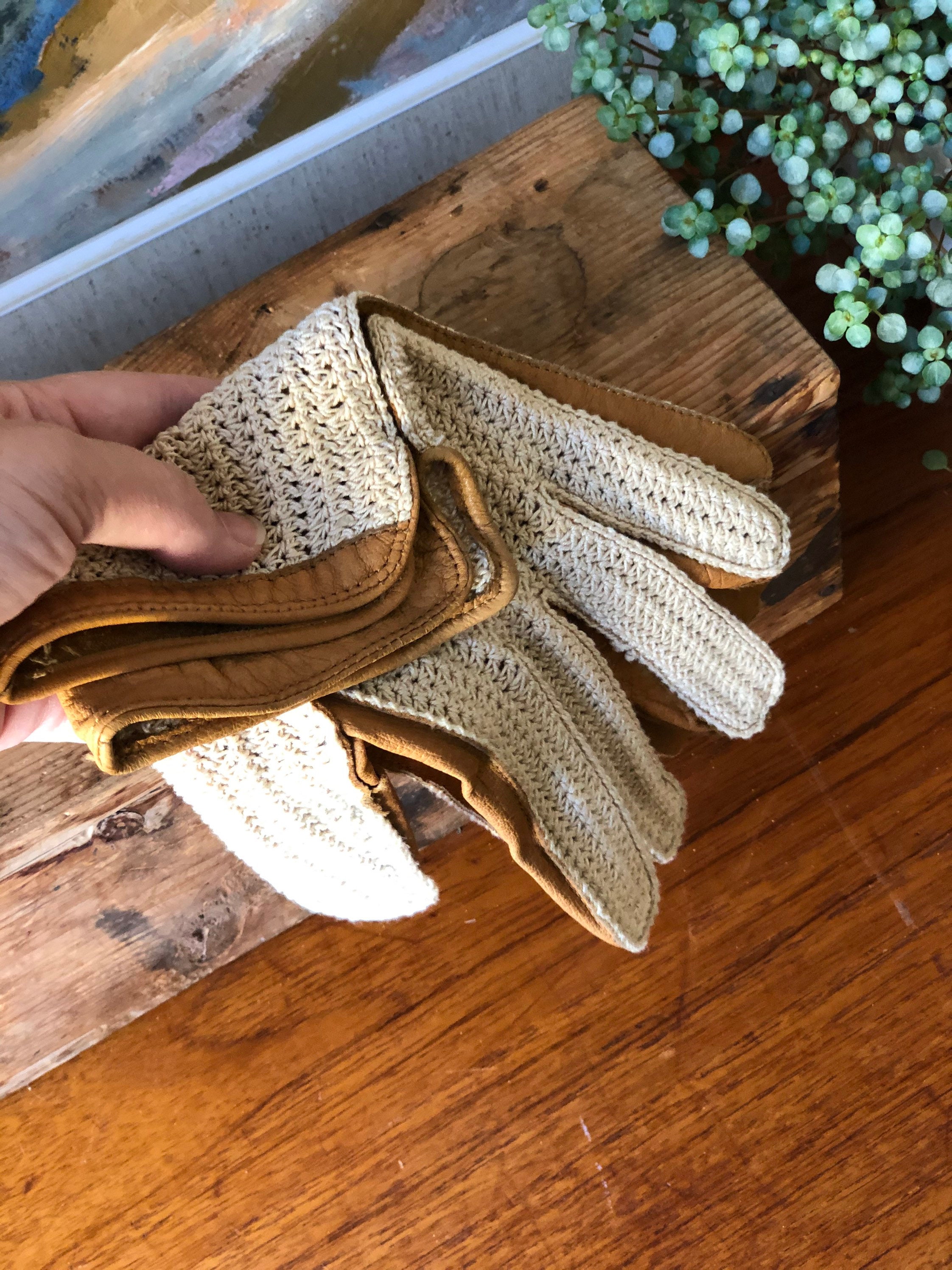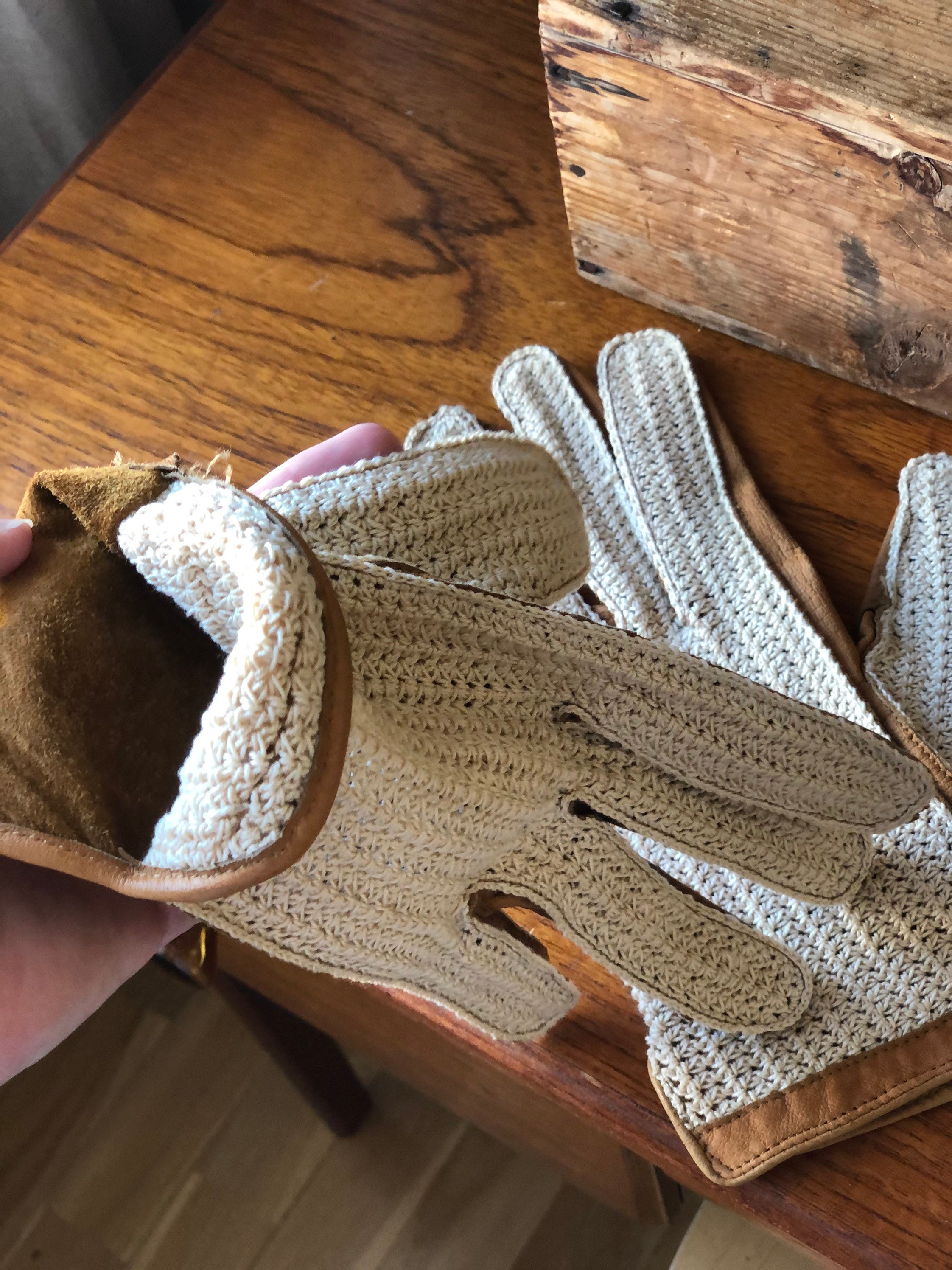 This is a pair of cool vintage driving gloves in tan calfskin leather and knitted cotton backs driving gloves.