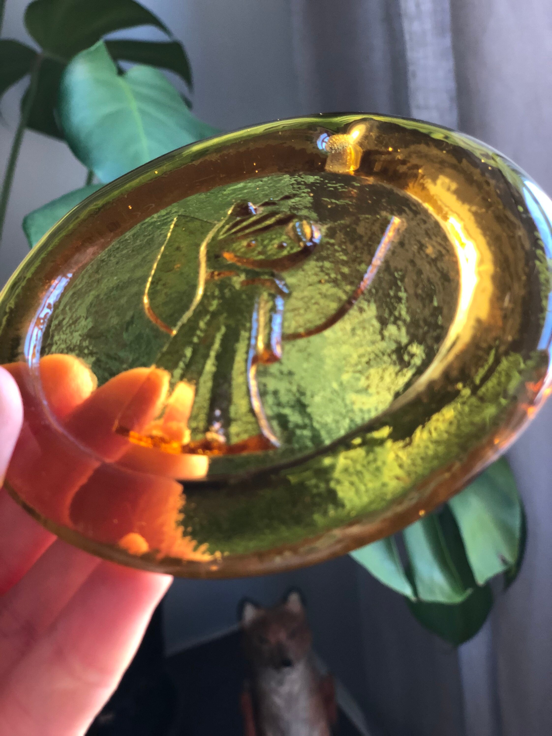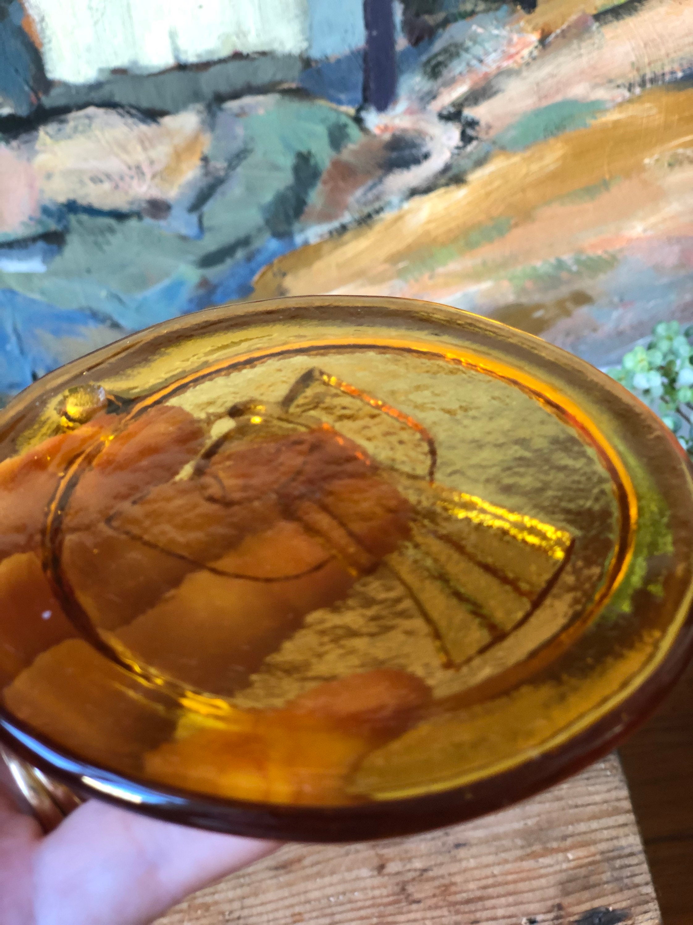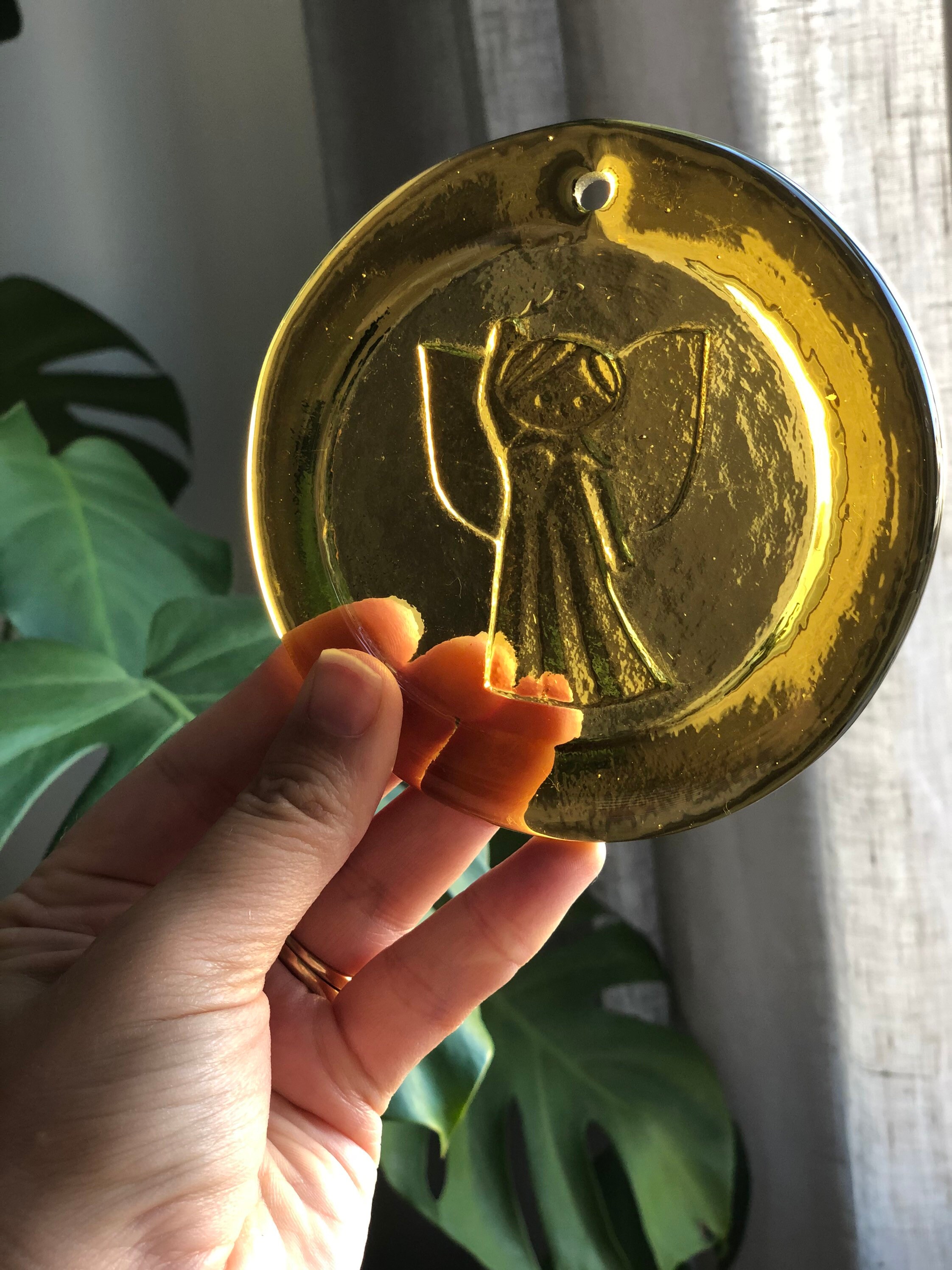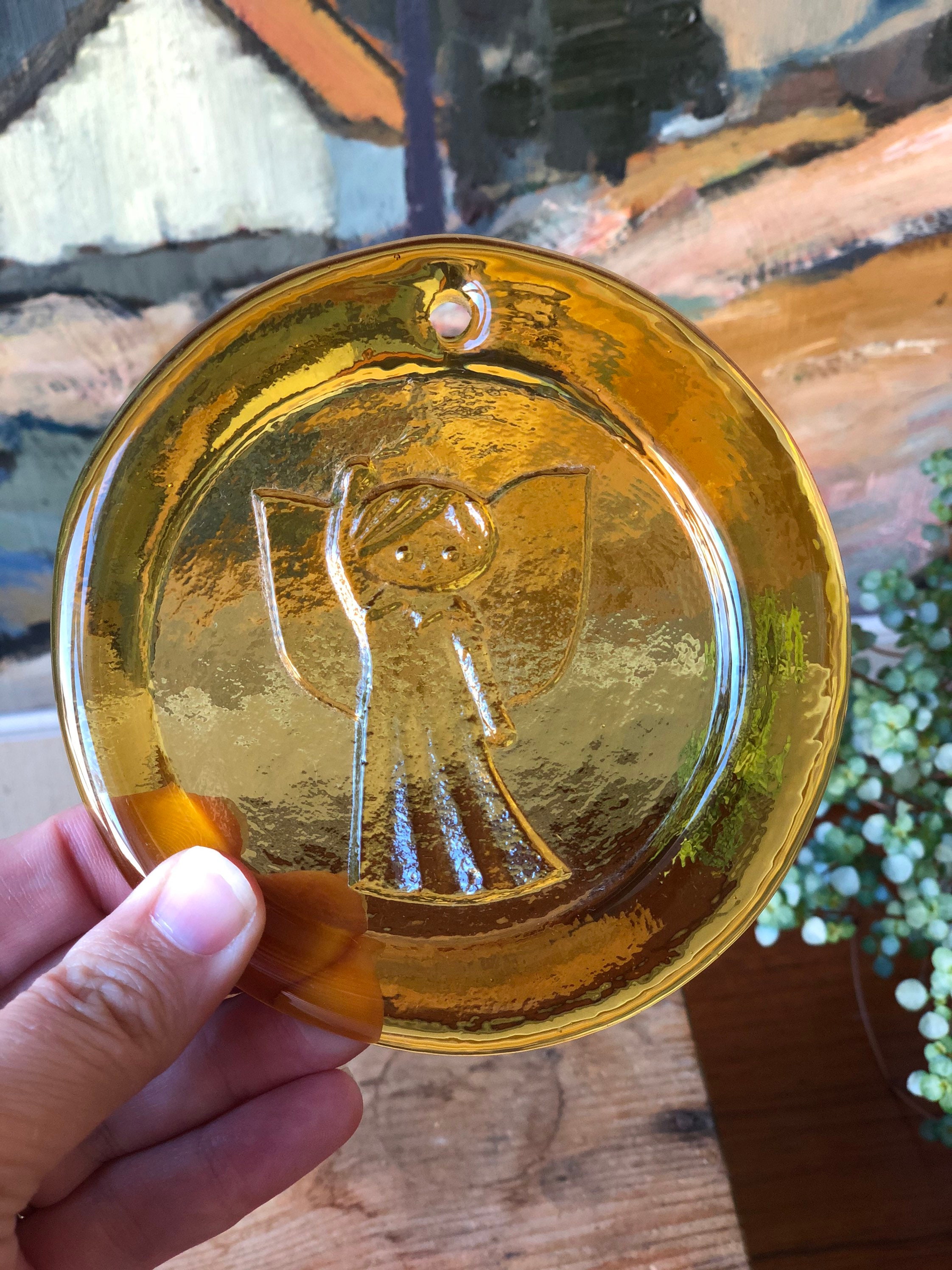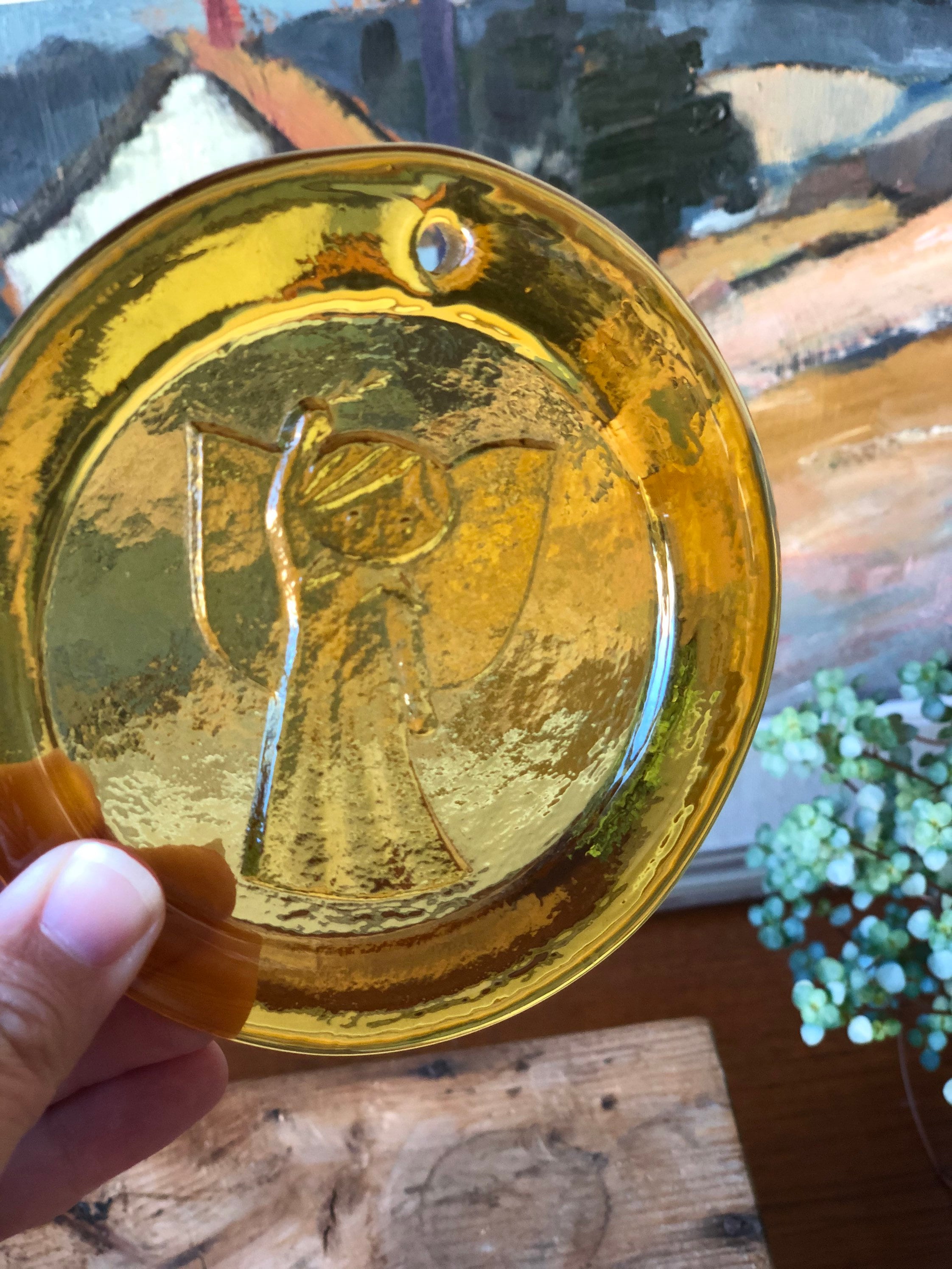 This is a stunning amber glass suncatcher/wall hanging made in Sweden. This amber sun-catcher features an angle.