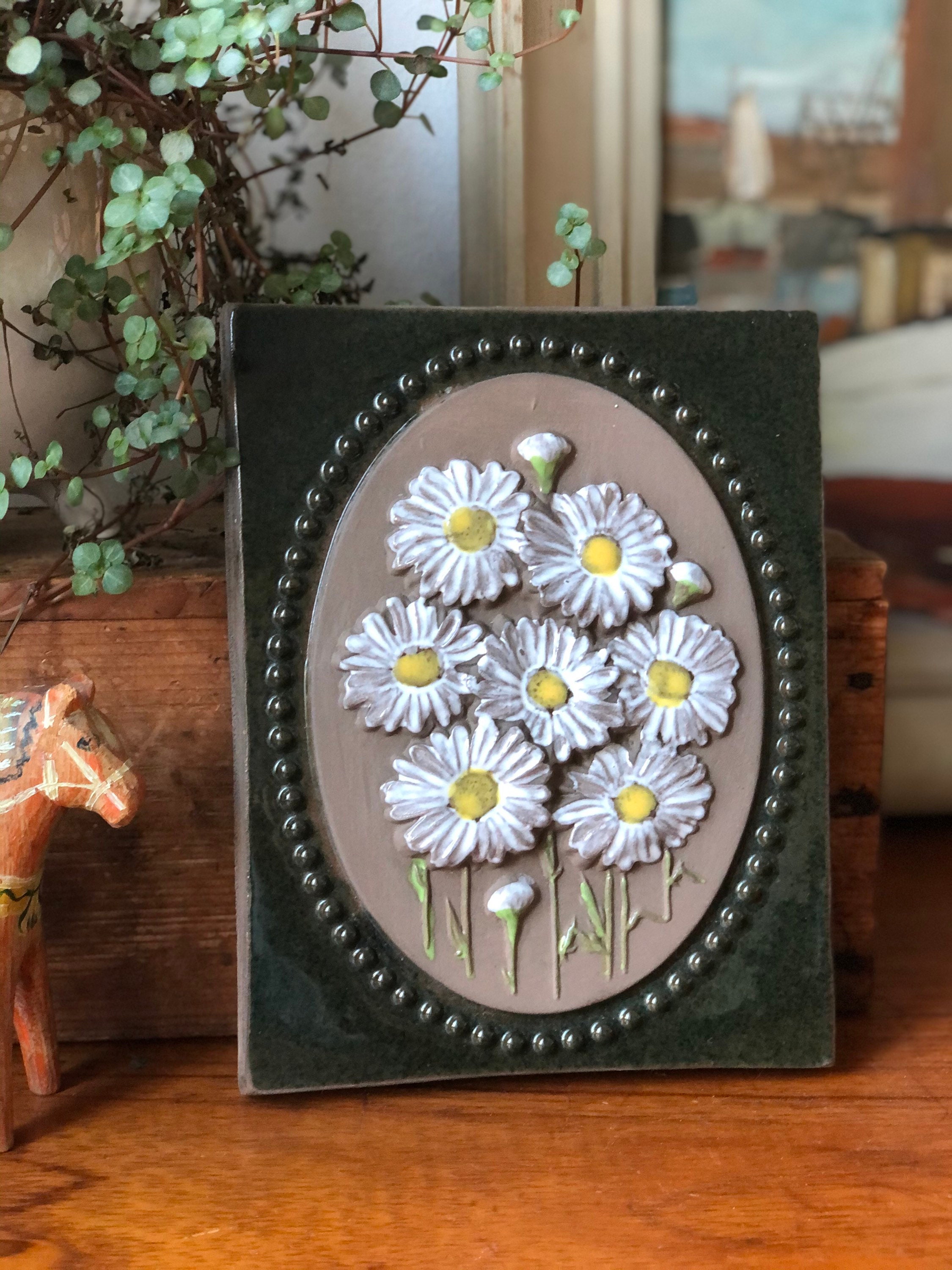 This is a ceramic wall art tile from JIE Sweden. It is Bright and vibrant with white, yellow, and green colors featuring Daisy flowers.